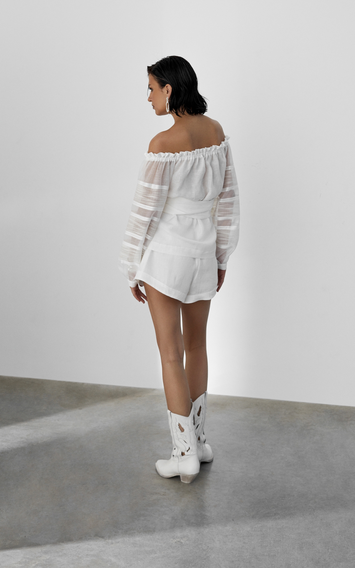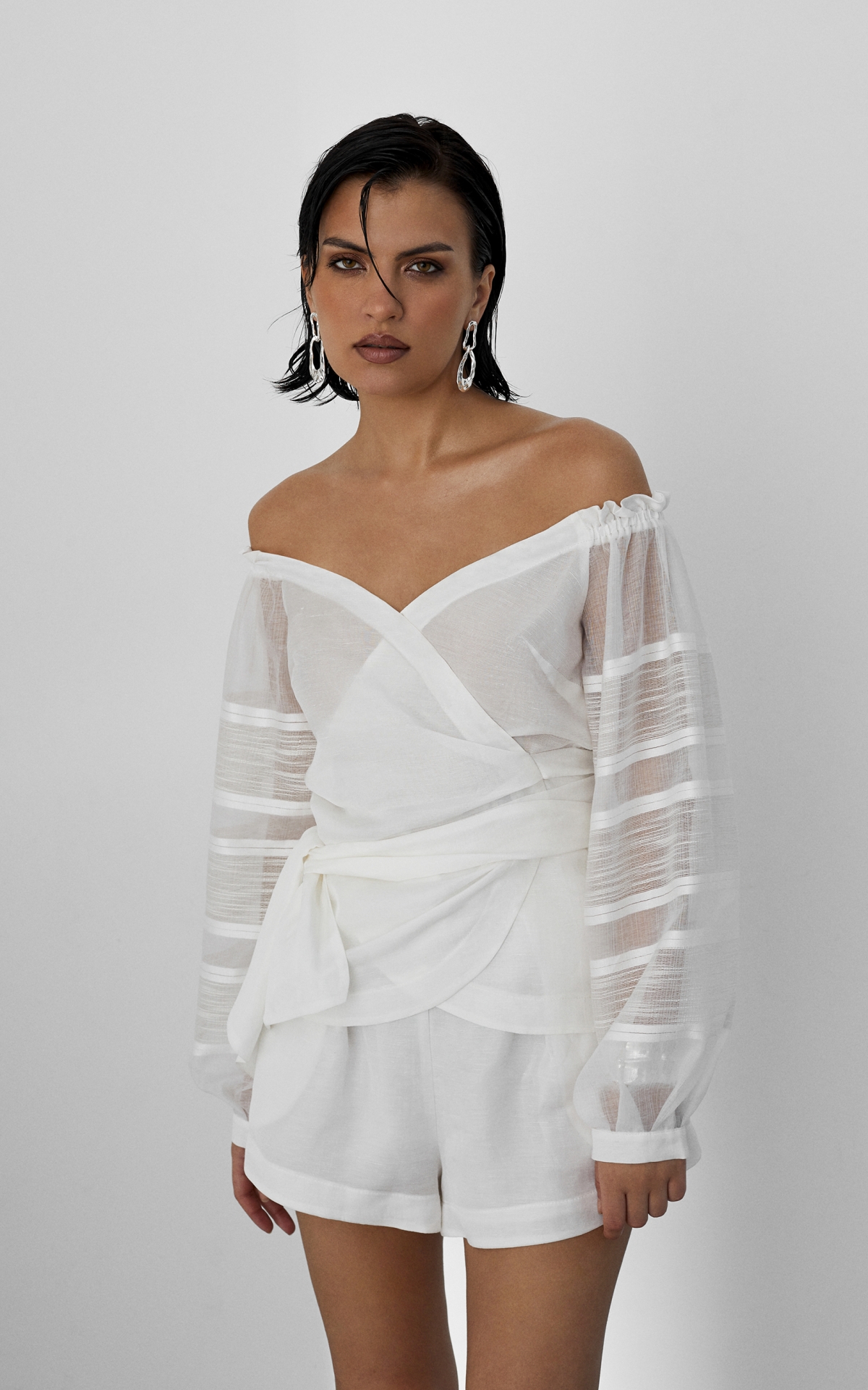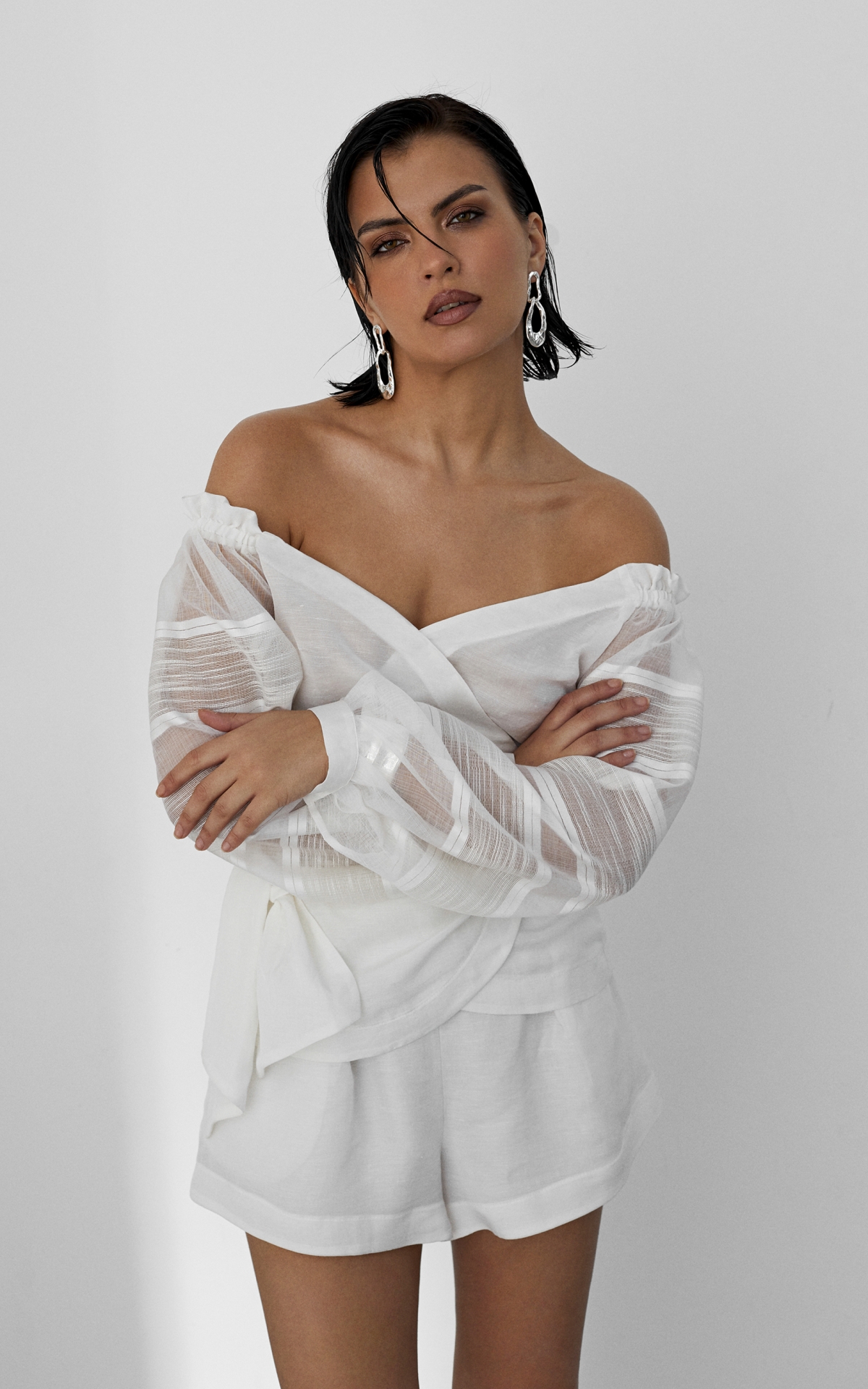 Романтичный сложносочиненный топ выполнен из тончайшего полупрозрачного испанского льна с меланжевым эффектом, который достигается благодаря утолщению волокон и природным узелкам. Фигурная линия декольте, открытая линия плеч и спущенные объемные рукава из невесомой органзы сочетают в себе нежную игривость и магическую женскую соблазнительность. Широкий пояс из основного полотна можно завязать объемным бантом спереди или продеть в отверстие в боковом шве и обмотать вокруг талии, формируя силуэт. Рекомендуем сочетать с шортами из этой капсулы