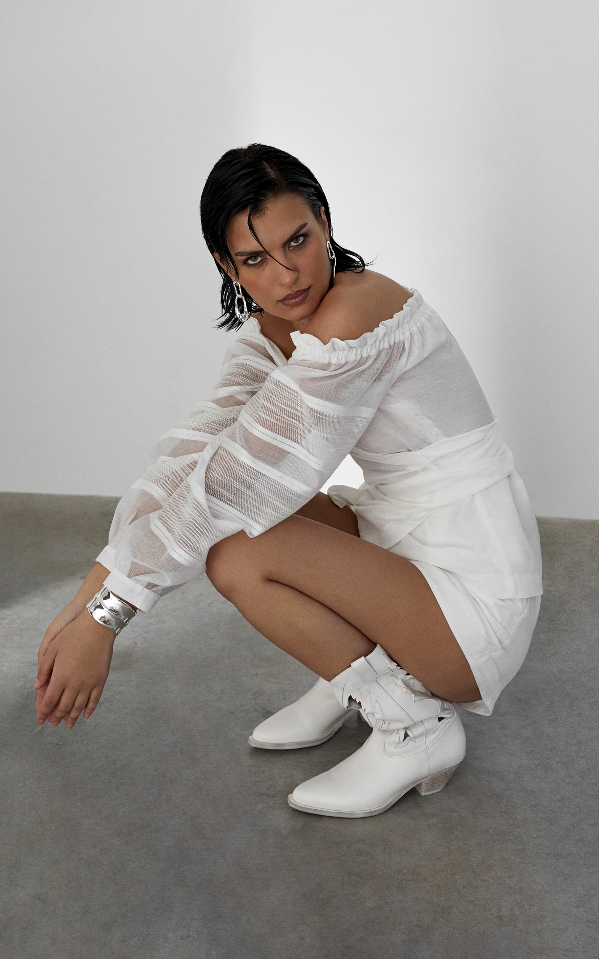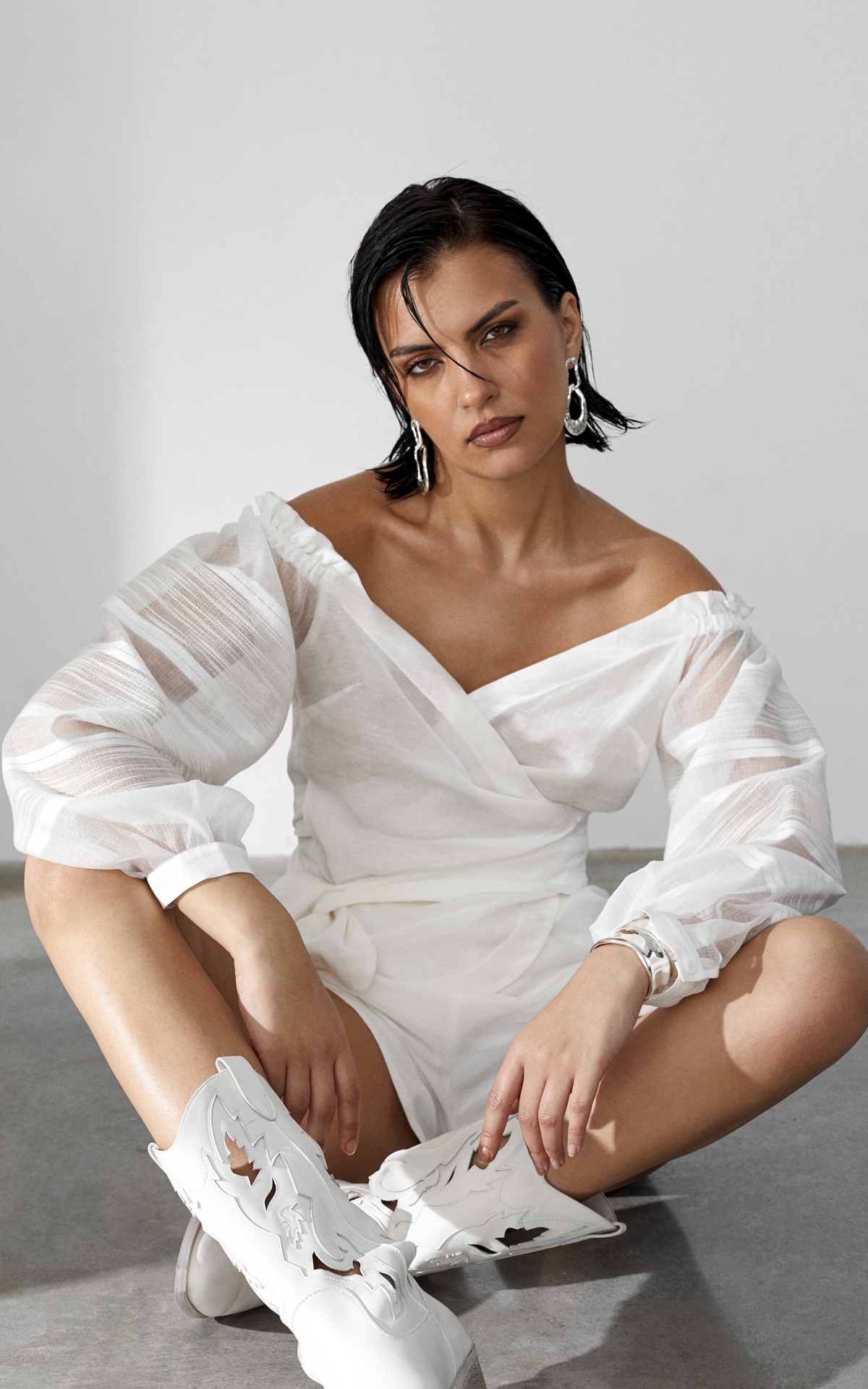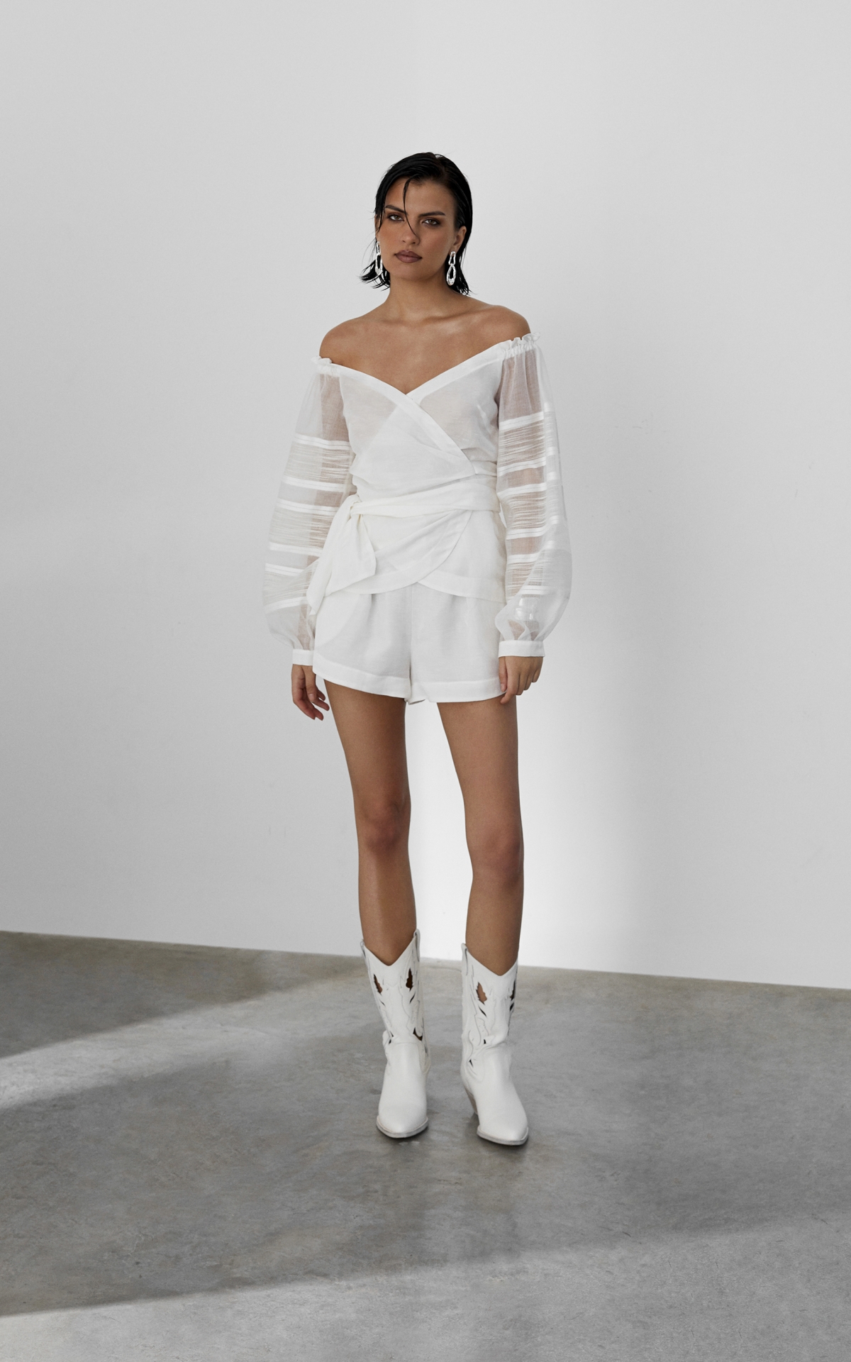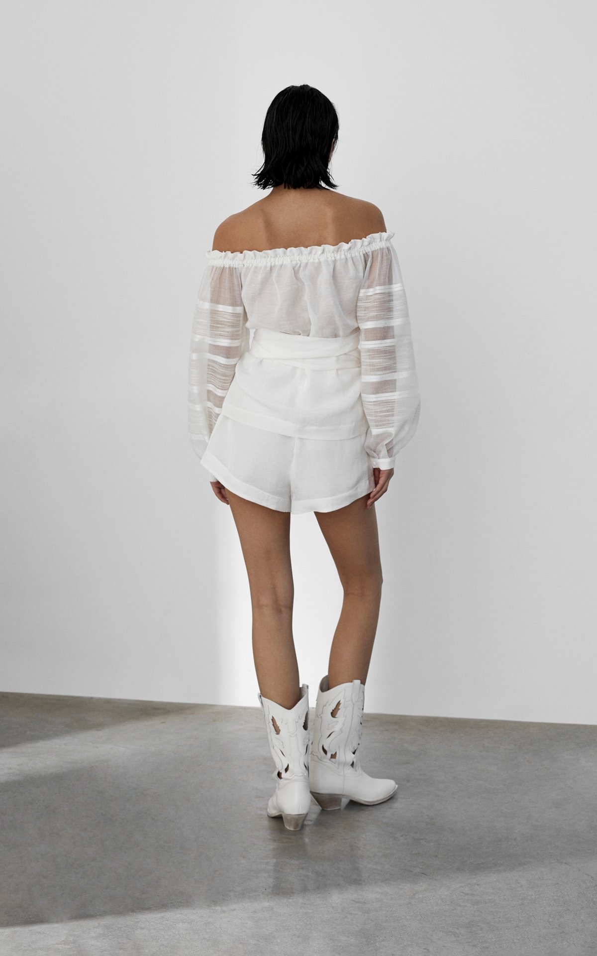 Романтичный сложносочиненный топ выполнен из тончайшего полупрозрачного испанского льна с меланжевым эффектом, который достигается благодаря утолщению волокон и природным узелкам. Фигурная линия декольте, открытая линия плеч и спущенные объемные рукава из невесомой органзы сочетают в себе нежную игривость и магическую женскую соблазнительность. Широкий пояс из основного полотна можно завязать объемным бантом спереди или продеть в отверстие в боковом шве и обмотать вокруг талии, формируя силуэт. Рекомендуем сочетать с шортами из этой капсулы