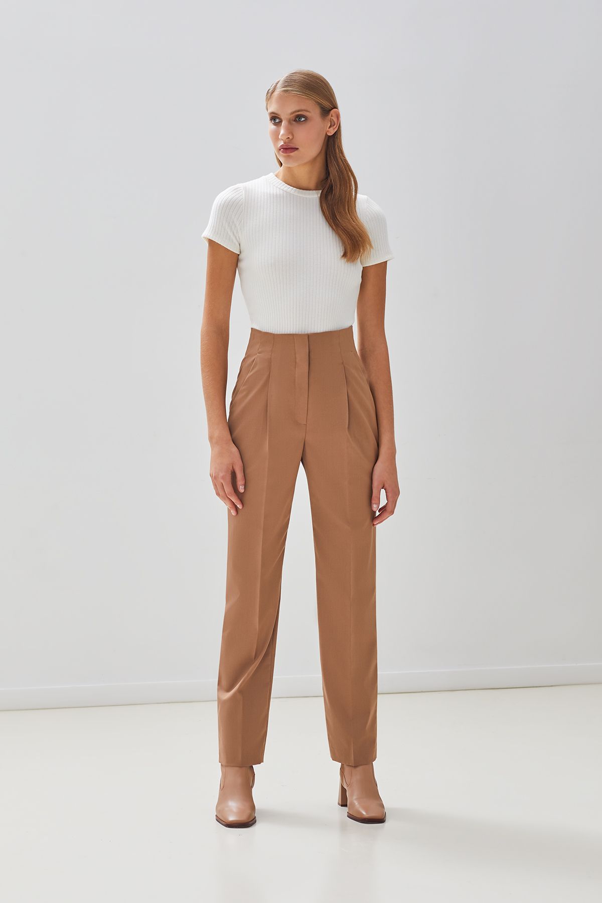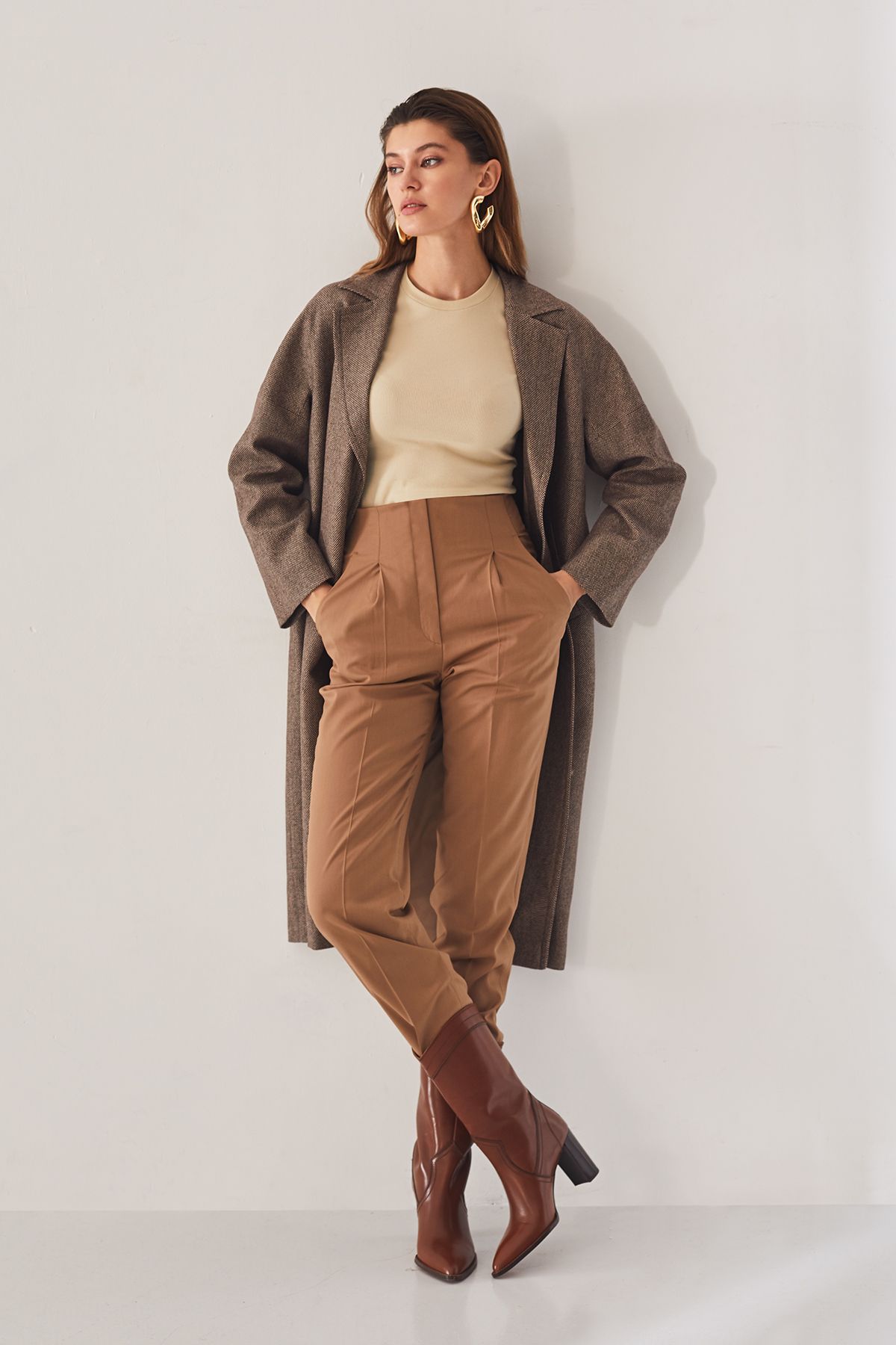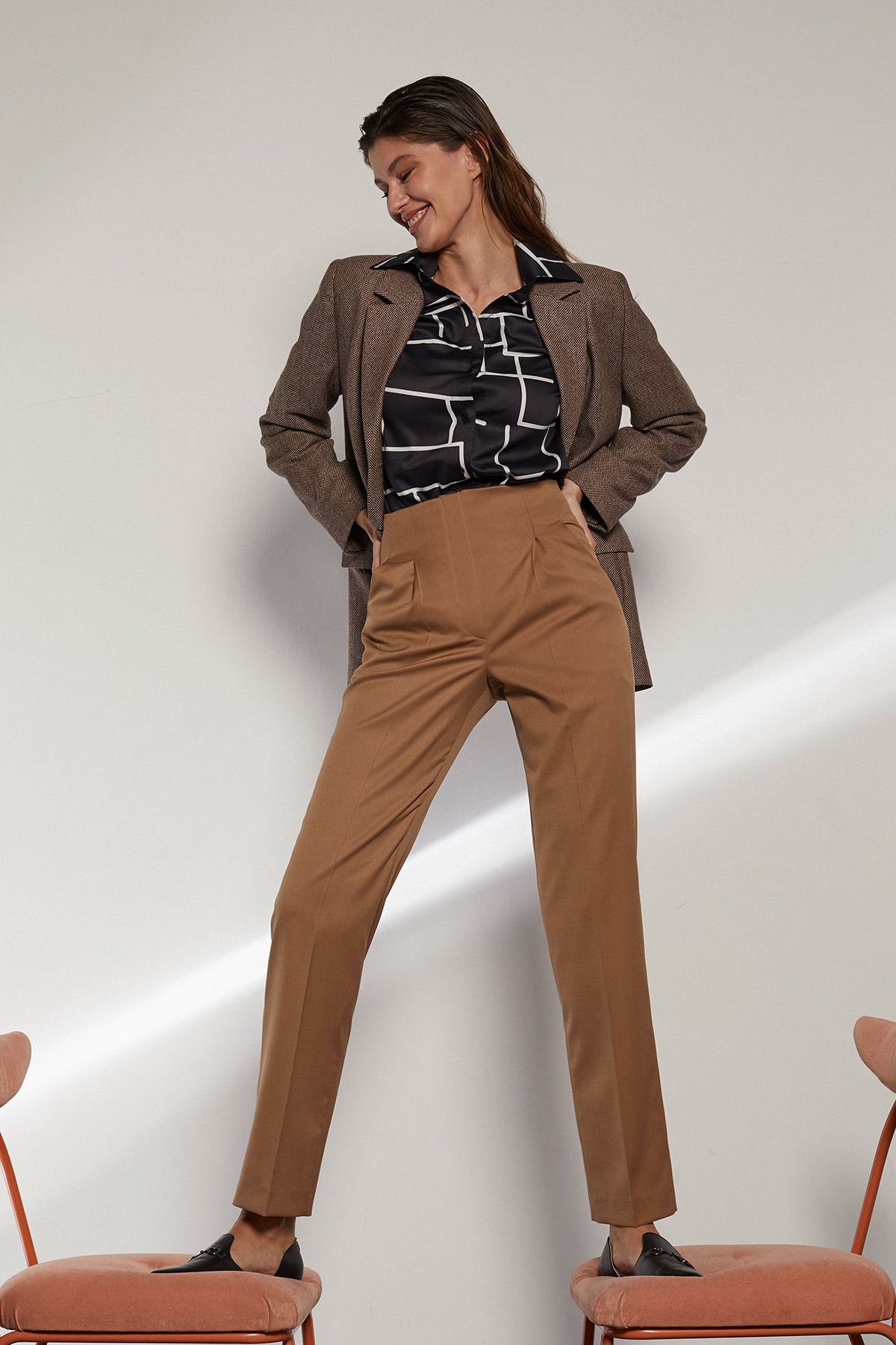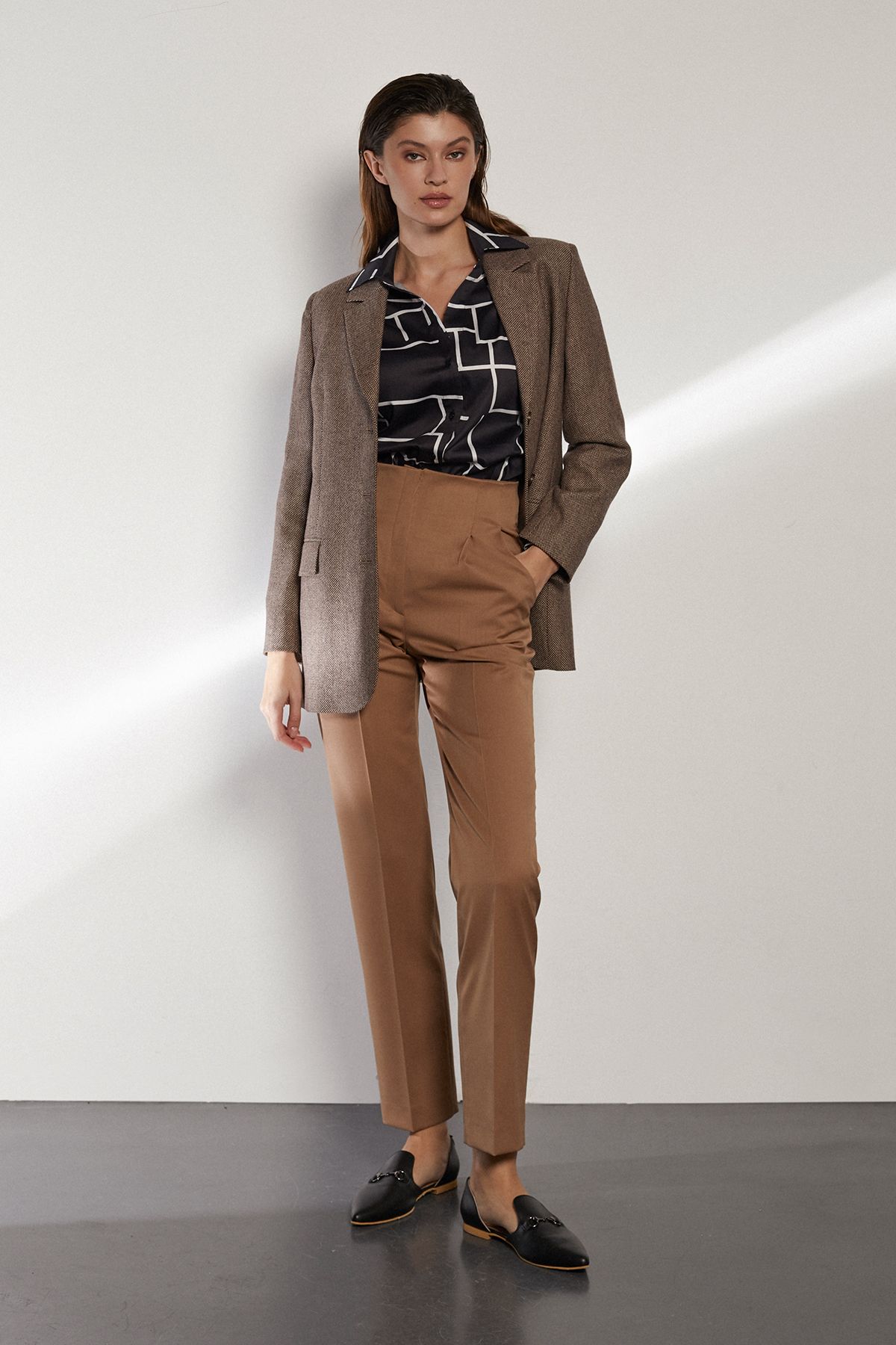 Брюки одинаково удачно подстроятся как под базовый свитер, так и под яркий топ или классическую блузу. Рекомендуем сочетать с футболкой цвета холодный бежевый и объемным жакетом из капсулы для создания гармоничного образа в коричневых оттенках.