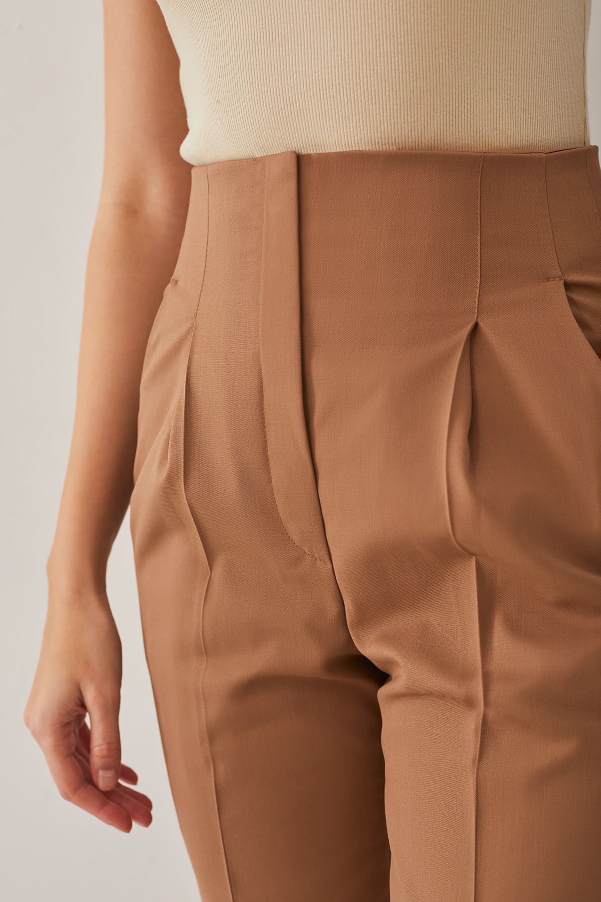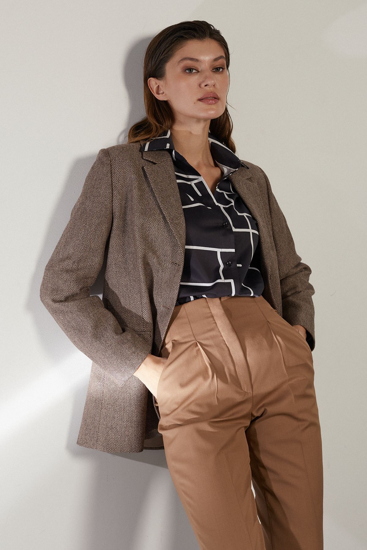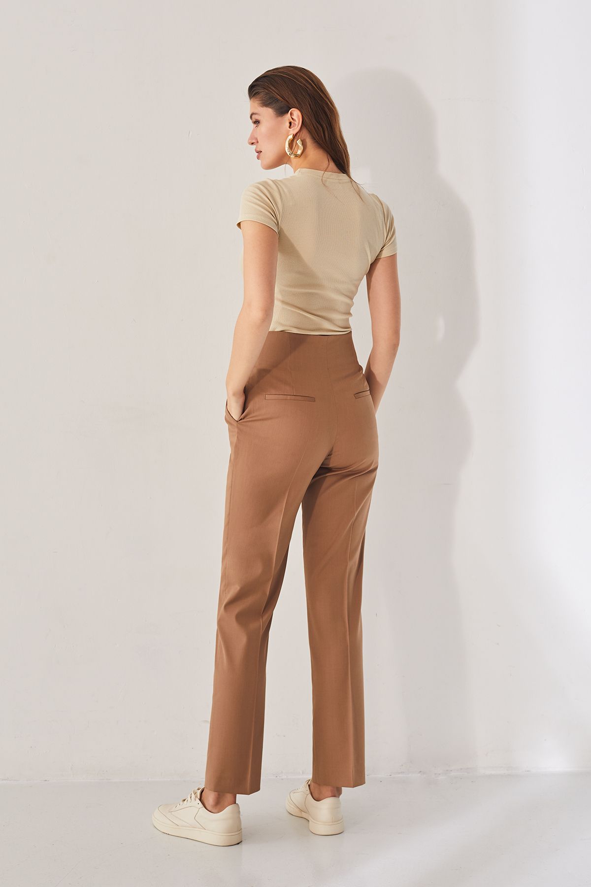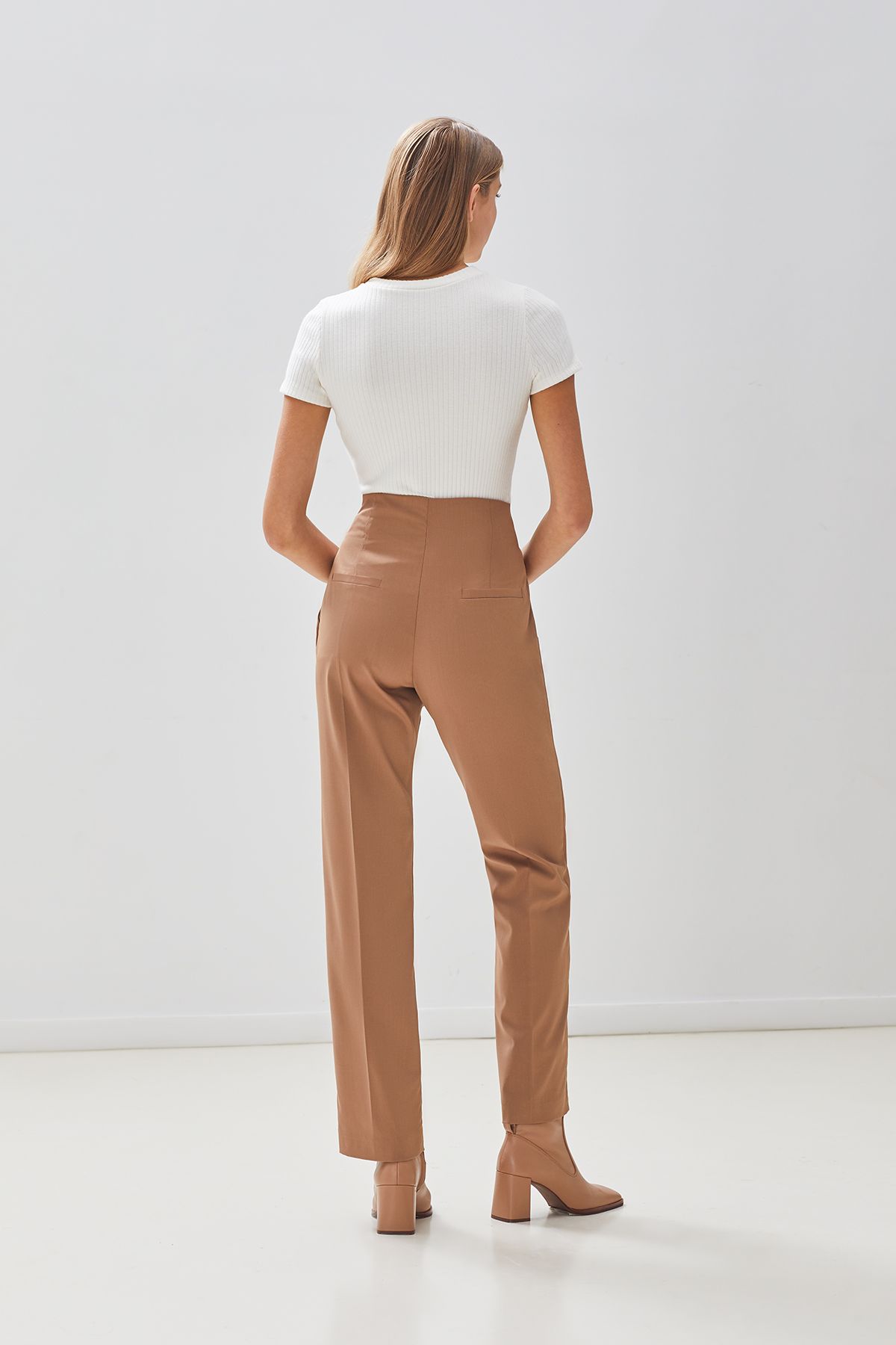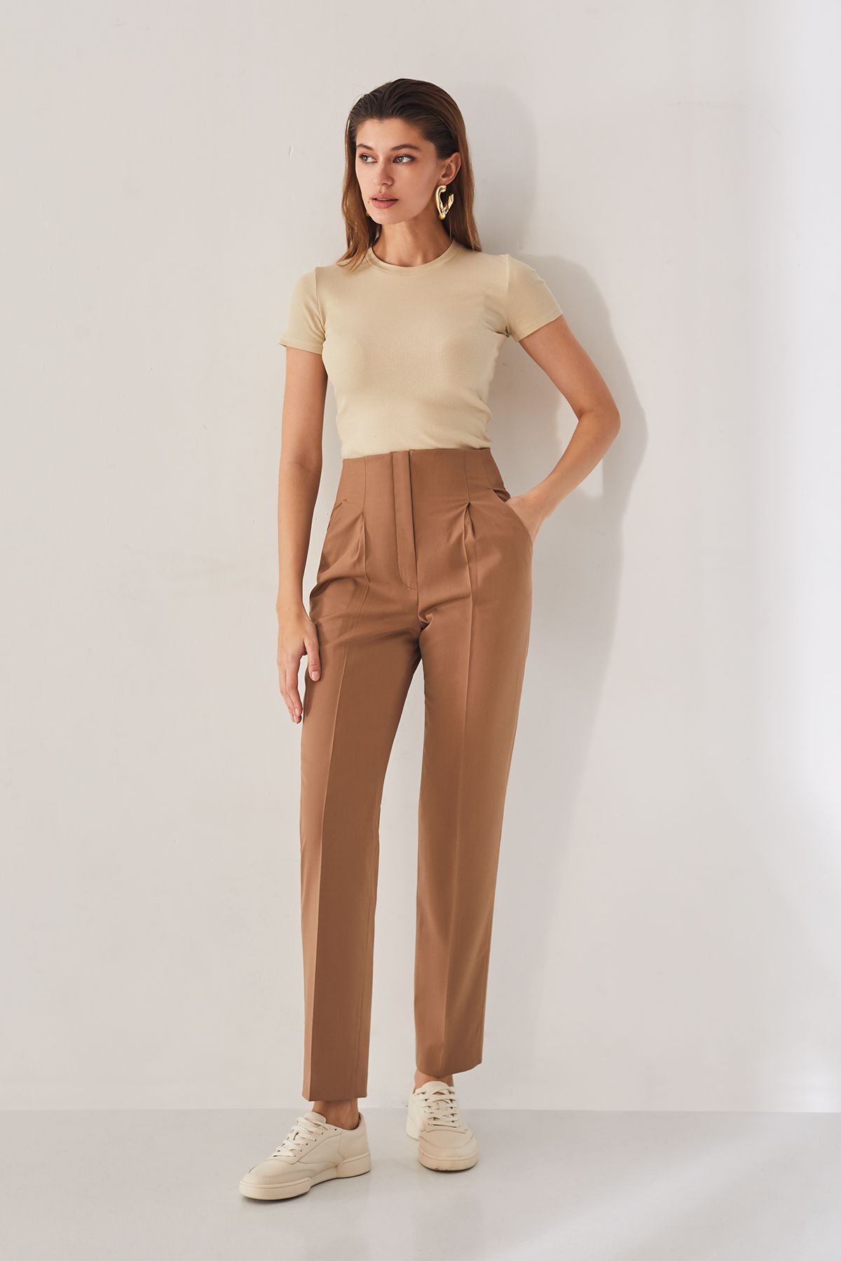 Брюки одинаково удачно подстроятся как под базовый свитер, так и под яркий топ или классическую блузу. Рекомендуем сочетать с футболкой цвета холодный бежевый и объемным жакетом из капсулы для создания гармоничного образа в коричневых оттенках.