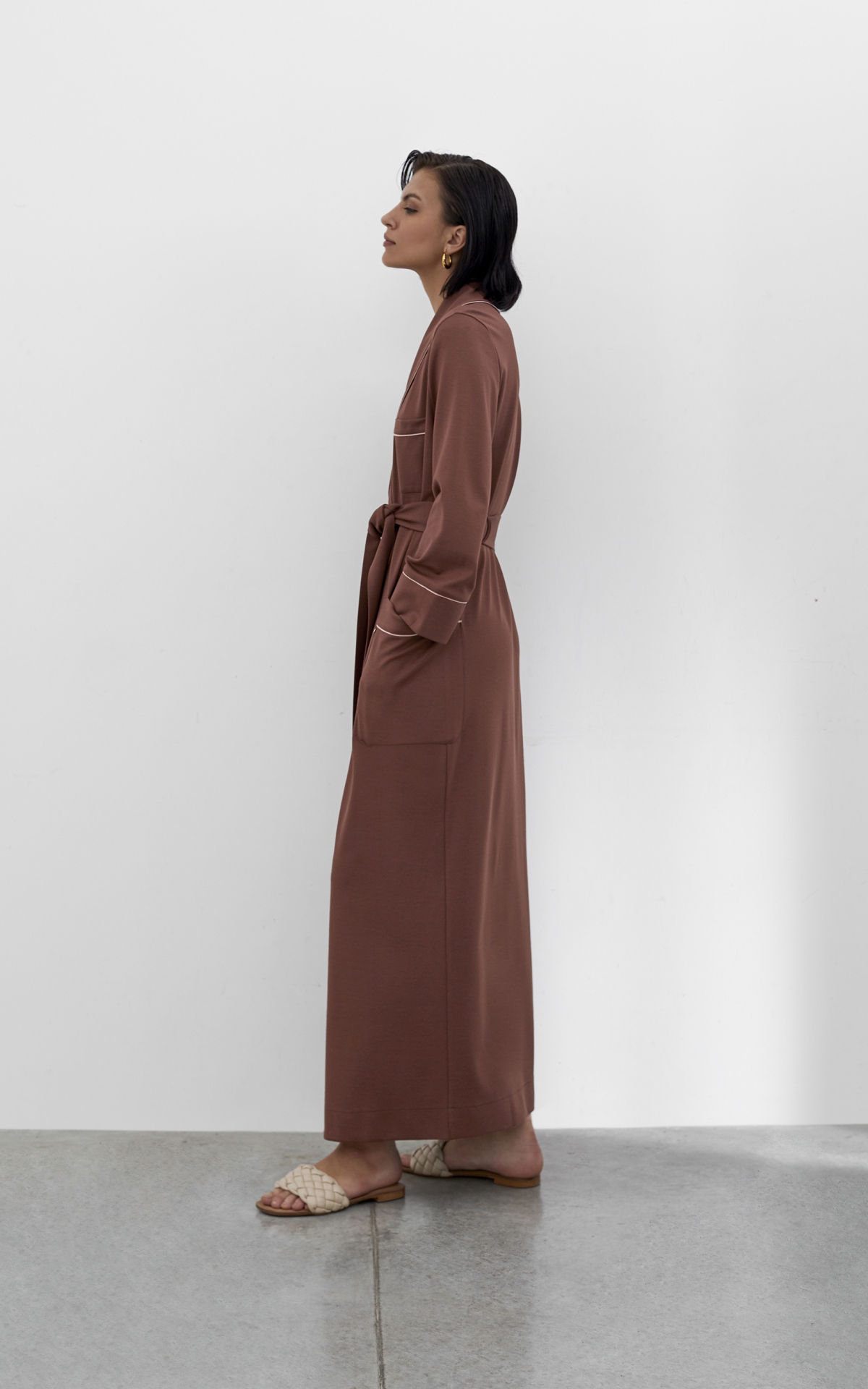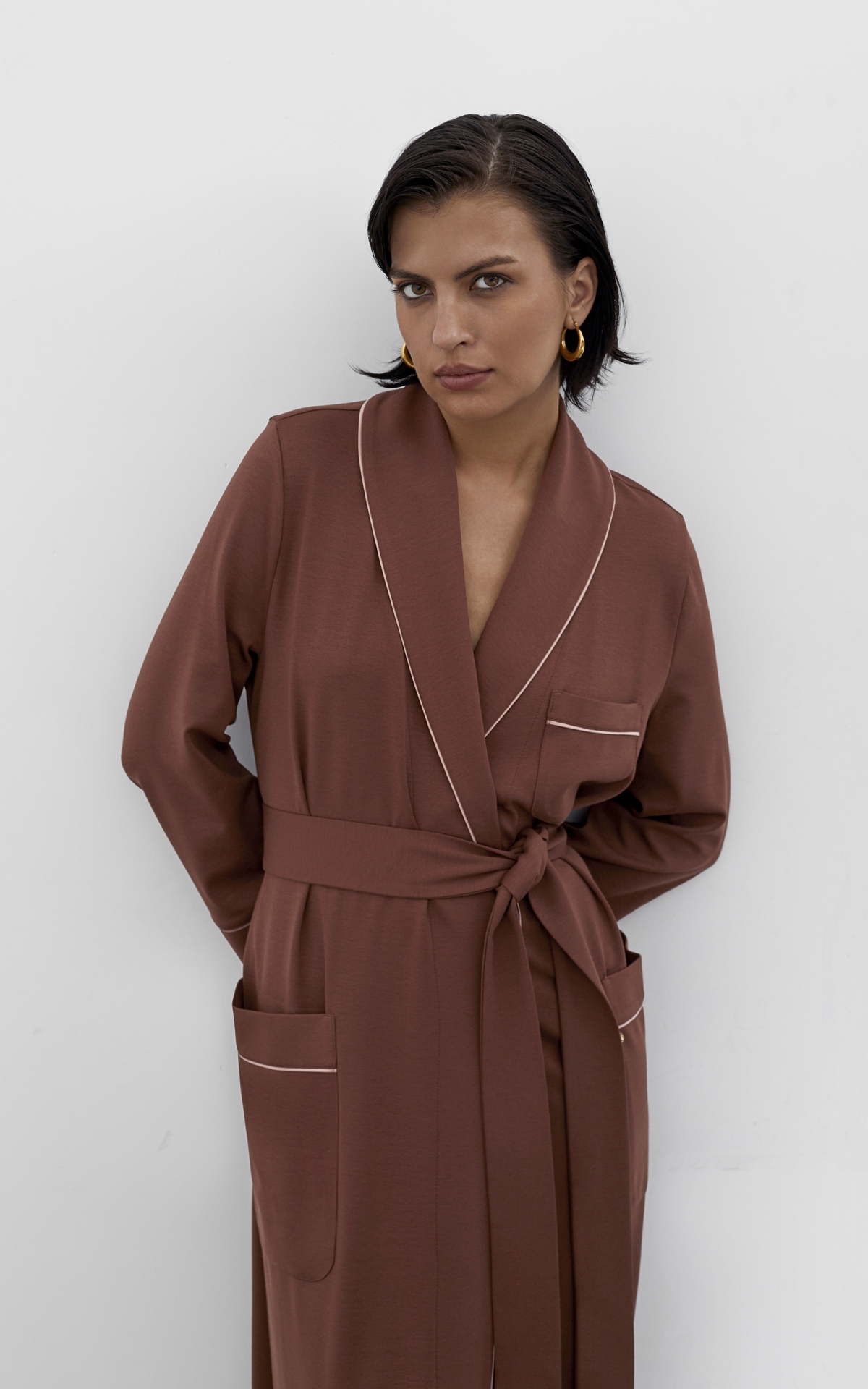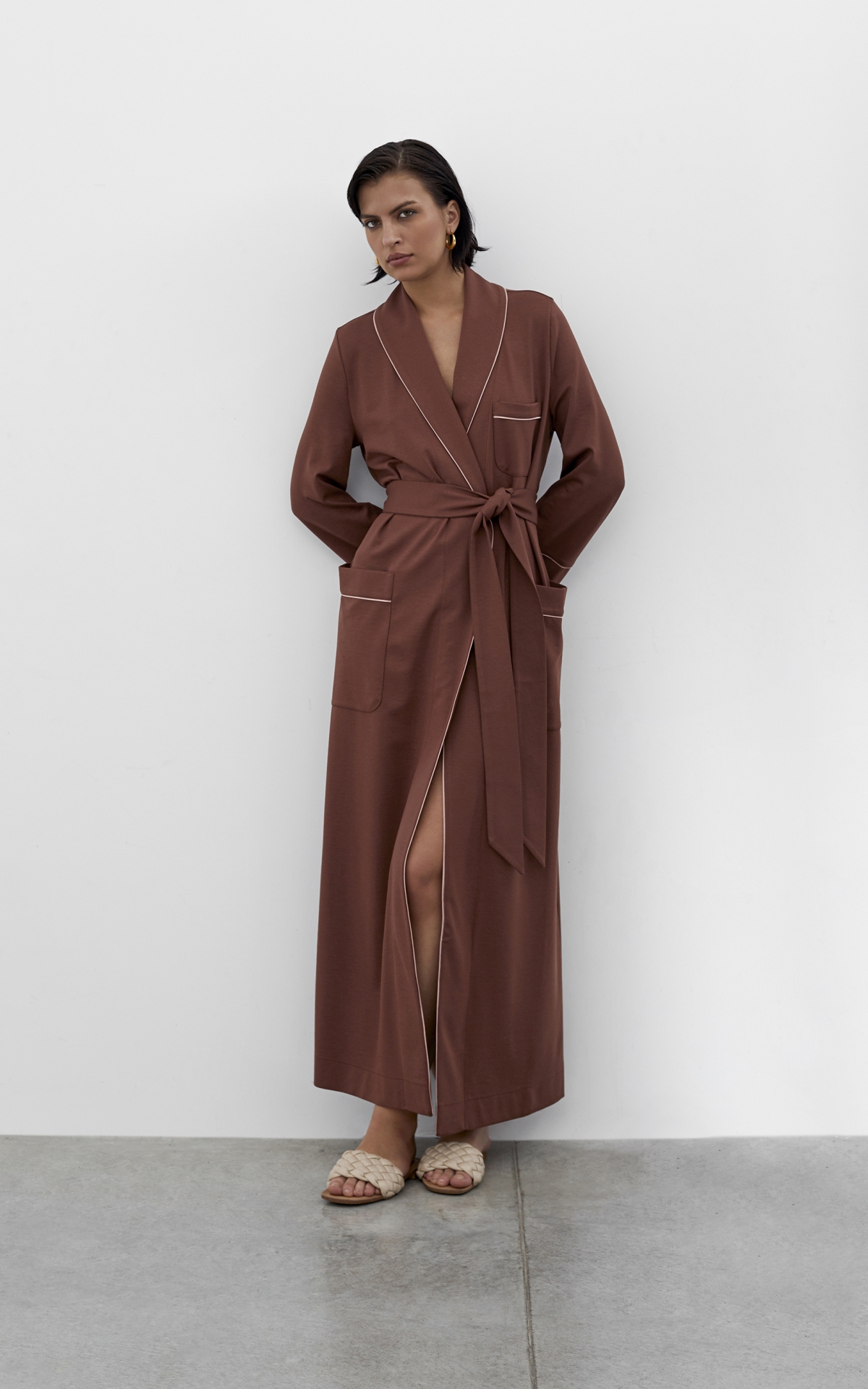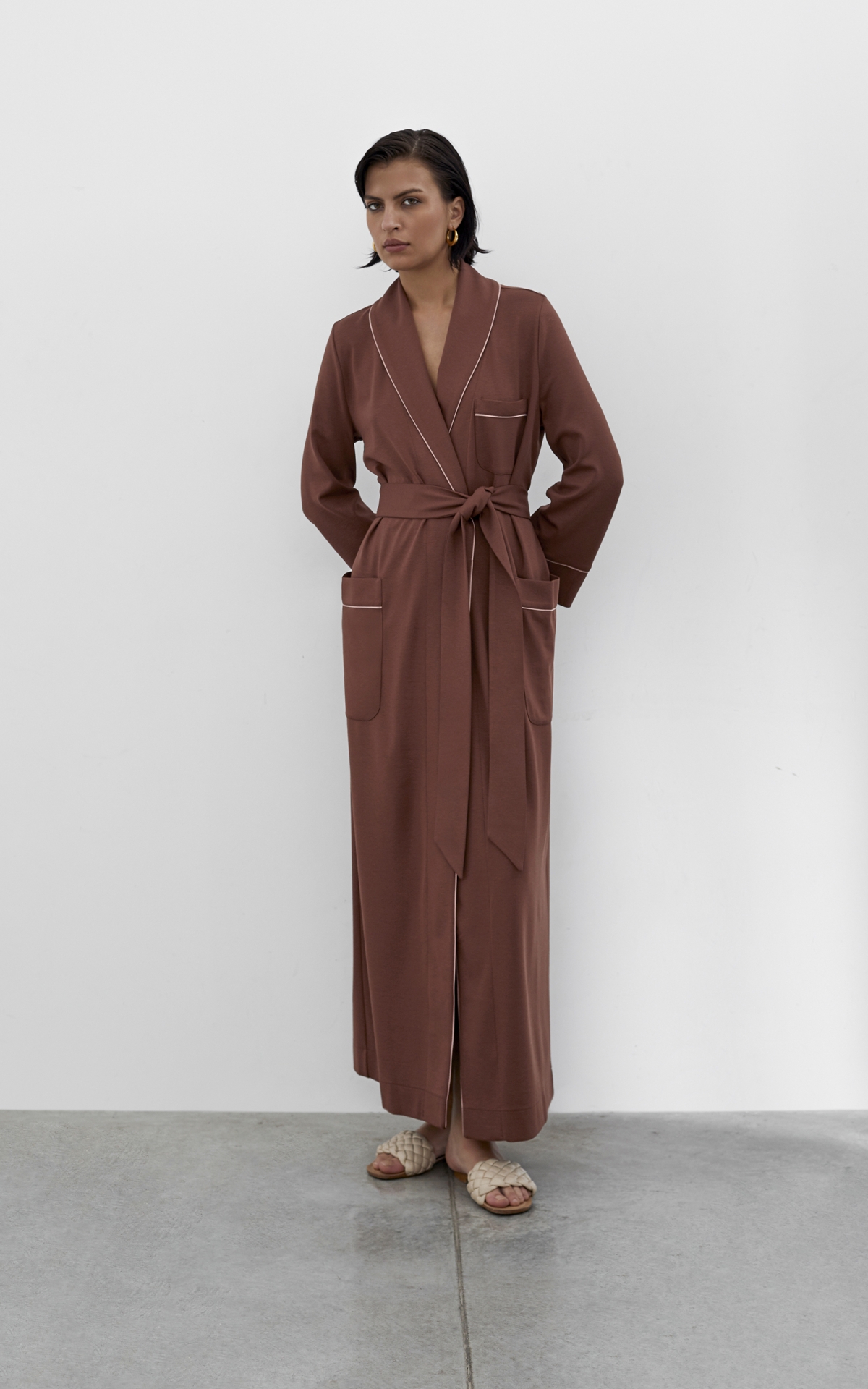 Эстетика халата в стиле old money противопоставляется быстрой моде, подчеркивая главные черты стиля - утонченность, элегантность и комфорт. Для создания лаконичного халата в пол на запахе было выбрано плотное вискозное полотно с гладким плетением, которое отлично держит форму и придает изделию особый статусный вид. Сдержанный цвет подчеркивается строгими геометричными формами - акцентными шалевыми лацканами, широкими манжетами, гипертрофированно увеличенными карманами и тонкими атласными кантами. Широкий пояс-лента из основного полотна подчеркивает силуэт, акцентирует талию и регулирует глубину запаха