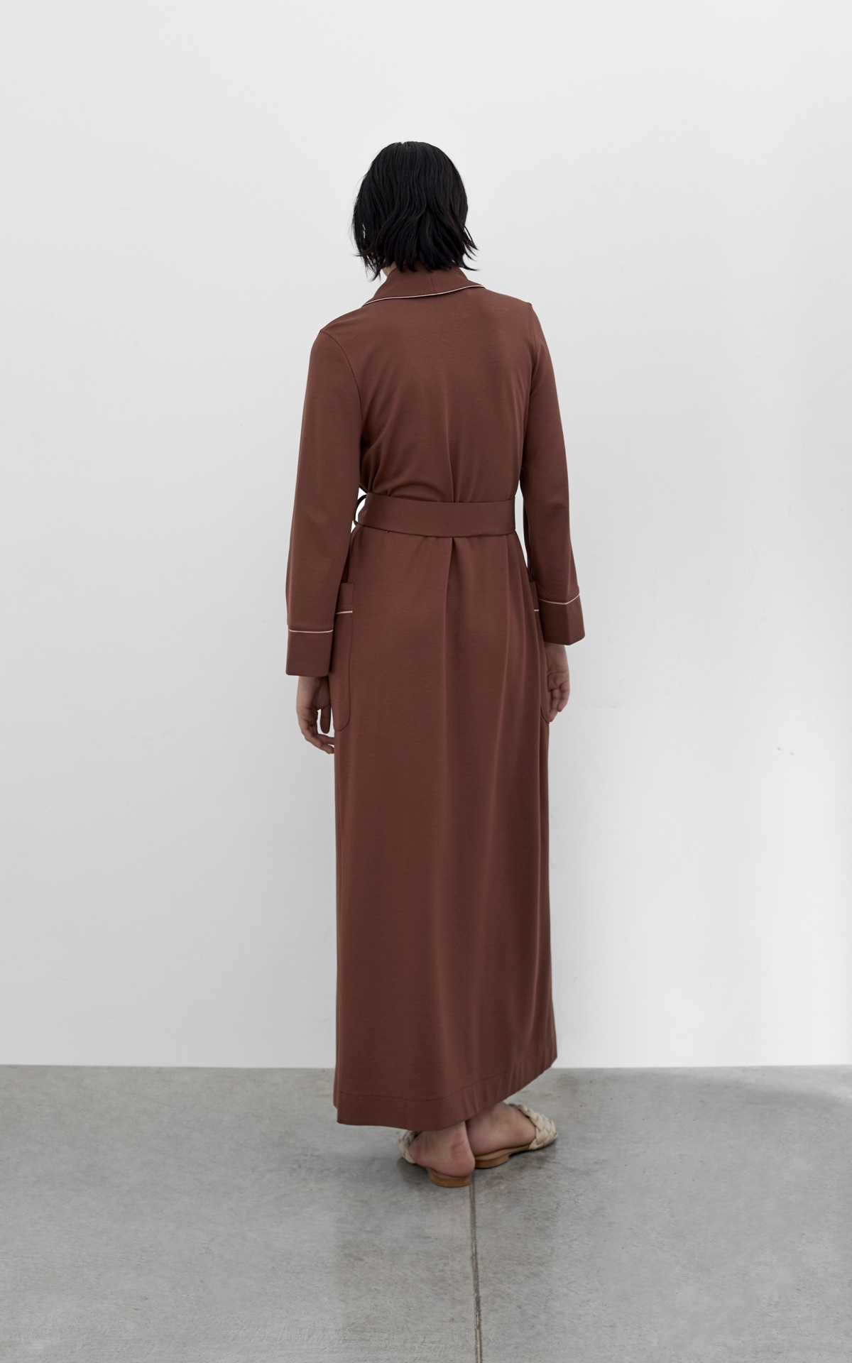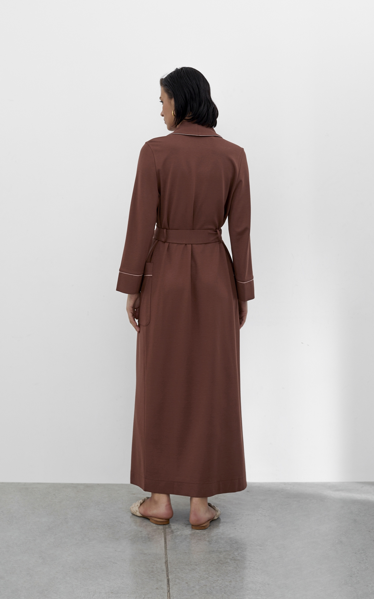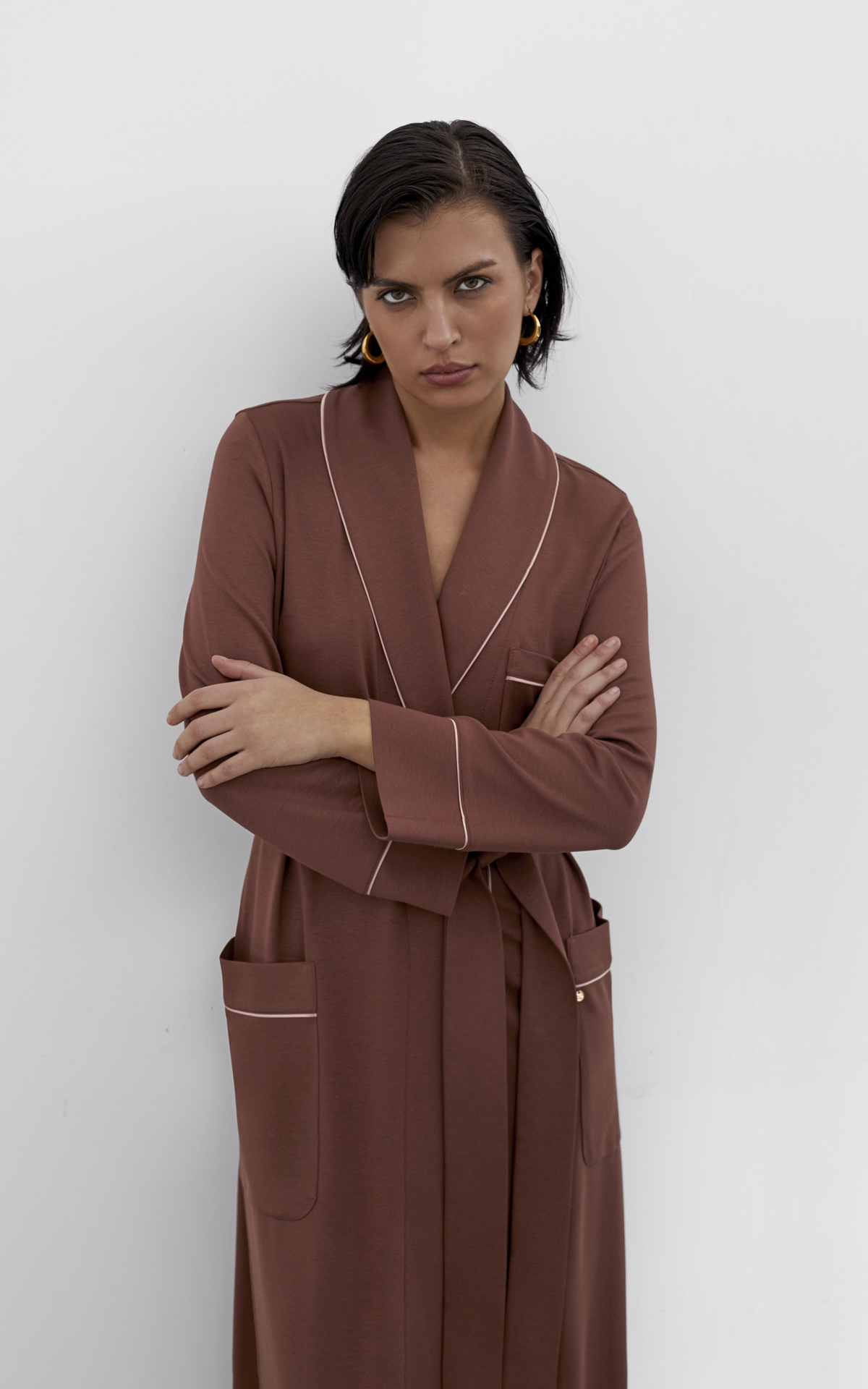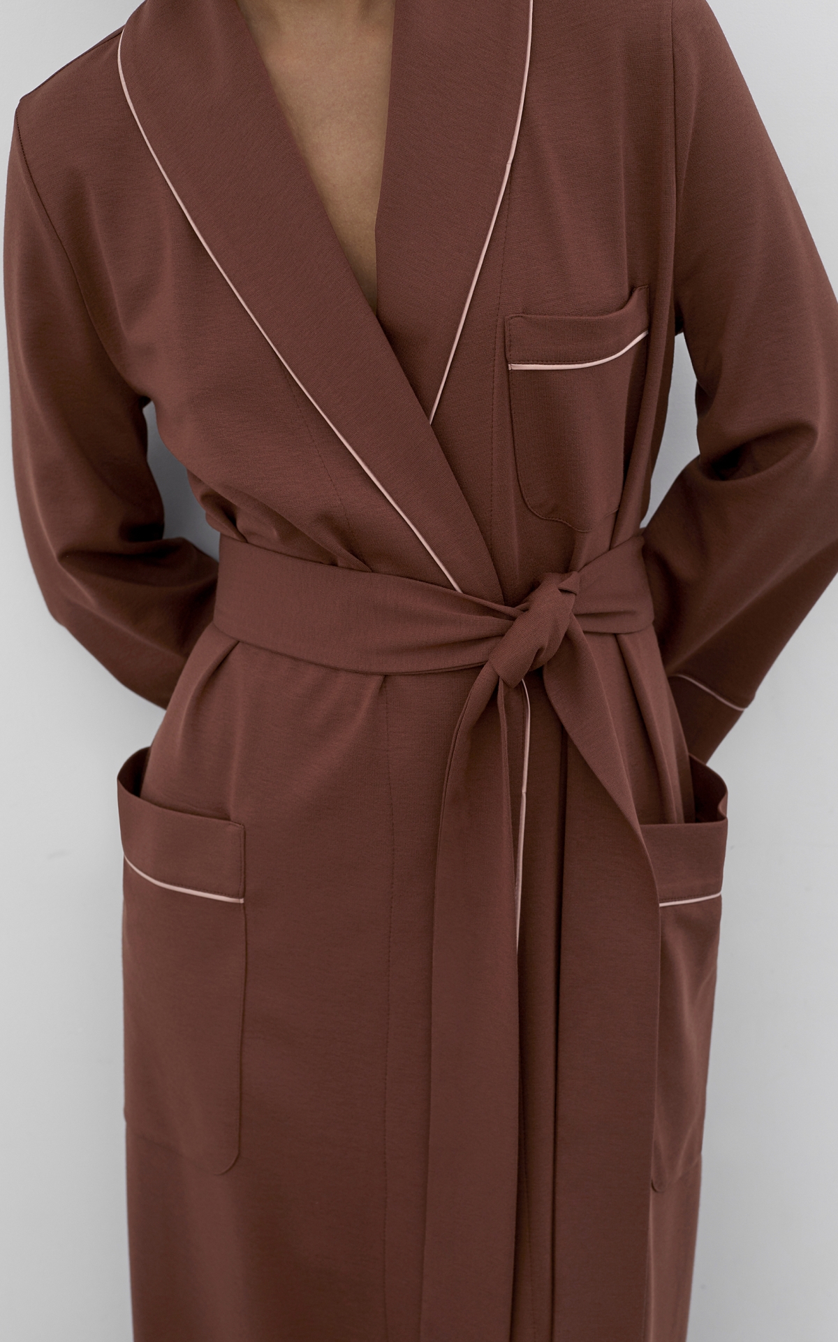 Эстетика халата в стиле old money противопоставляется быстрой моде, подчеркивая главные черты стиля - утонченность, элегантность и комфорт. Для создания лаконичного халата в пол на запахе было выбрано плотное вискозное полотно с гладким плетением, которое отлично держит форму и придает изделию особый статусный вид. Сдержанный цвет подчеркивается строгими геометричными формами - акцентными шалевыми лацканами, широкими манжетами, гипертрофированно увеличенными карманами и тонкими атласными кантами. Широкий пояс-лента из основного полотна подчеркивает силуэт, акцентирует талию и регулирует глубину запаха