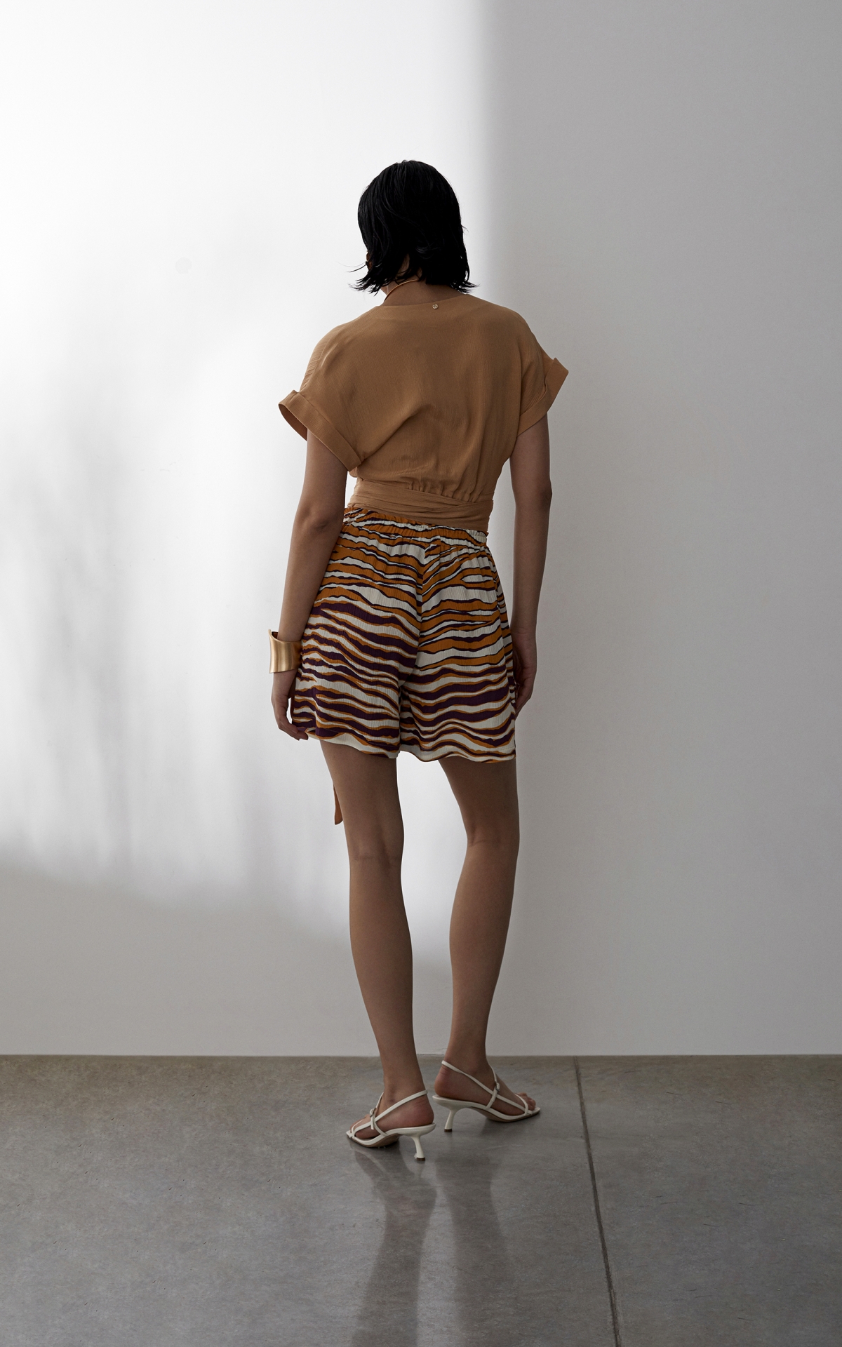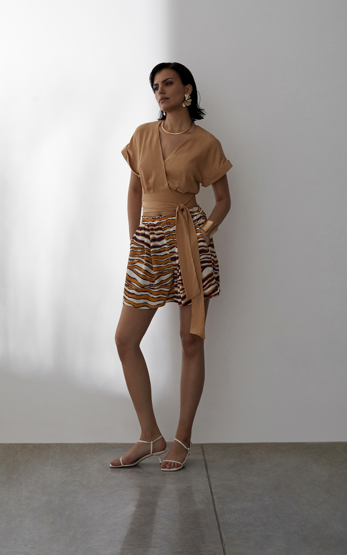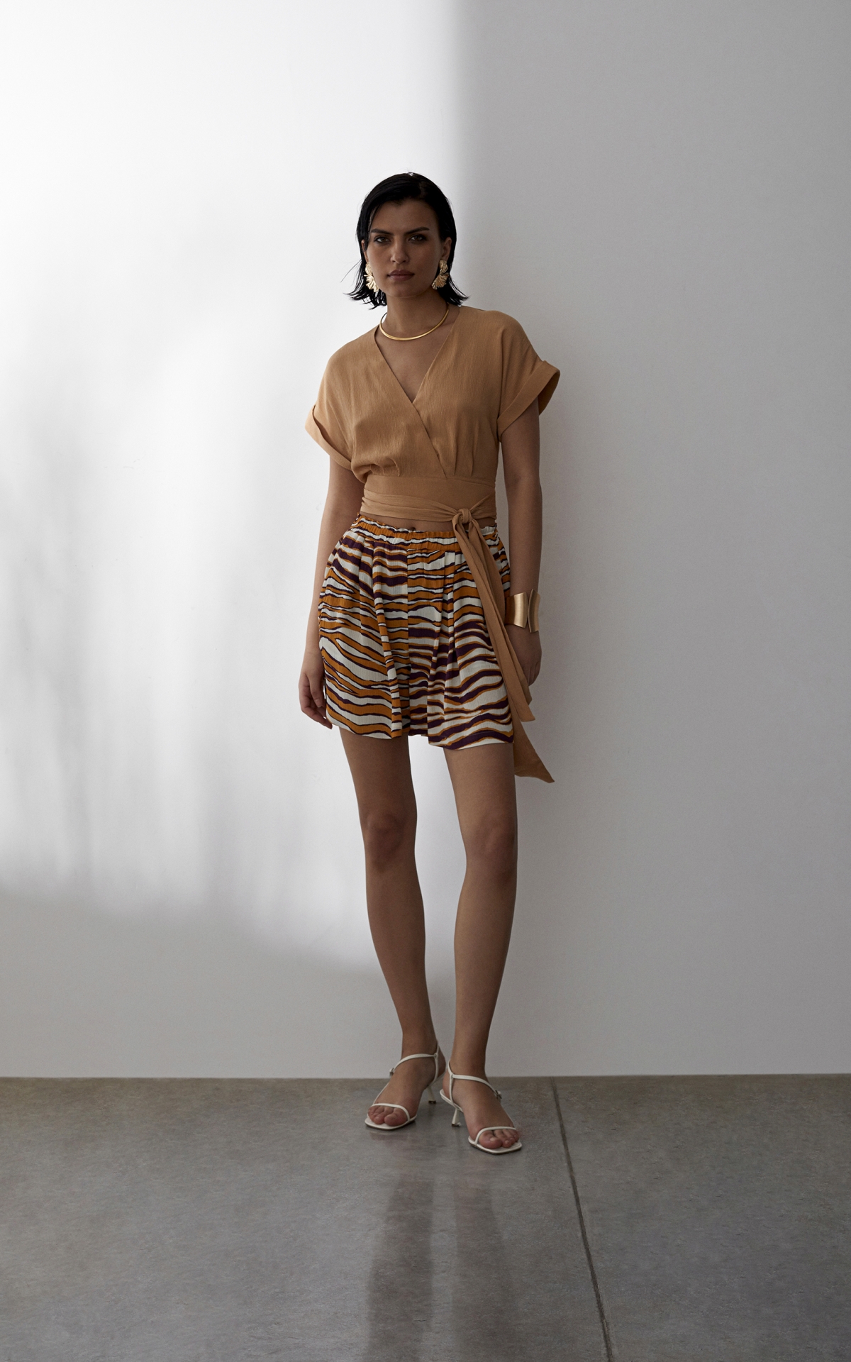 Воздушные шорты расклешенного силуэта выполнены из струящегося вискозного крепа с фактурным муаровым мотивом. Такое полотно отличается долговечностью, формоустойчивостью и уникальными дышащими свойствами - материал отлично впитывает влагу, обеспечивает хорошую циркуляцию и сохраняет оптимальный для тела микроклимат. Анималистичный тропический оранжево-бордовый принт, словно сошедший с диких джунглей, оживит не только отпускной, но и городской гардероб. Шорты дополнены двумя боковыми карманами и широким поясом на эластичной резинке с завязками для комфортной посадки по фигуре. Глубокие складки по передним деталям и мягкие сборки по спинке добавляют легкости и воздушности. Рекомендуем сочетать с топом на запах в белоснежном или песочном оттенке из капсулы
