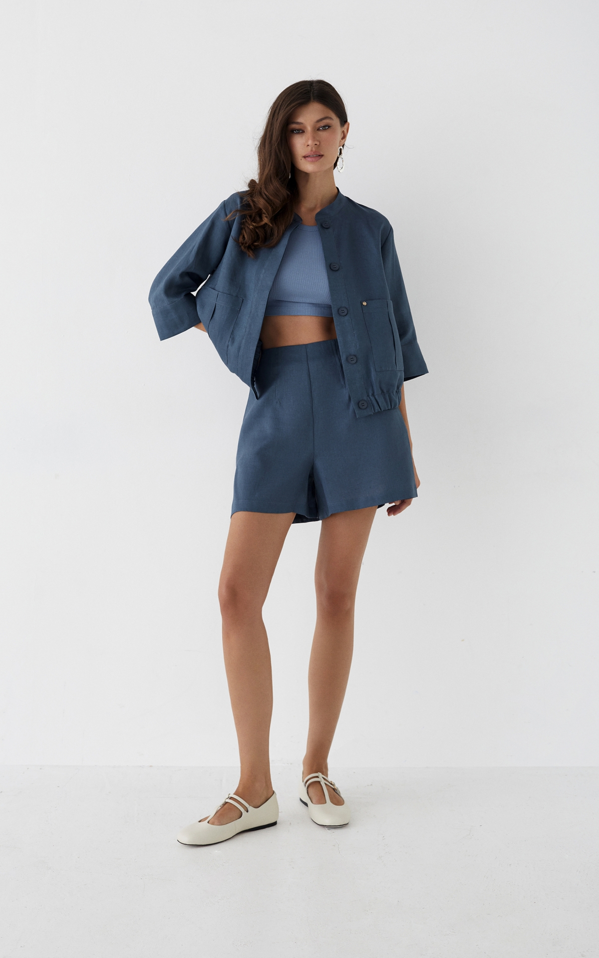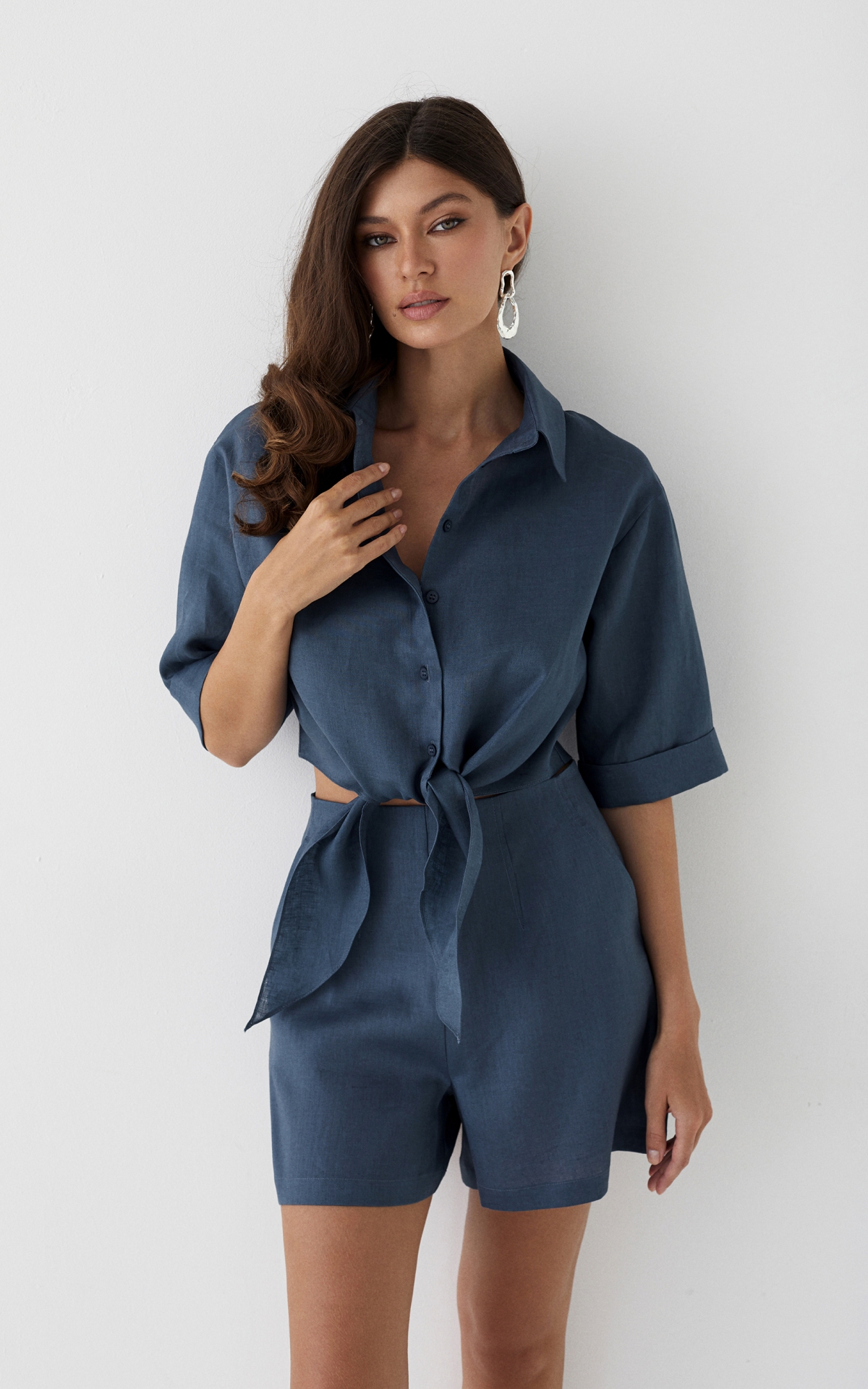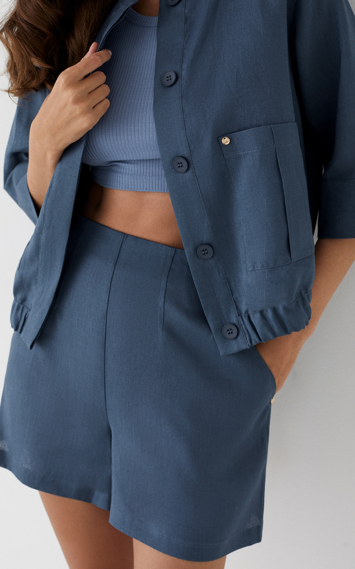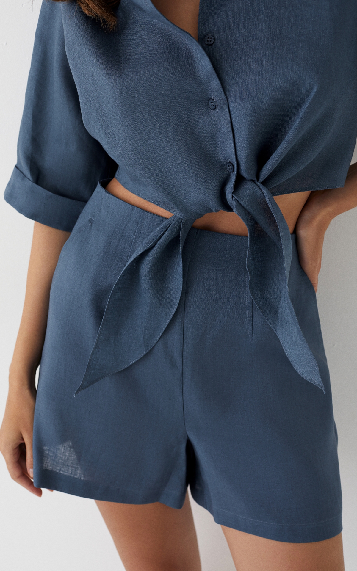 В легких шортах пыльно-бирюзового цвета будет комфортно даже в самую жаркую погоду. Мы выполнили их из 100% дышащего невесомого льна, который отлично пропускает воздух и слегка охлаждает кожу, мягко драпируется и создает красивый эффект переливов на солнце. Прямой, слегка расклешенный силуэт с двумя боковыми прорезными карманами отвечают за комфорт и универсальность, а скульптурные вытачки за идеальную посадку по фигуре. Рекомендуем сочетать с топом или рубашкой из льняной капсулы для более формального образа или стилизовать для прогулки вдоль морского побережья.