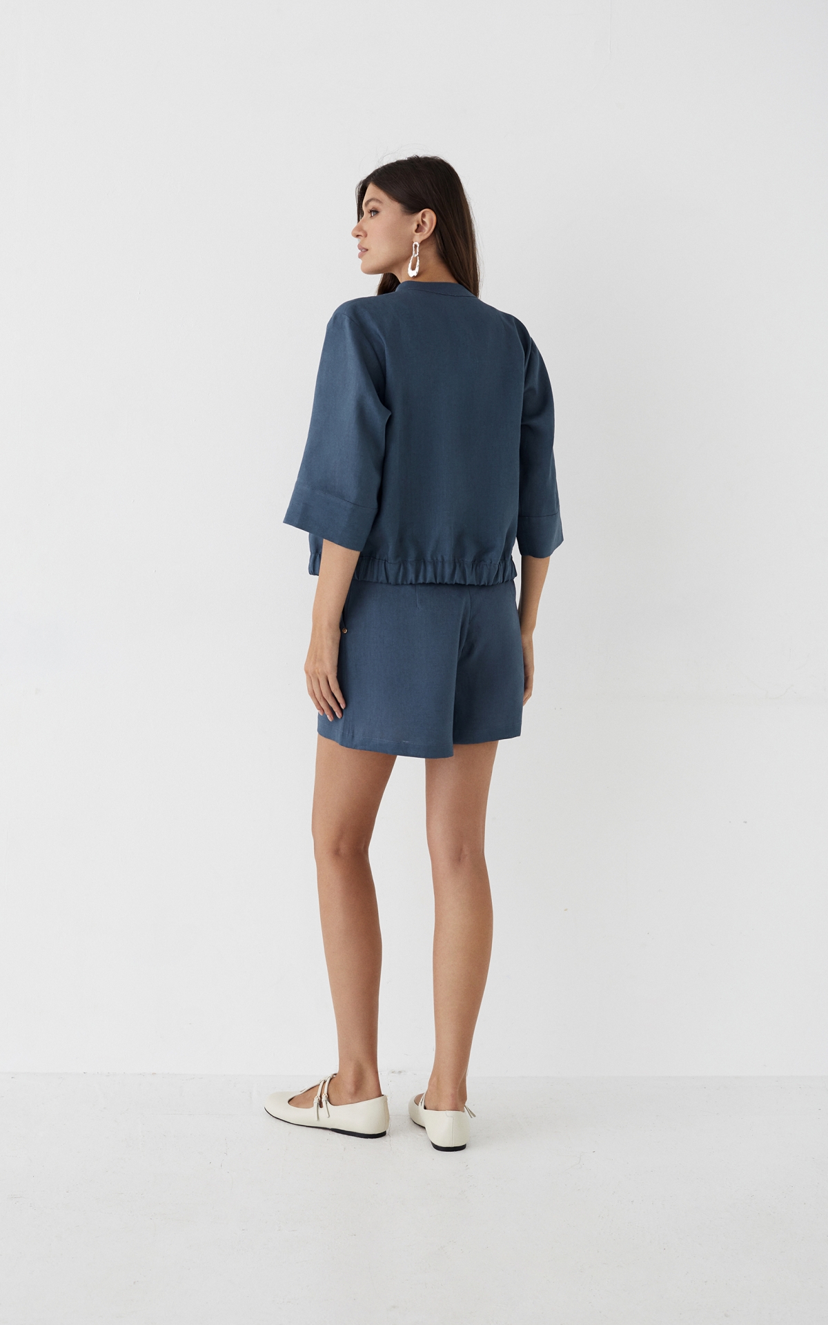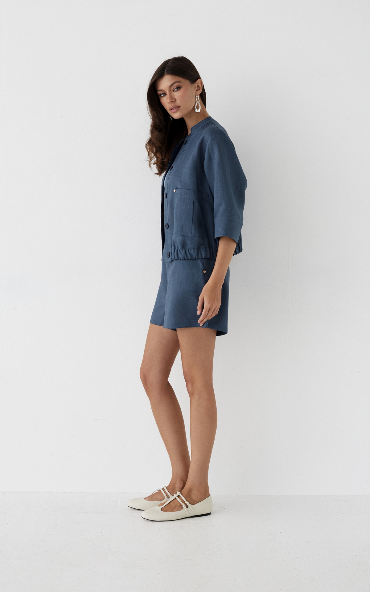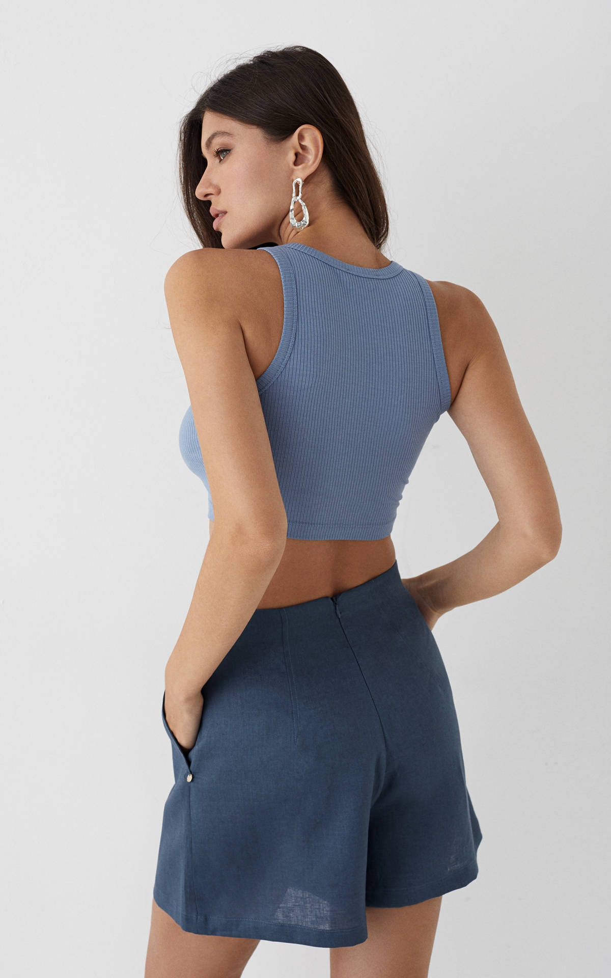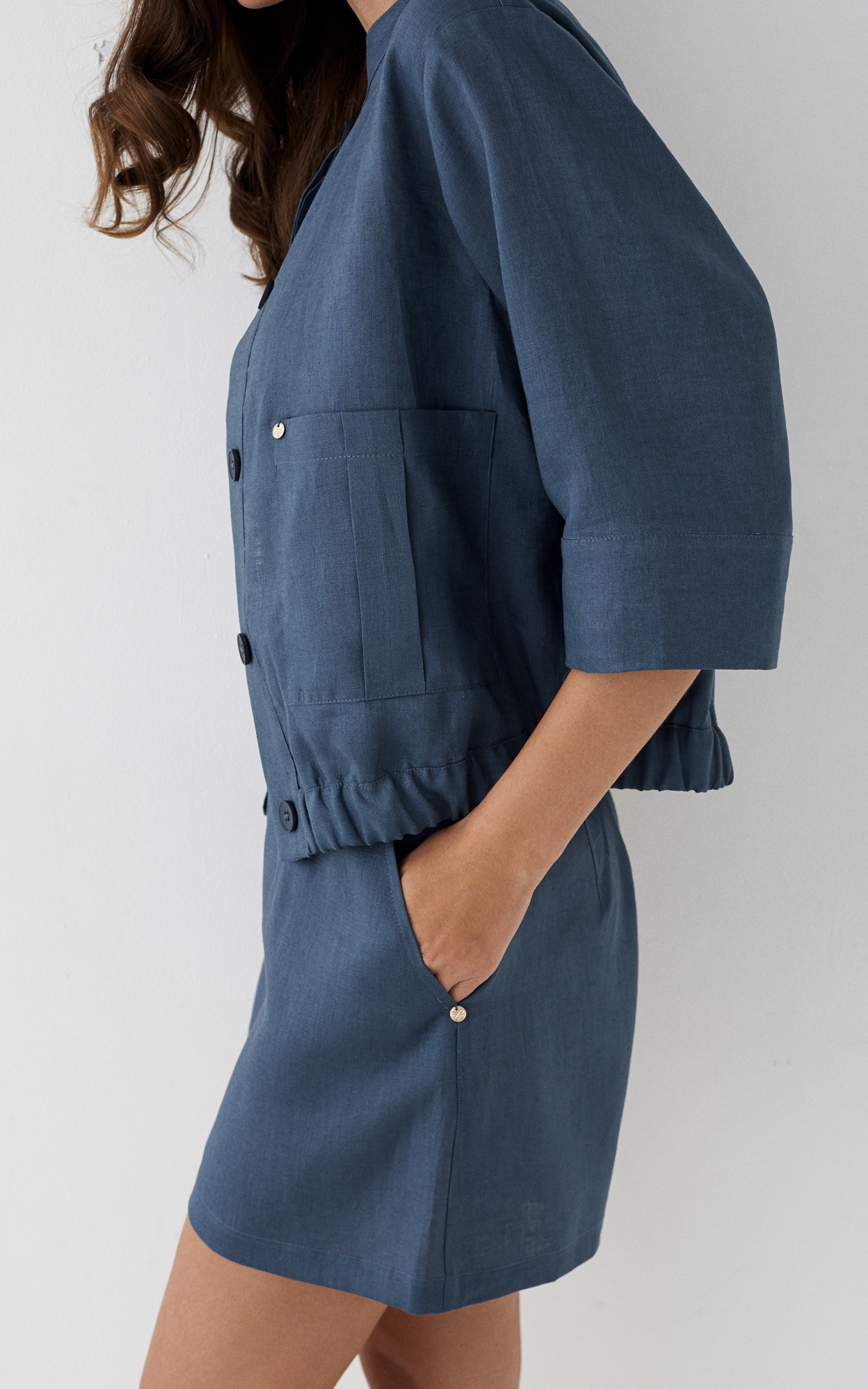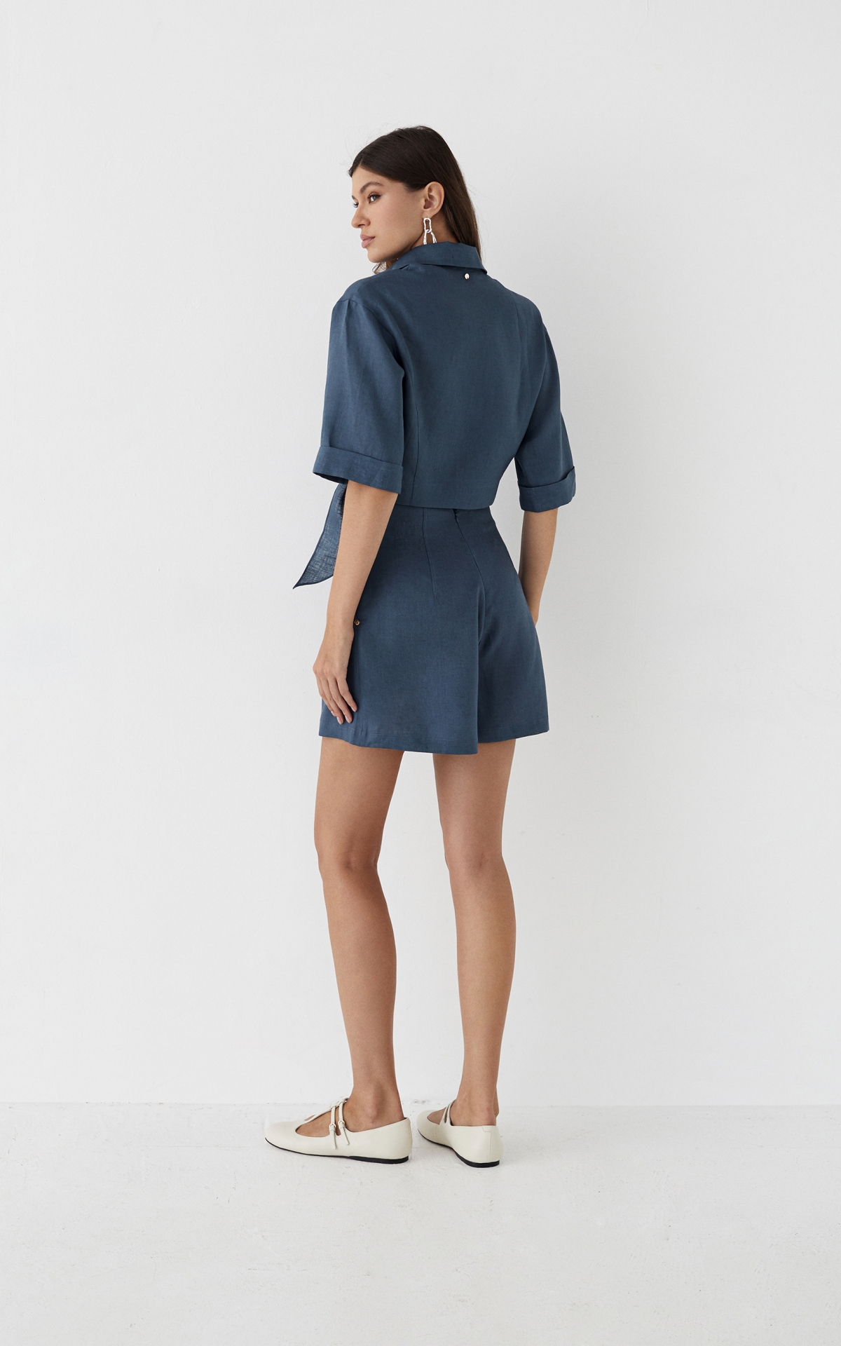 В легких шортах пыльно-бирюзового цвета будет комфортно даже в самую жаркую погоду. Мы выполнили их из 100% дышащего невесомого льна, который отлично пропускает воздух и слегка охлаждает кожу, мягко драпируется и создает красивый эффект переливов на солнце. Прямой, слегка расклешенный силуэт с двумя боковыми прорезными карманами отвечают за комфорт и универсальность, а скульптурные вытачки за идеальную посадку по фигуре. Рекомендуем сочетать с топом или рубашкой из льняной капсулы для более формального образа или стилизовать для прогулки вдоль морского побережья.