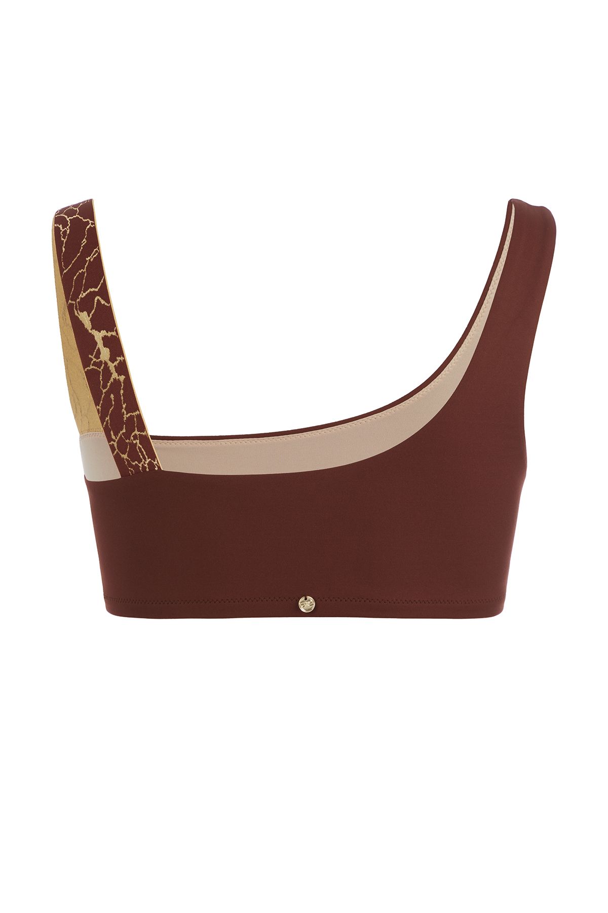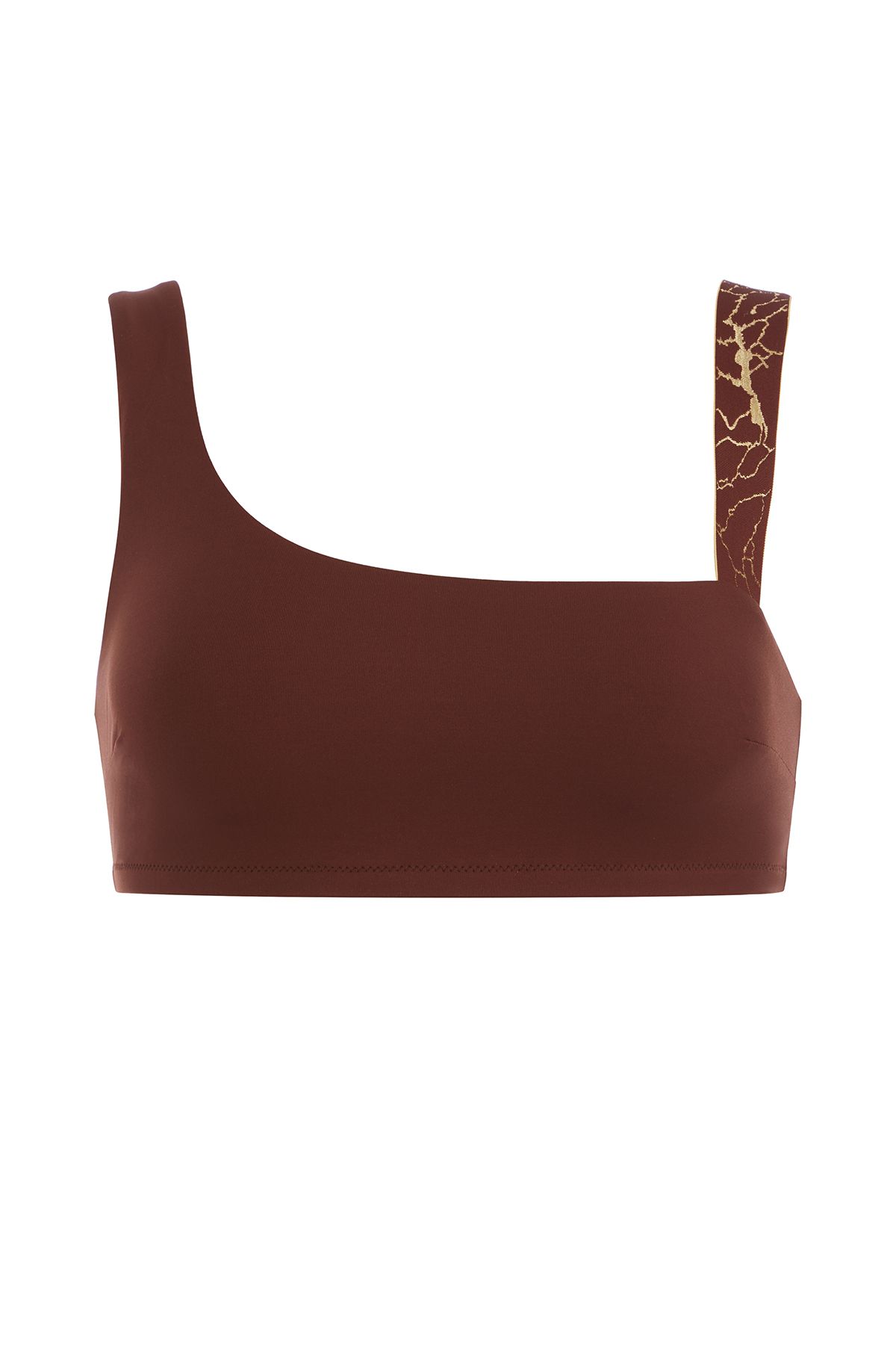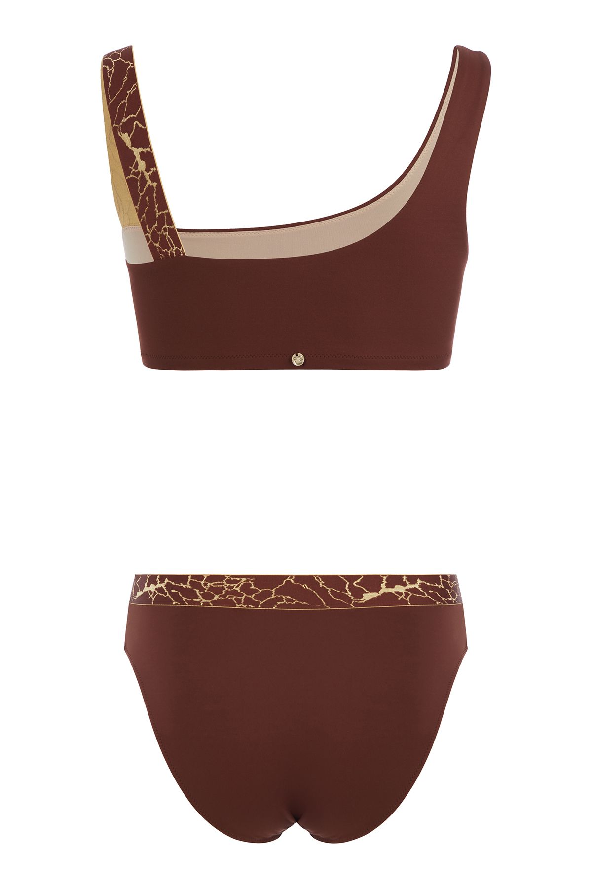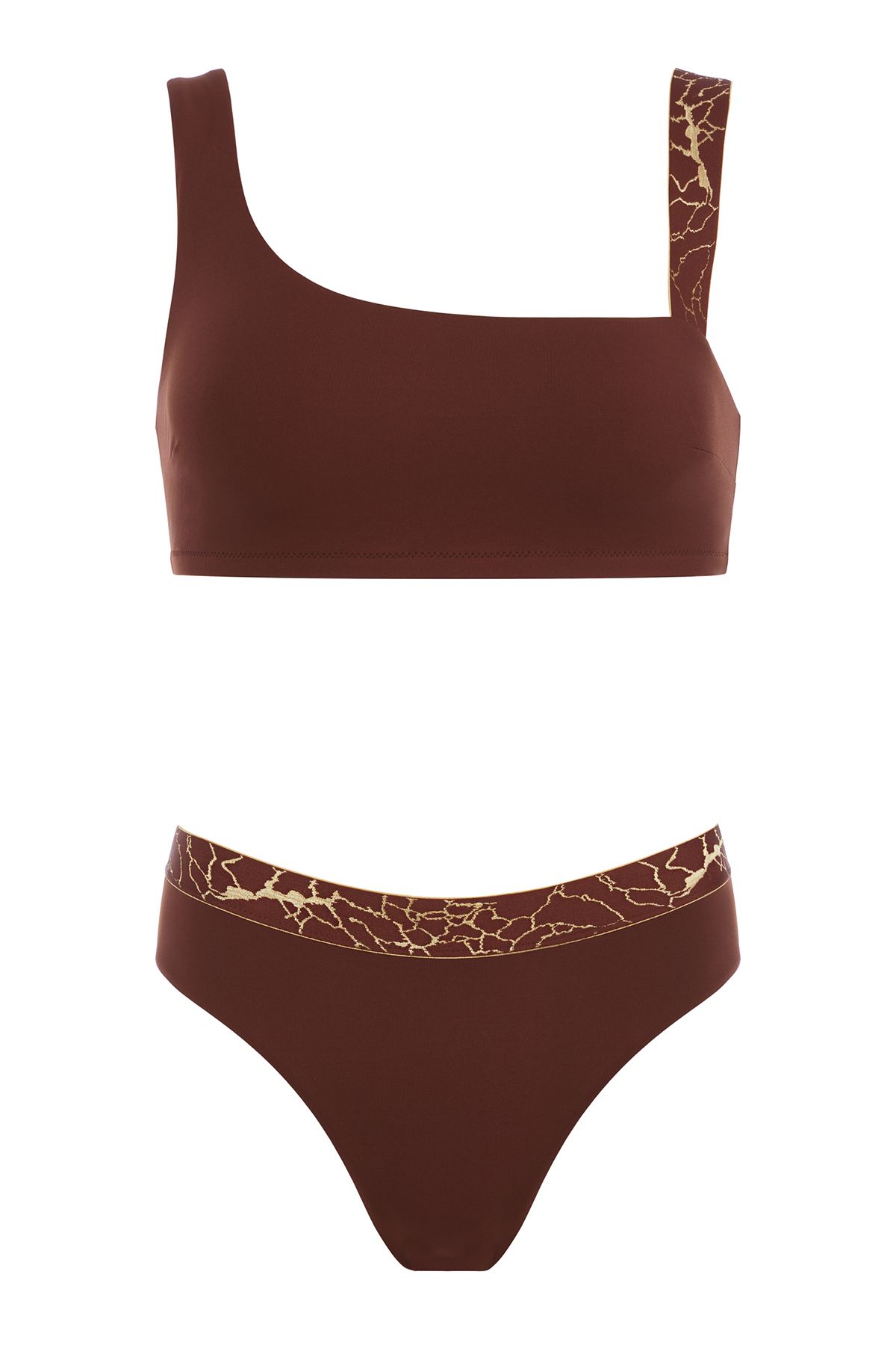 Лаконичный купальник приятного бронзового цвета, вдохновленный африканскими мотивами, выполнен из эластичного жаккардового полотна с вплетенными золотыми люрексными нитями и фактурным рельефом, которое быстро сохнет, не растягивается и не теряет насыщенности. Топ на одно плечо на подкладке из линина смоделирован без застежки, задняя и передняя детали с нагрудными вытачками для придания объёма и идеального прилегания переходят в плотные комфортные бретели. Вырез спинки углублен. Бра дополняют широкие плавки слип с завышенной посадкой. Акцентной деталью образа является широкая декоративная резинка с вышитыми мерцающими золотыми вкраплениями в мозаичной технике.