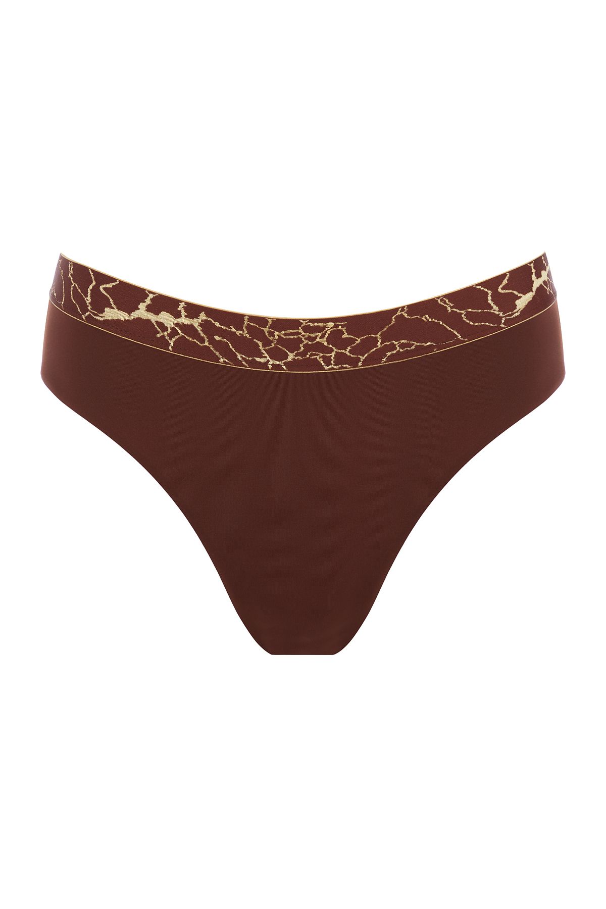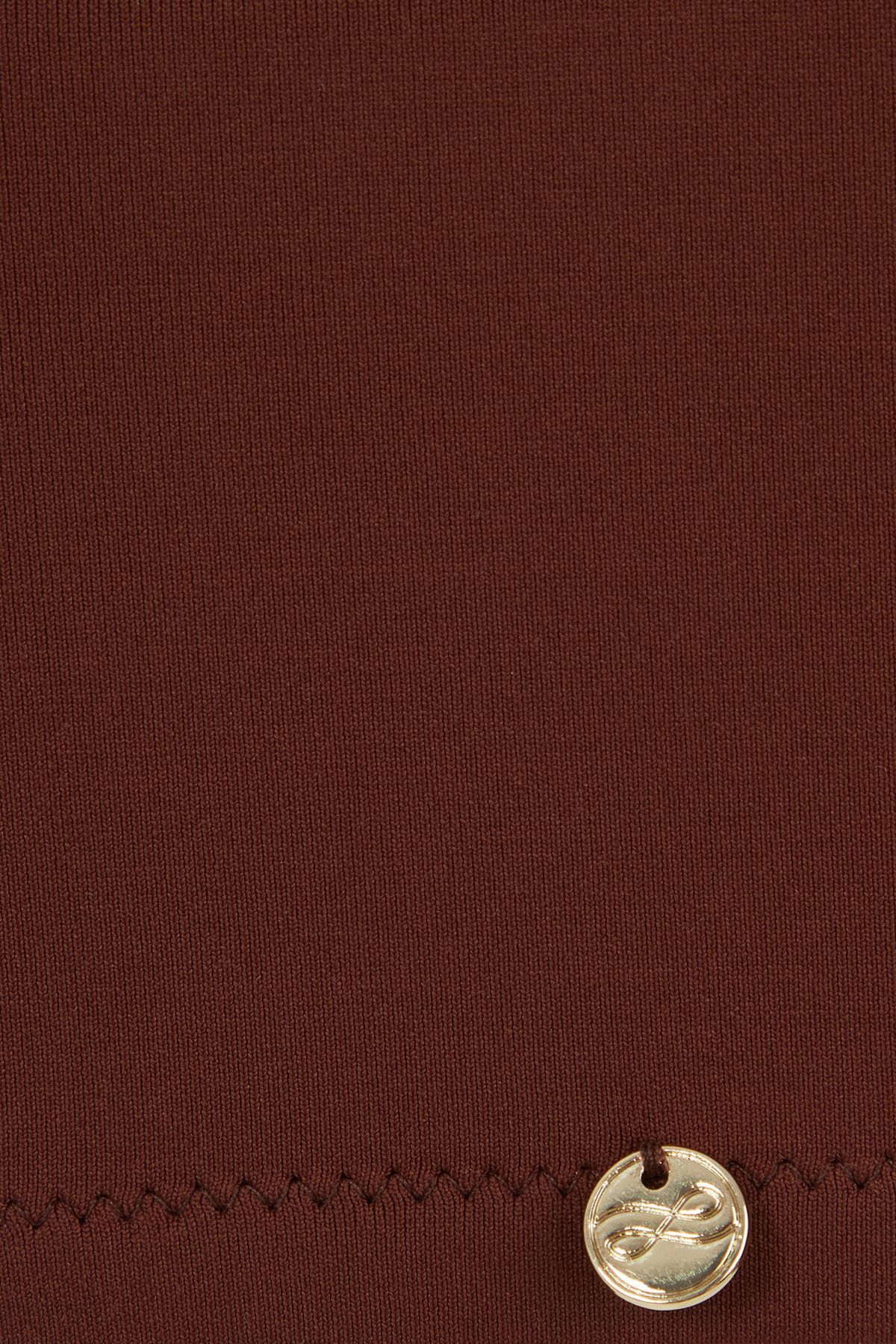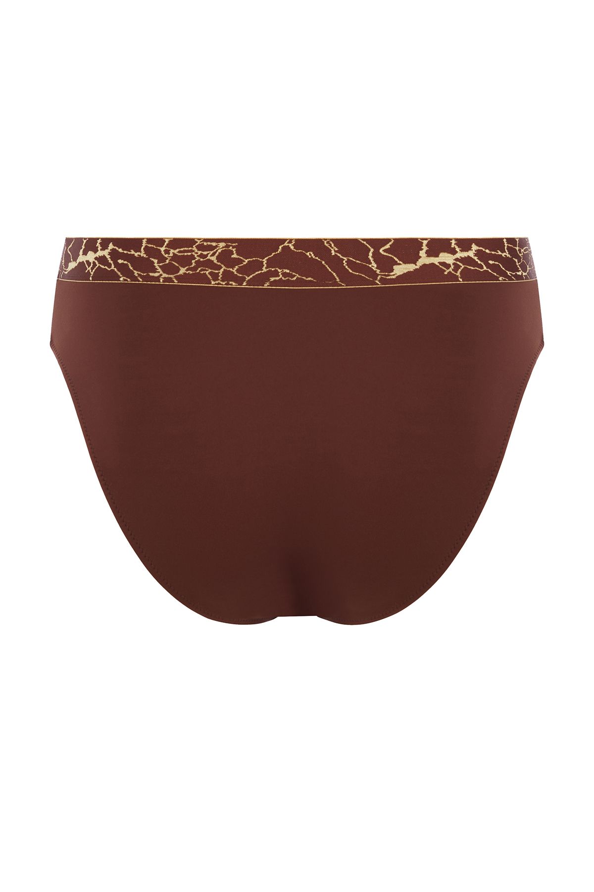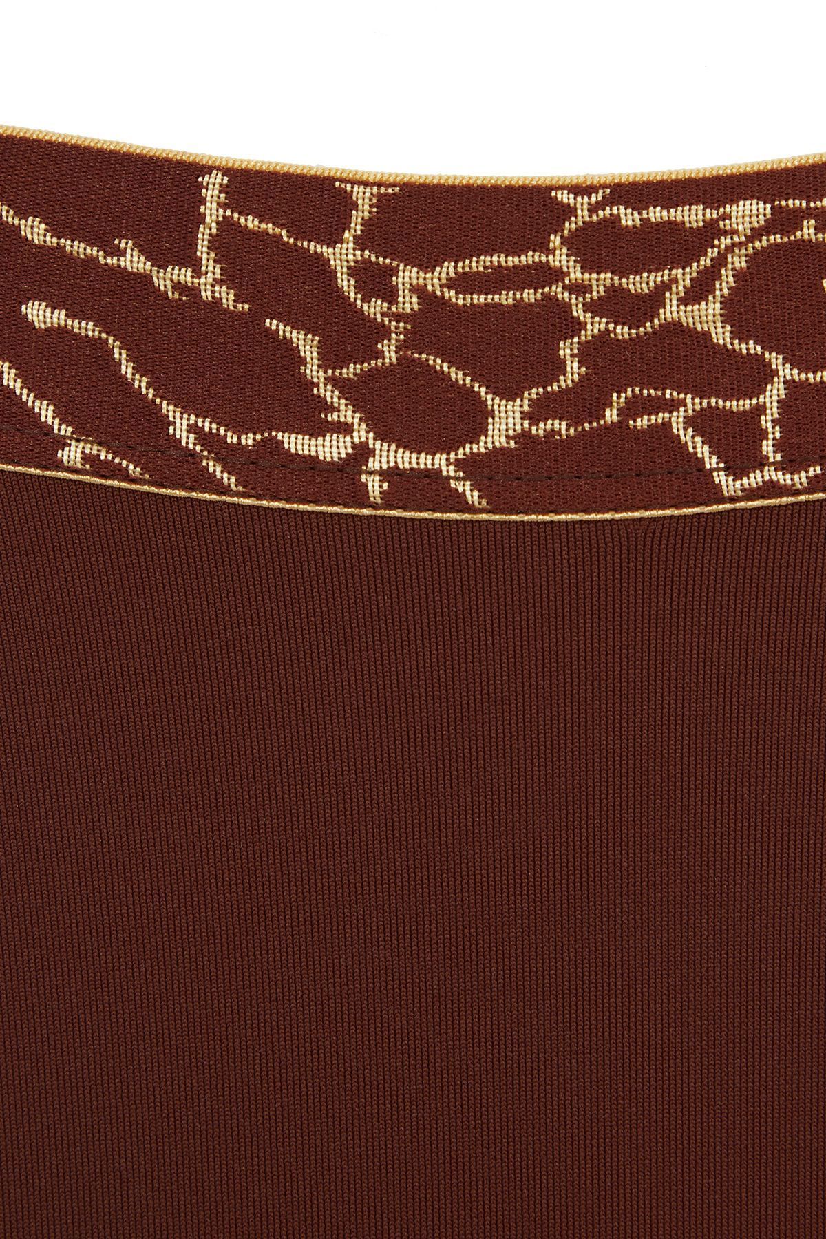 Лаконичный купальник приятного бронзового цвета, вдохновленный африканскими мотивами, выполнен из эластичного жаккардового полотна с вплетенными золотыми люрексными нитями и фактурным рельефом, которое быстро сохнет, не растягивается и не теряет насыщенности. Топ на одно плечо на подкладке из линина смоделирован без застежки, задняя и передняя детали с нагрудными вытачками для придания объёма и идеального прилегания переходят в плотные комфортные бретели. Вырез спинки углублен. Бра дополняют широкие плавки слип с завышенной посадкой. Акцентной деталью образа является широкая декоративная резинка с вышитыми мерцающими золотыми вкраплениями в мозаичной технике.