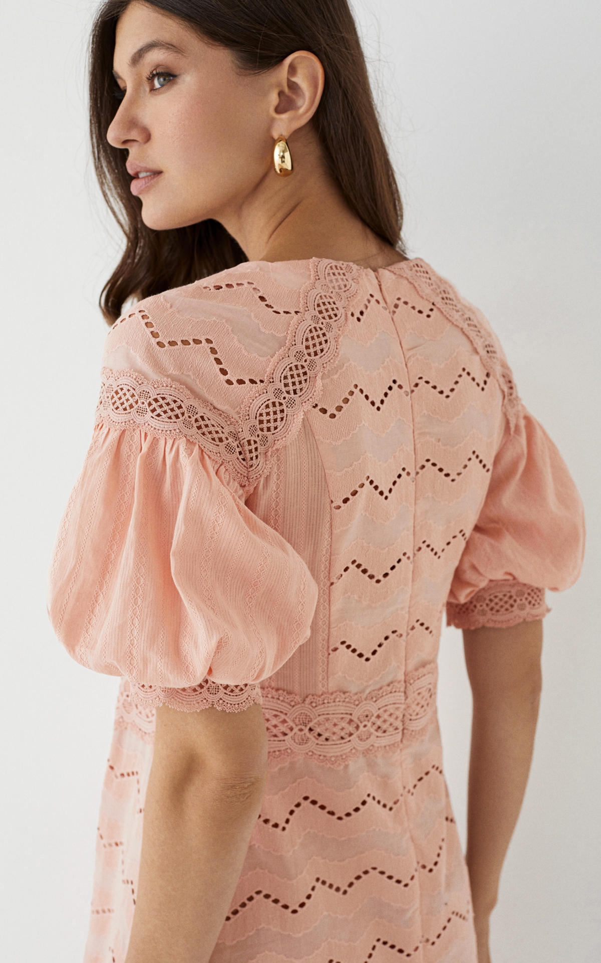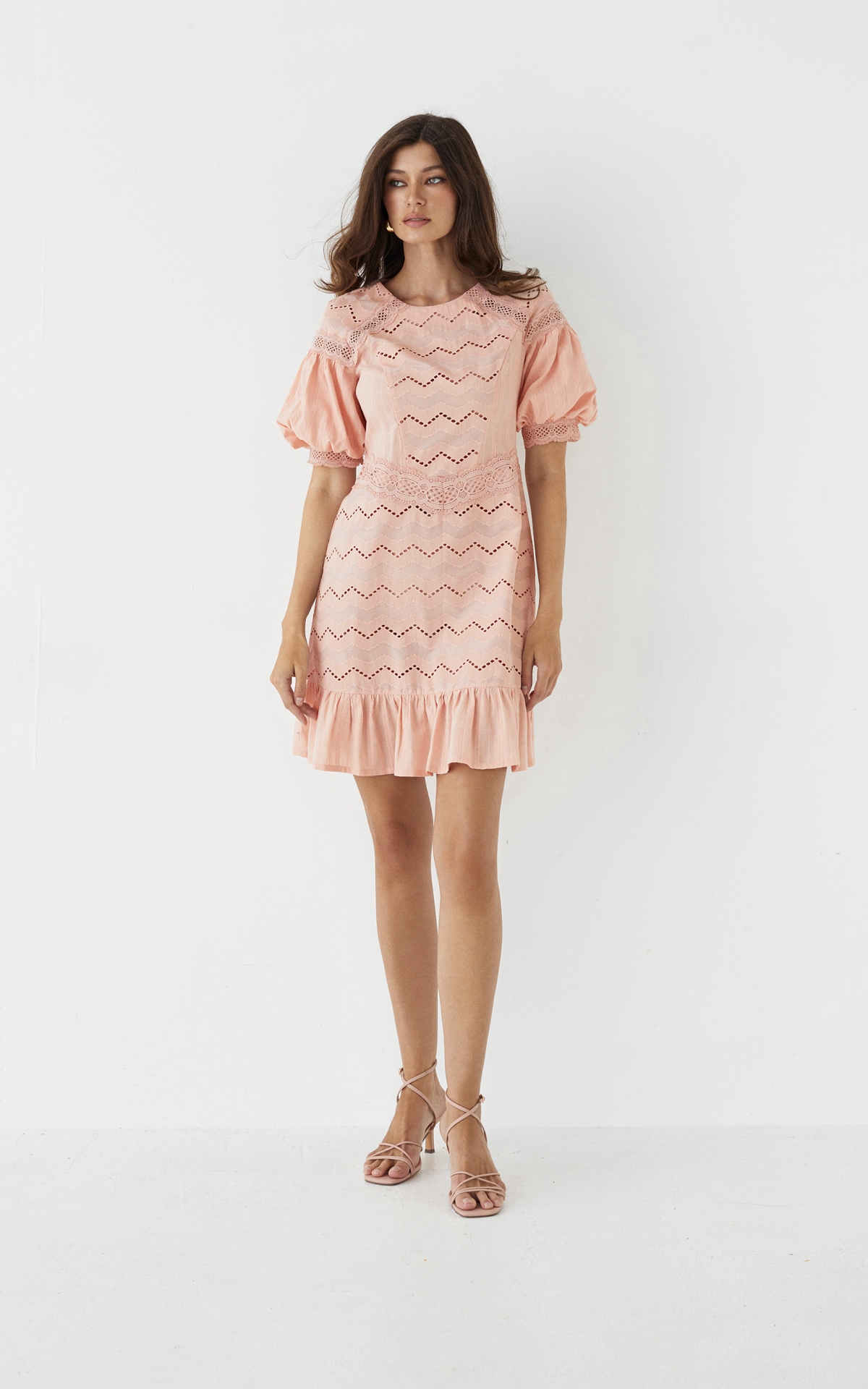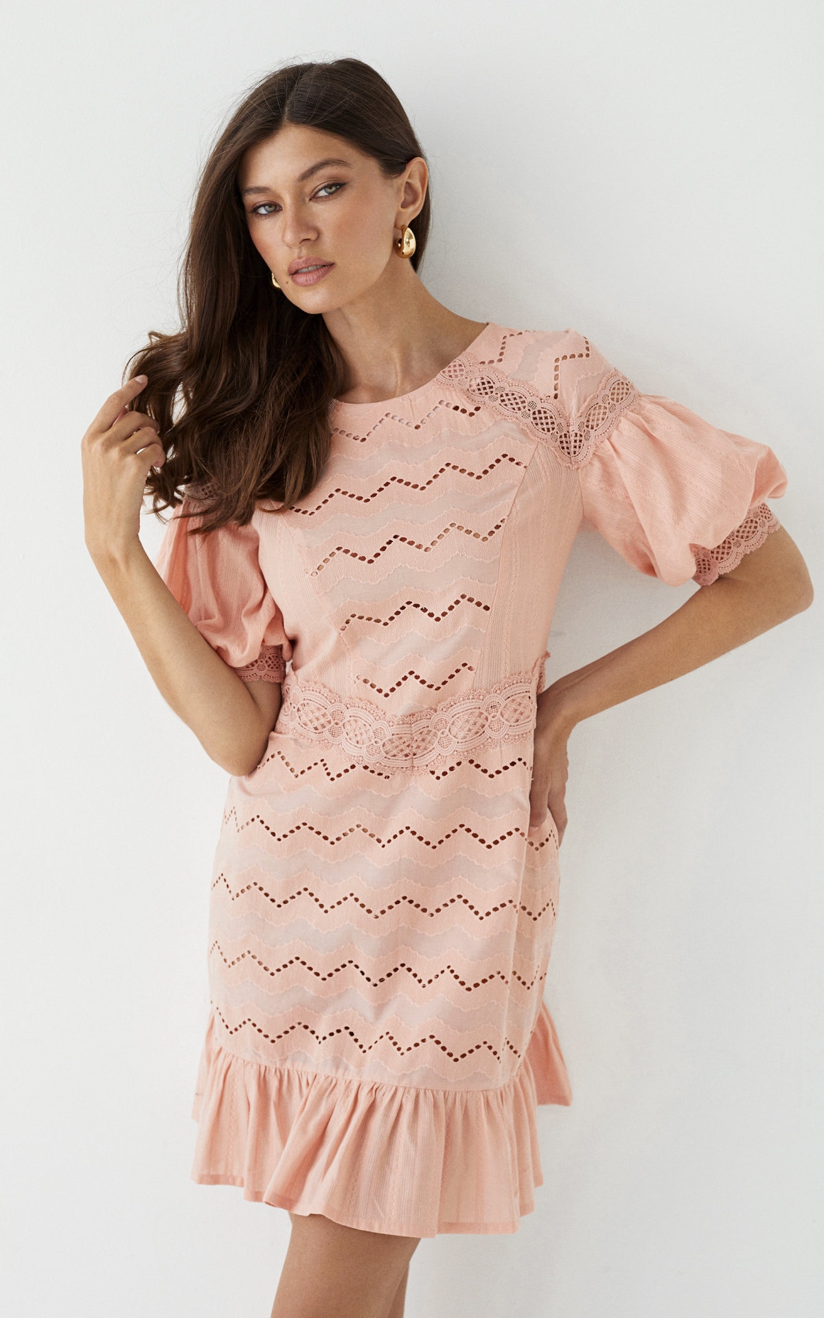 Романтичное платье длины мини будет уместно как в городе, так и на пляжном баре около лазурного побережья. Модель из 100% натурального хлопкового шитья декорирована орнаментальными рисунками, многоступенчатыми вышивками и прорезными узорами Такой сарафан будет универсальным решением для любого образа и типа фигуры за счет приталенного, но не облегающего силуэта и выверенного кроя. Комбинация разнообразных полотен разделена сложносочиненными тесьмами и простроченными рельефами, которые расставляют необходимые акценты и скульптурируют фигуру. Полупрозрачный волан с множественными складками по нижнему срезу юбки и объемные рукава-фонарики добавляют образу воздушность и особую легкость. Летом сочетайте сарафан с босоножками, а в холодное время года с ботинками или казаками и объемной кожаной курткой