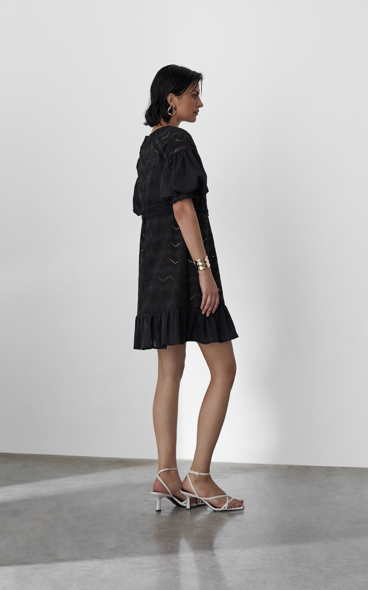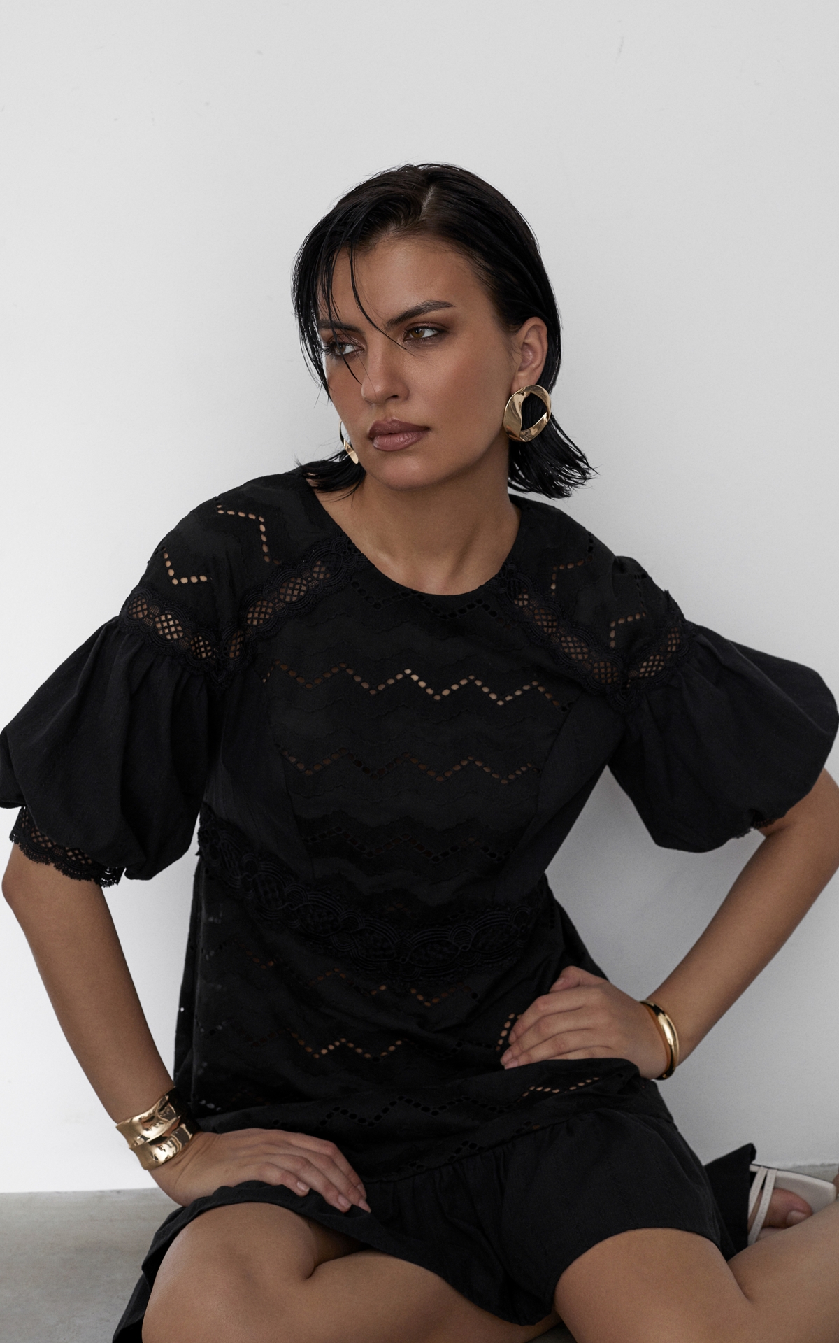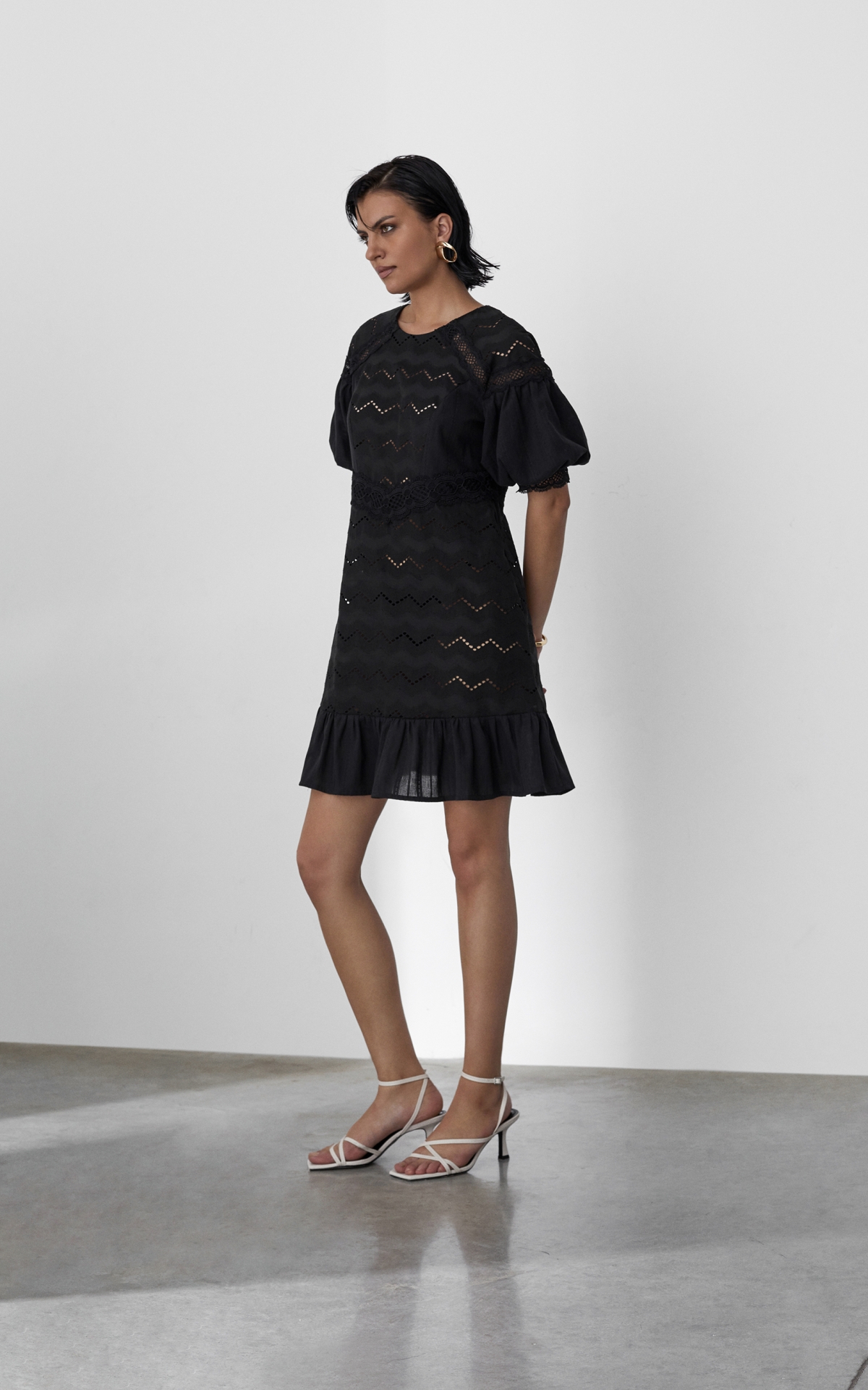 Романтичное платье длины мини будет уместно как в городе, так и на пляжном баре около лазурного побережья. Модель из 100% натурального хлопкового шитья декорирована орнаментальными рисунками, многоступенчатыми вышивками и прорезными узорами Такой сарафан будет универсальным решением для любого образа и типа фигуры за счет приталенного, но не облегающего силуэта и выверенного кроя. Комбинация разнообразных полотен разделена сложносочиненными тесьмами и простроченными рельефами, которые расставляют необходимые акценты и скульптурируют фигуру. Полупрозрачный волан с множественными складками по нижнему срезу юбки и объемные рукава-фонарики добавляют образу воздушность и особую легкость. Лeтом сочeтайте сарафан с босоножками, а в холодное время года с ботинками или казаками и объемной кожаной курткой