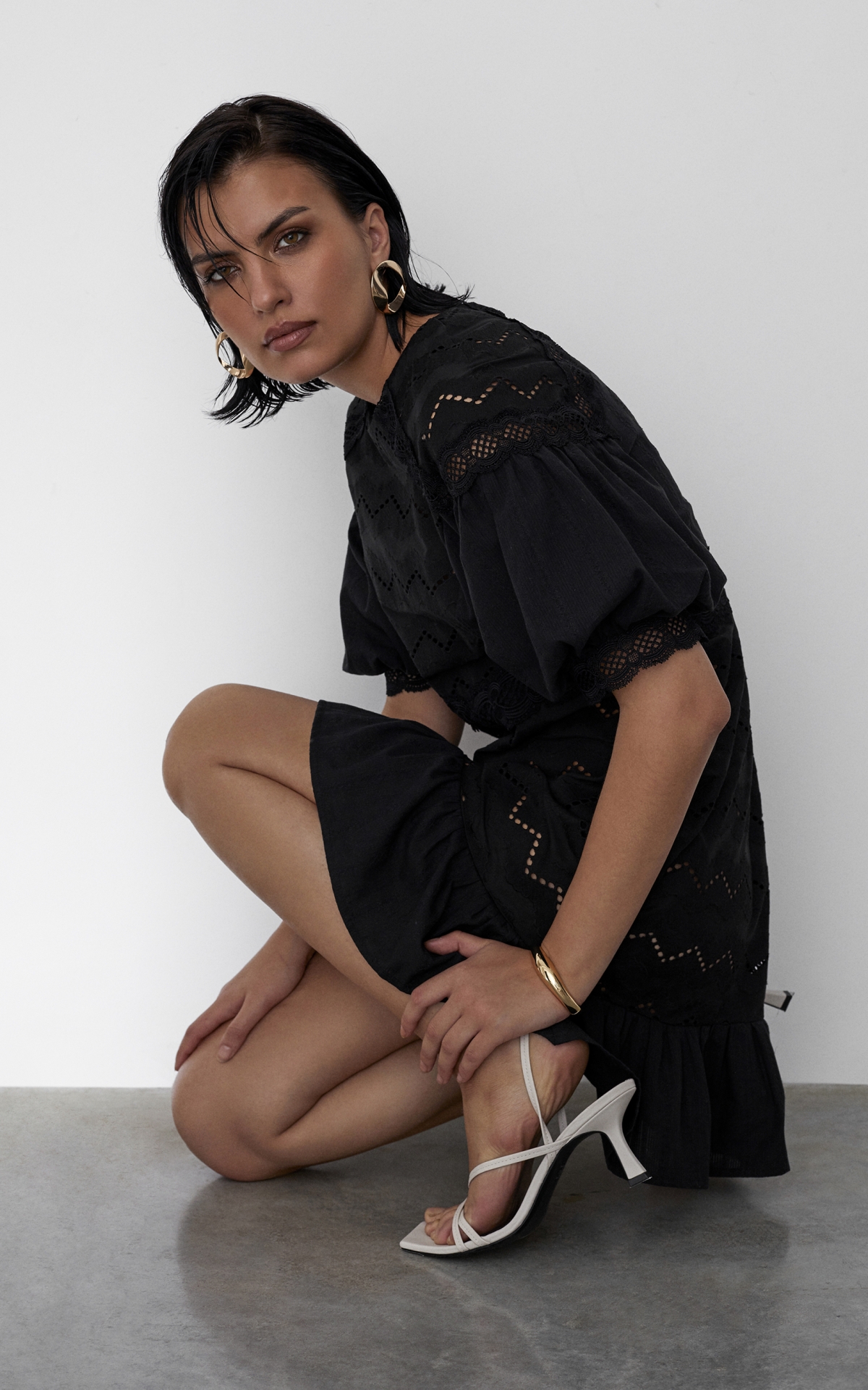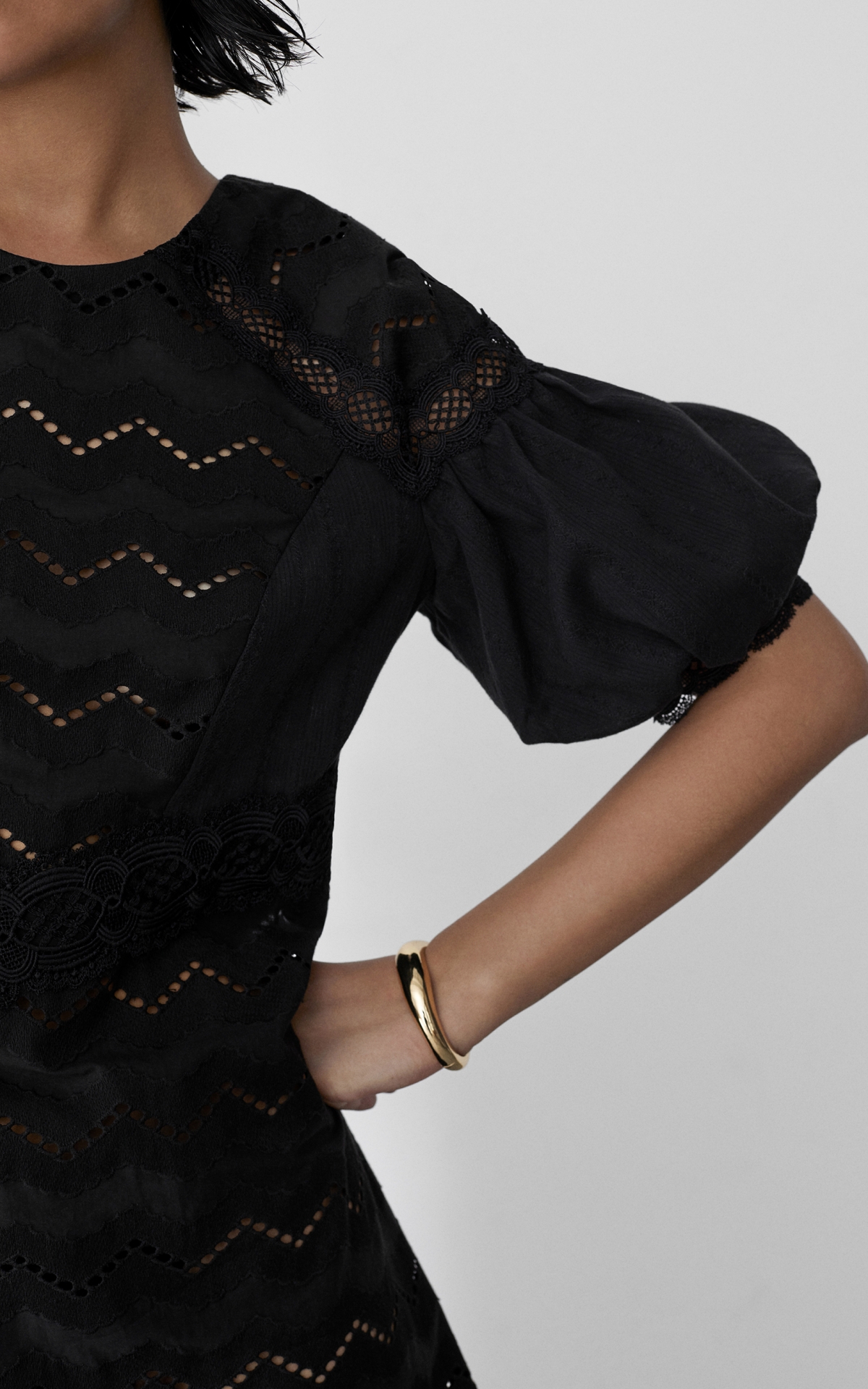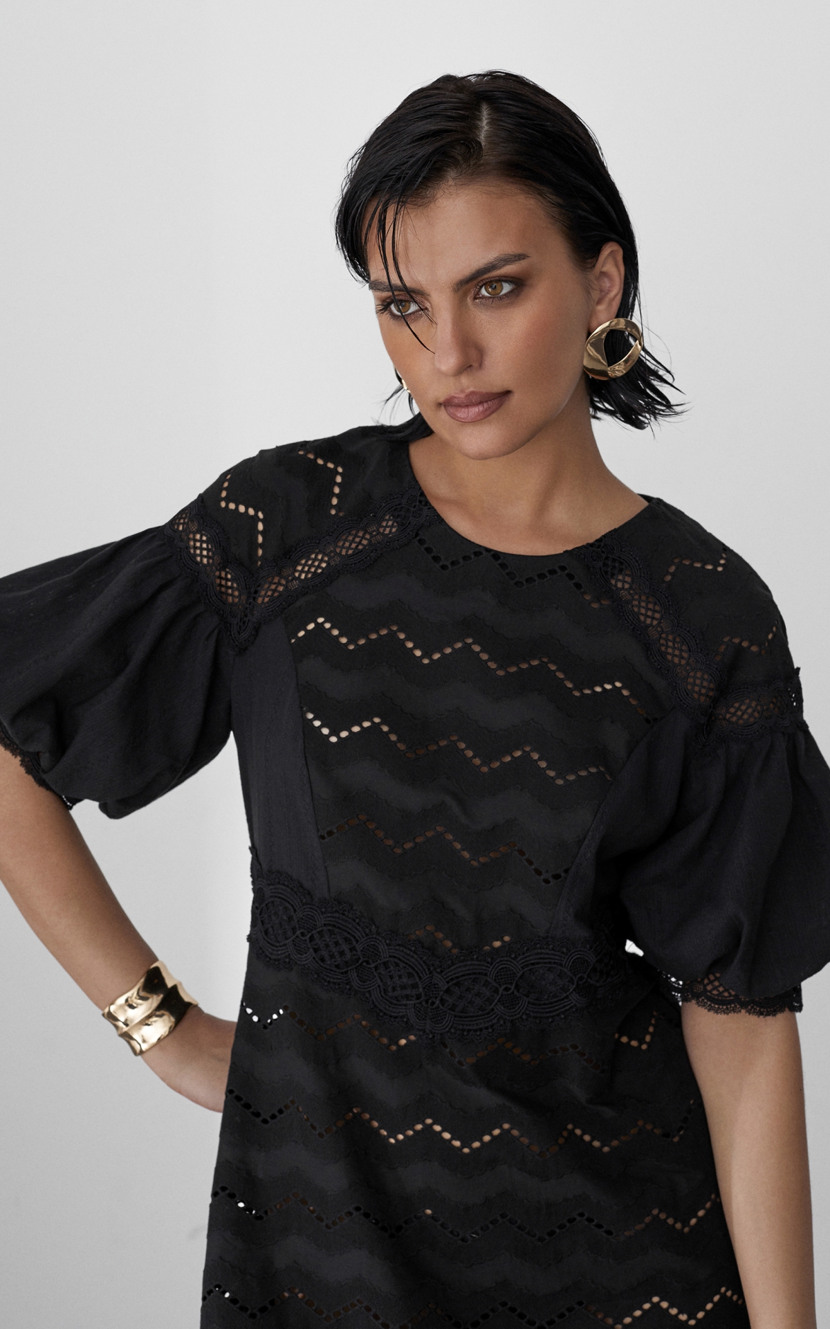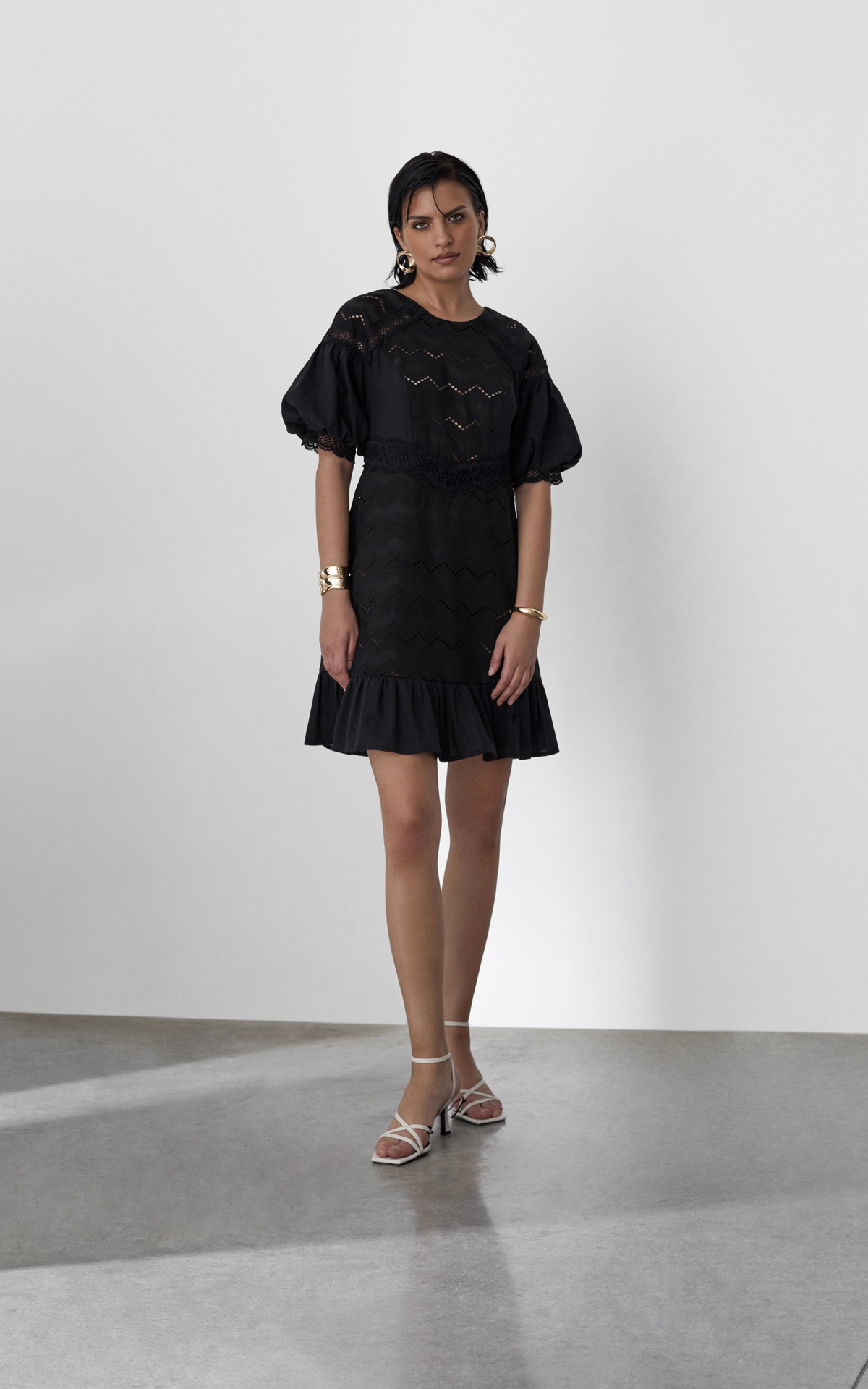 Романтичное платье длины мини будет уместно как в городе, так и на пляжном баре около лазурного побережья. Модель из 100% натурального хлопкового шитья декорирована орнаментальными рисунками, многоступенчатыми вышивками и прорезными узорами Такой сарафан будет универсальным решением для любого образа и типа фигуры за счет приталенного, но не облегающего силуэта и выверенного кроя. Комбинация разнообразных полотен разделена сложносочиненными тесьмами и простроченными рельефами, которые расставляют необходимые акценты и скульптурируют фигуру. Полупрозрачный волан с множественными складками по нижнему срезу юбки и объемные рукава-фонарики добавляют образу воздушность и особую легкость. Лeтом сочeтайте сарафан с босоножками, а в холодное время года с ботинками или казаками и объемной кожаной курткой