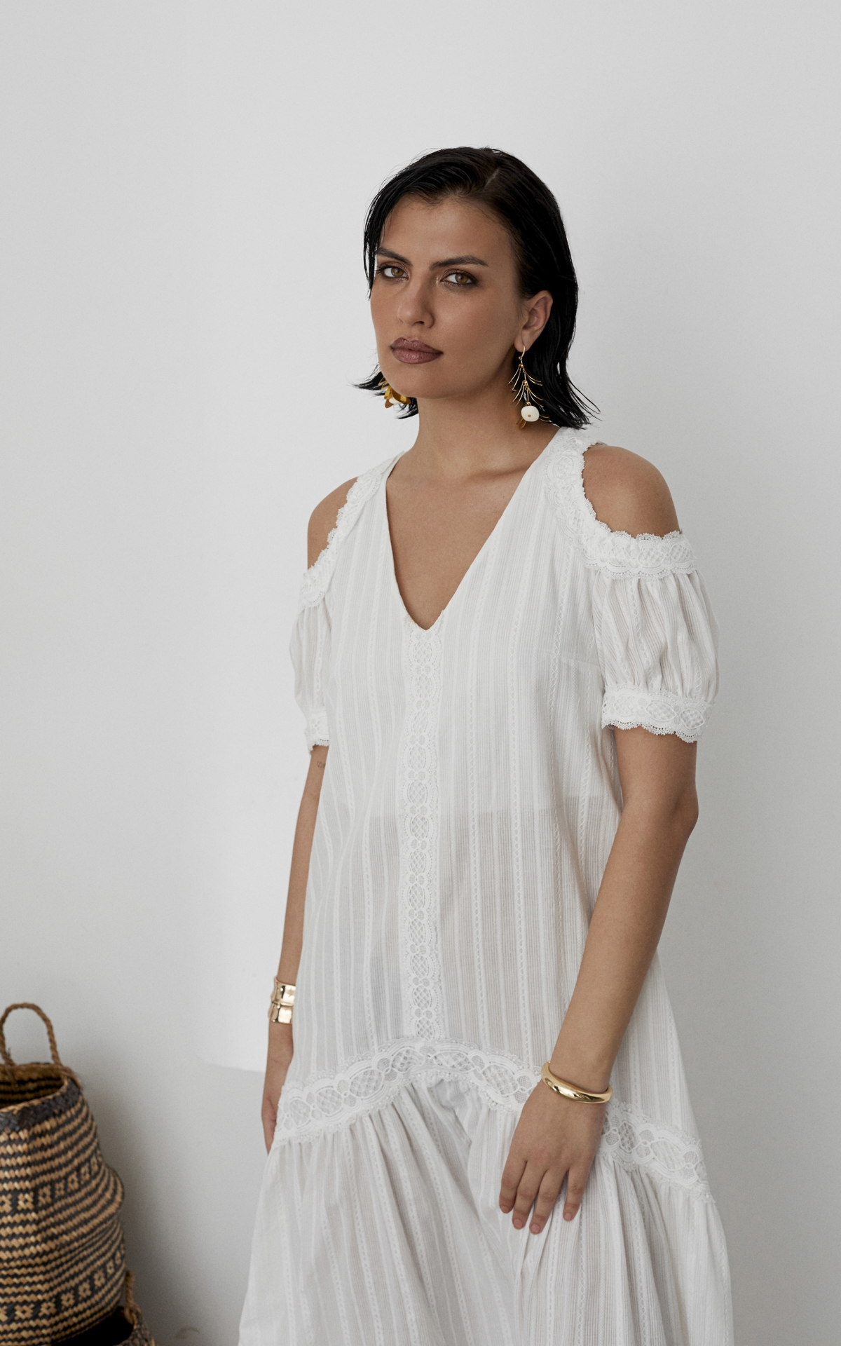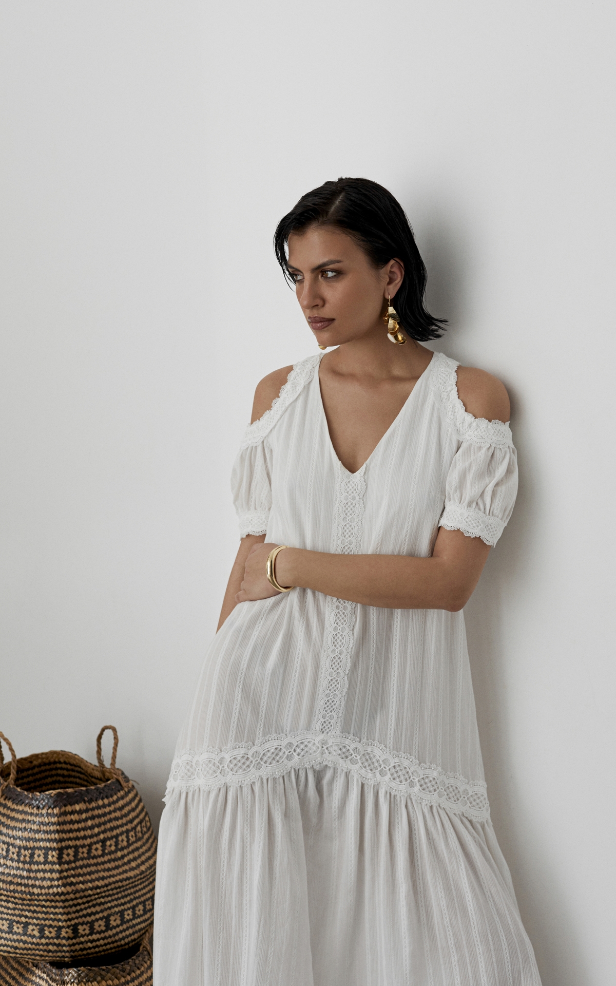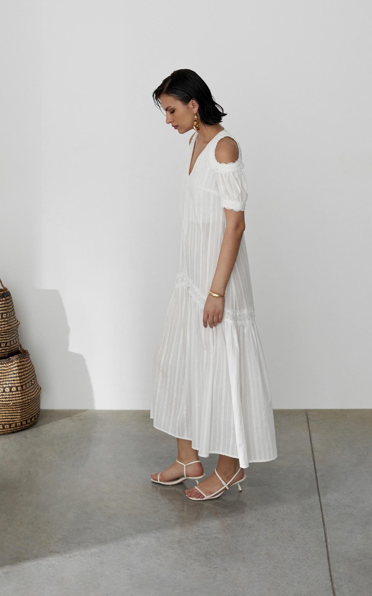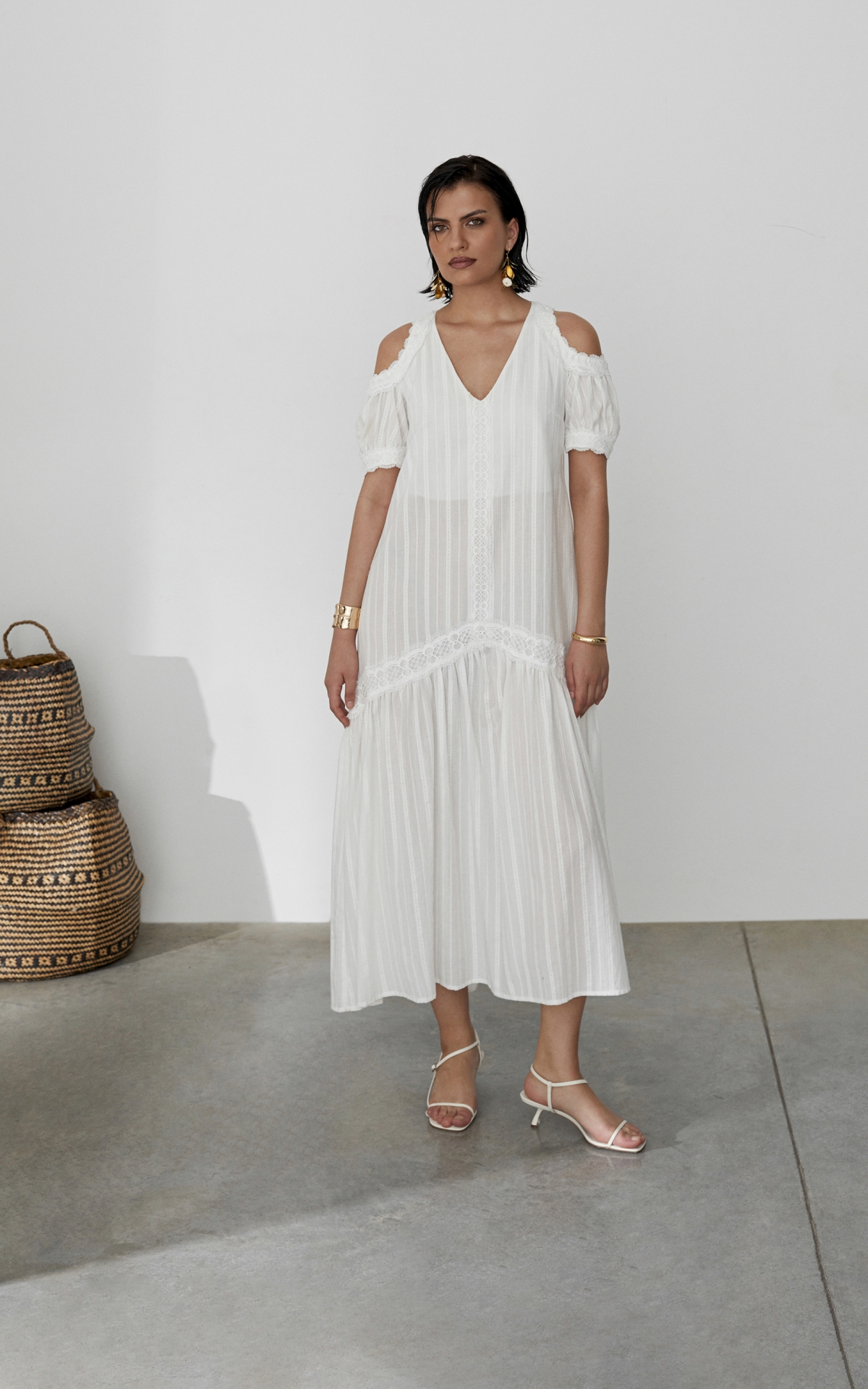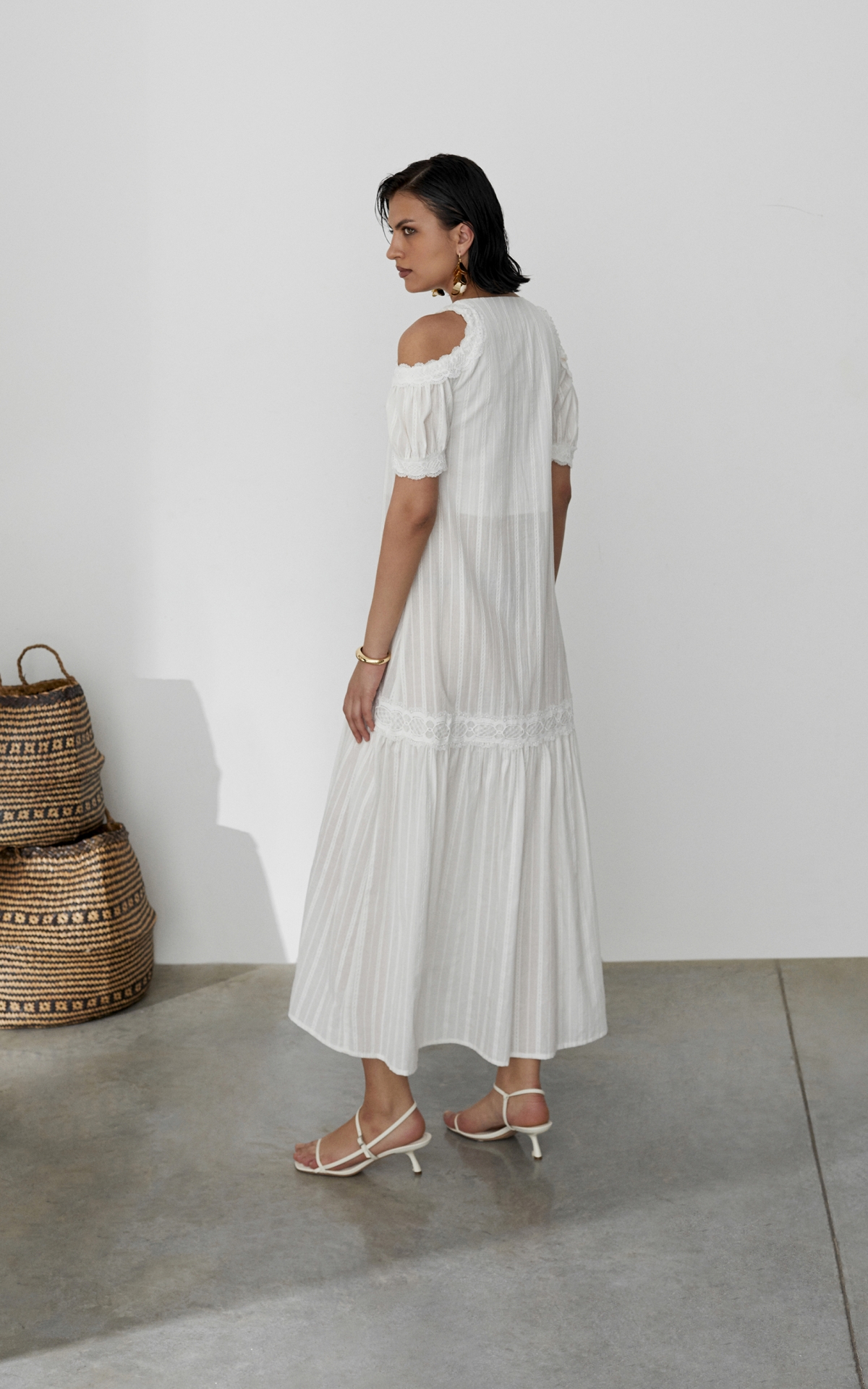 Воздушное платье-сарафан, декорированное орнаментальными рисунками, многоступенчатыми вышивками и прорезными узорами из 100% натурального хлопкового шитья отсылает нас к романтичной эпохе 19 века. Такое платье будет универсальным решением для любого образа и типа фигуры за счет летящего, не облегающего силуэта и выверенного кроя. Комбинация разнообразных тканей разделена сложносочиненными тесьмами, которые расставляют необходимые акценты и скульптурируют фигуру. Объемный волан с множественными складками по нижнему срезу юбки и рукава-буфы с узкими манжетами на пуговицах и акцентными вырезами на плечах добавляют образу воздушность и особую романтичность. Платье продублировано подкладкой в цвет изделия, чтобы избежать просвечивания. Летом сочетайте платье с босоножками, а в холодное время года с казаками и объемной кожаной курткой