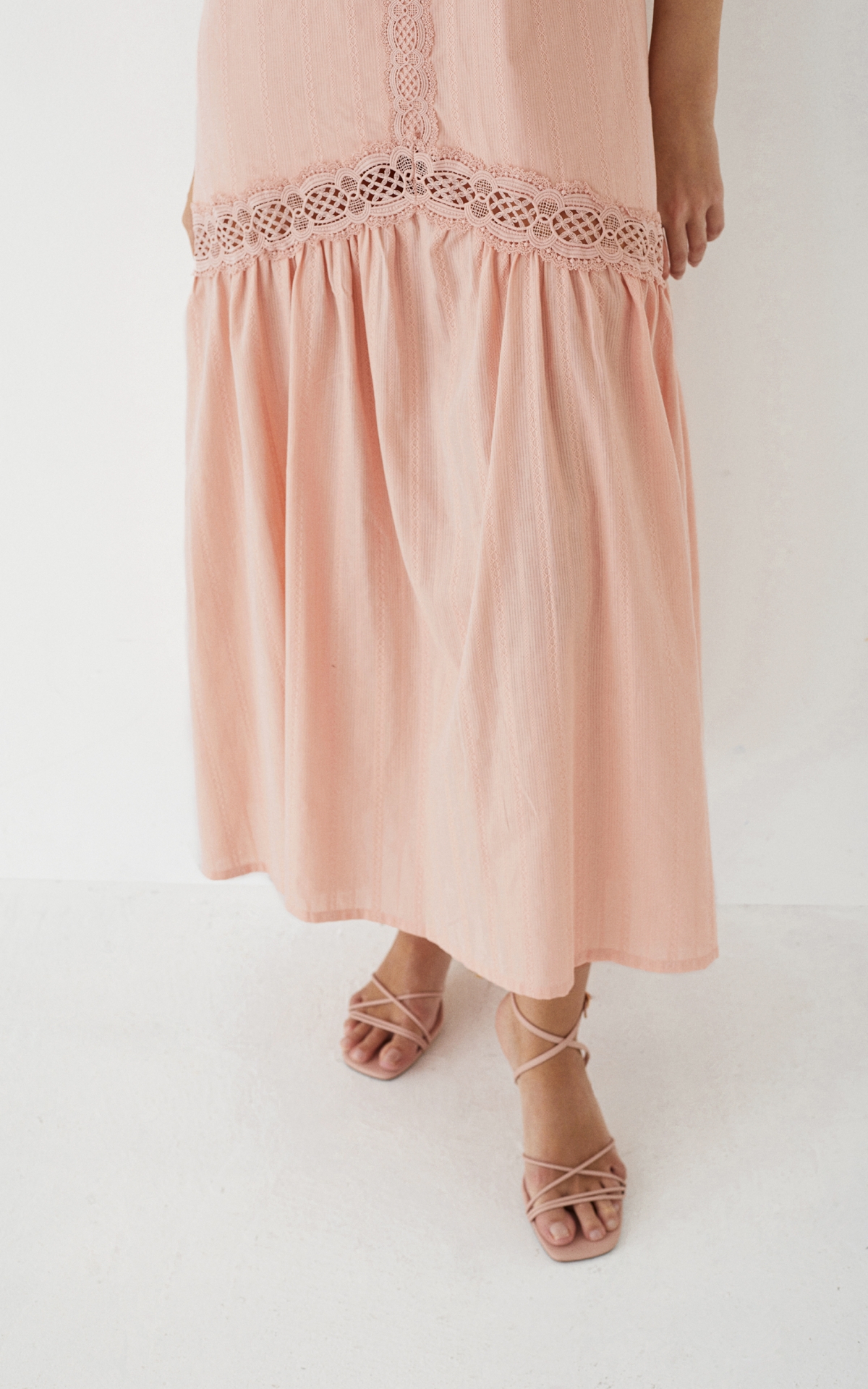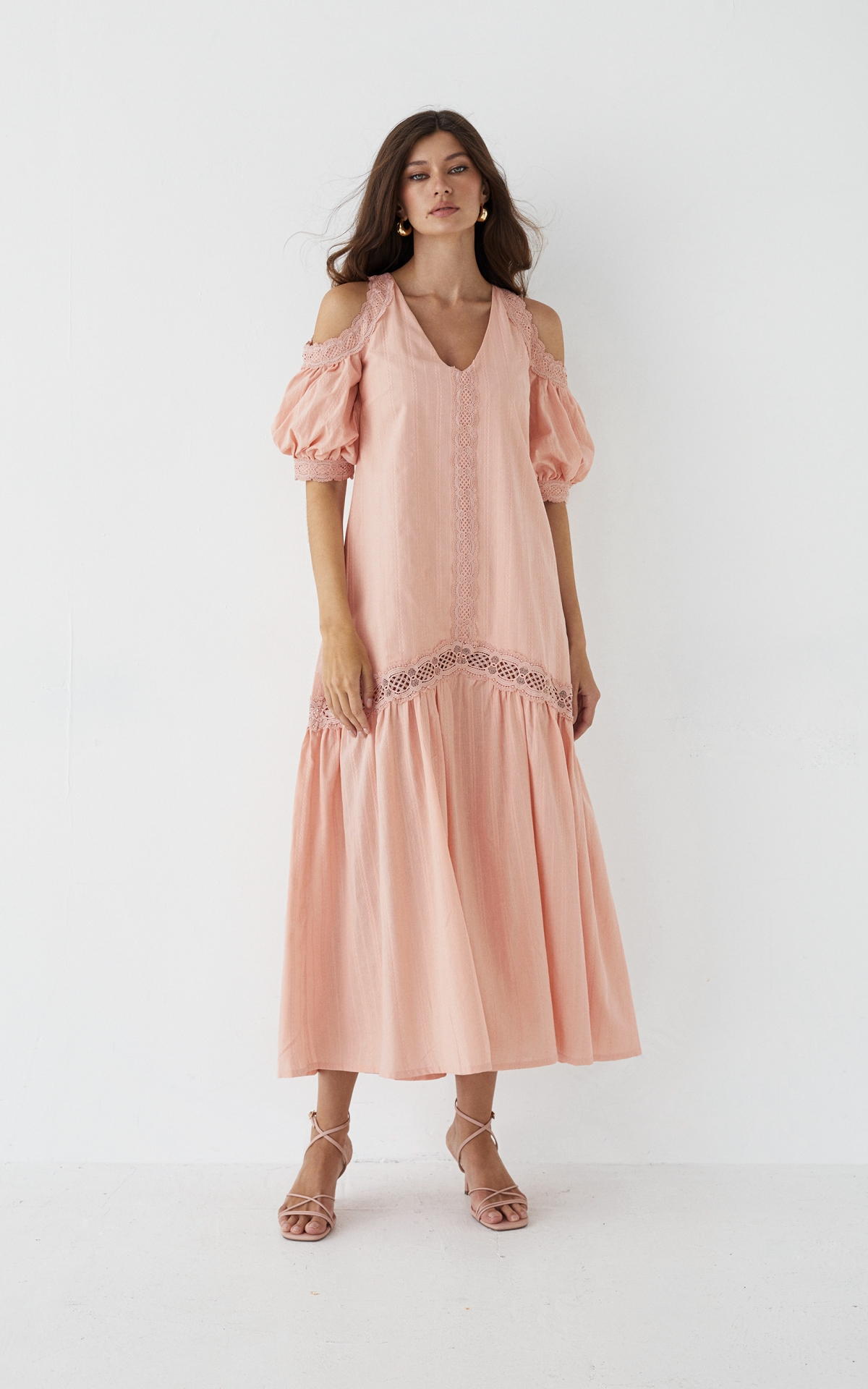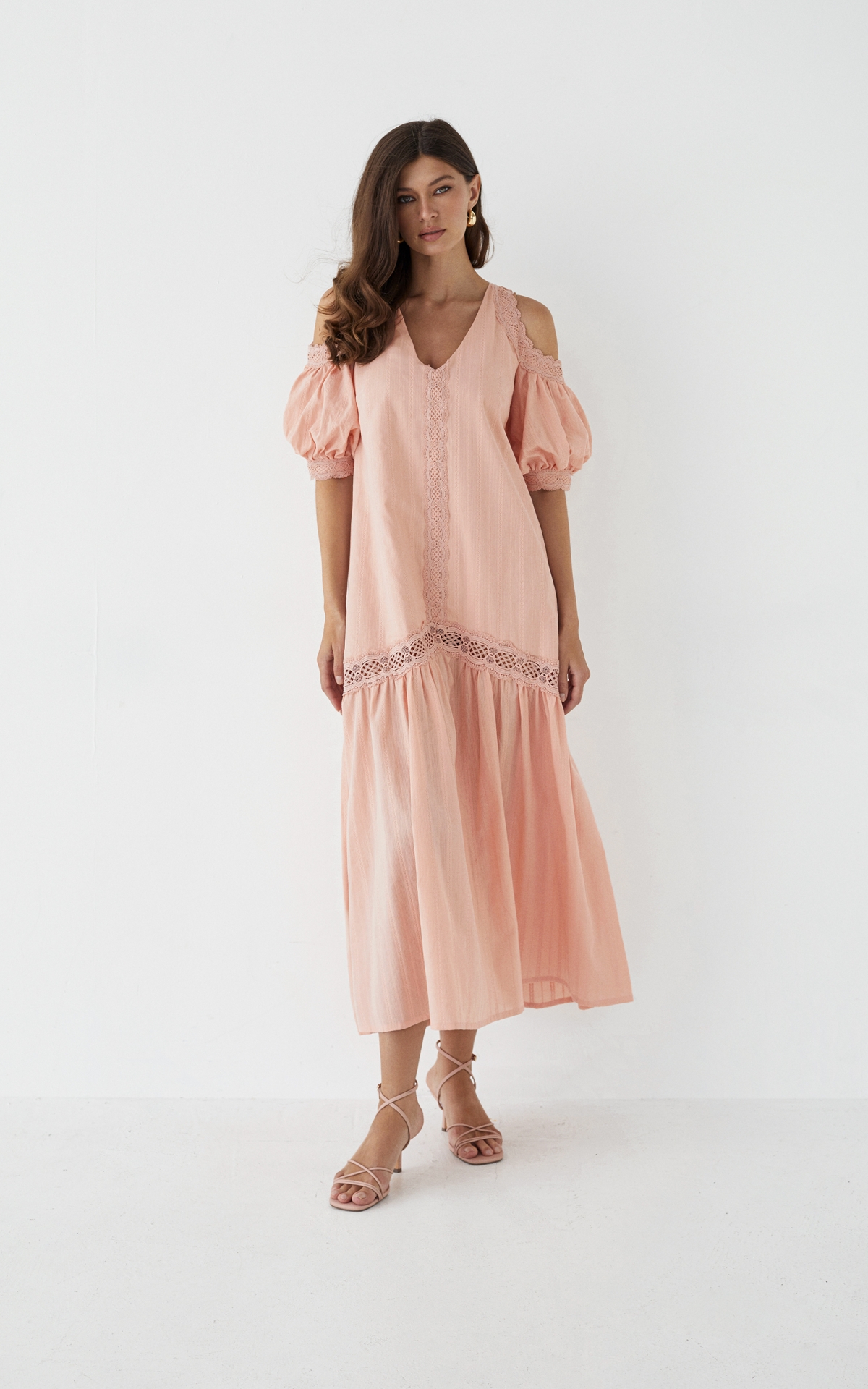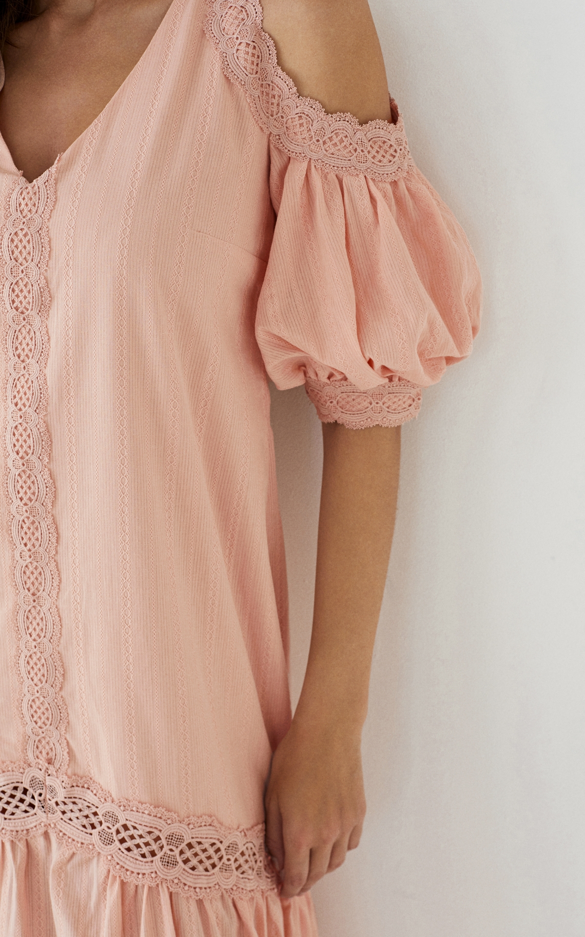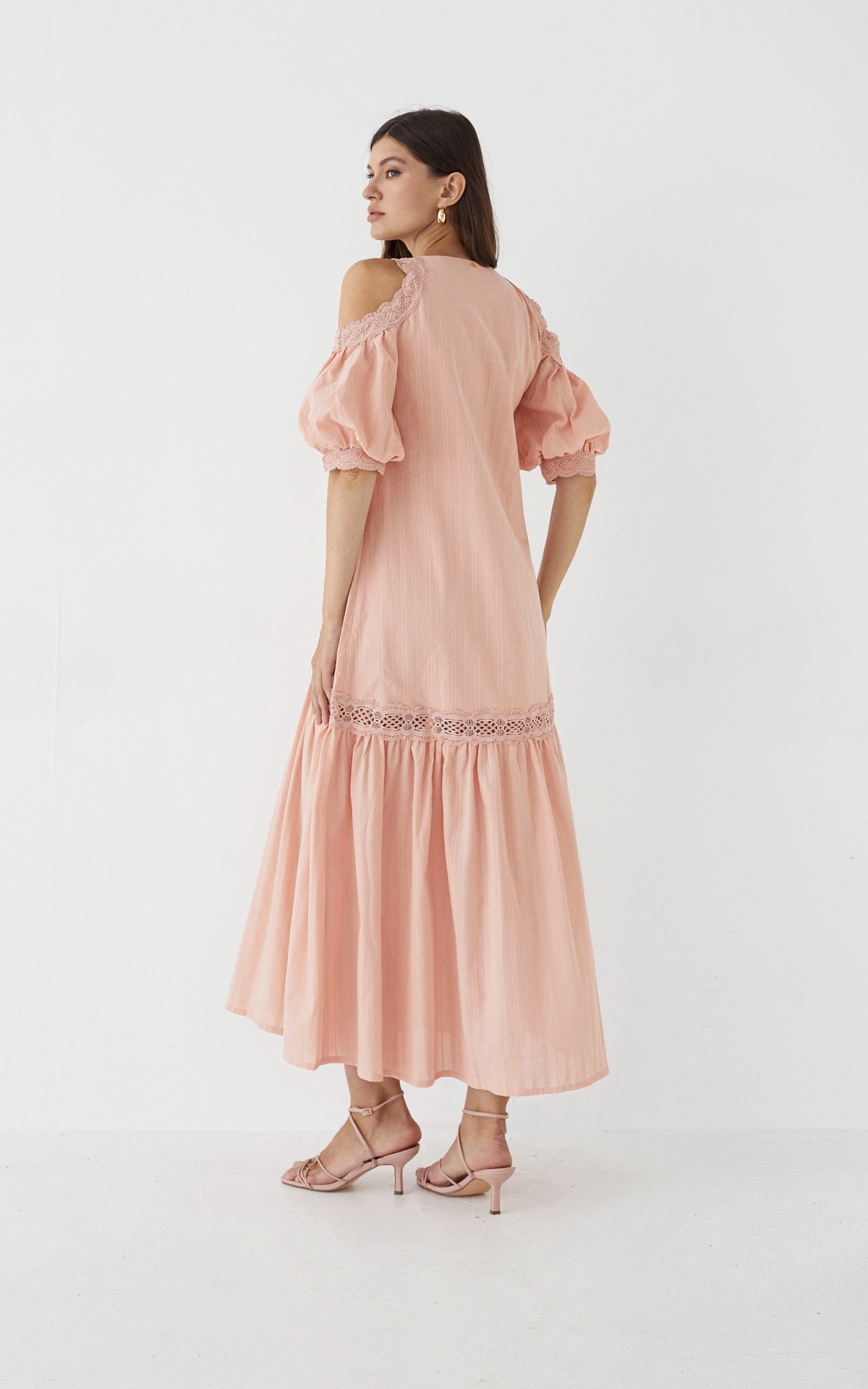 Воздушное платье-сарафан, декорированное орнаментальными рисунками, многоступенчатыми вышивками и прорезными узорами из 100% натурального хлопкового шитья отсылает нас к романтичной эпохе 19 века. Такое платье будет универсальным решением для любого образа и типа фигуры за счет летящего, не облегающего силуэта и выверенного кроя. Комбинация разнообразных тканей разделена сложносочиненными тесьмами, которые расставляют необходимые акценты и скульптурируют фигуру. Объемный волан с множественными складками по нижнему срезу юбки и рукава-буфы с узкими манжетами на пуговицах и акцентными вырезами на плечах добавляют образу воздушность и особую романтичность. Платье продублировано подкладкой в цвет изделия, чтобы избежать просвечивания. Летом сочетайте платье с босоножками, а в холодное время года с казаками и объемной кожаной курткой