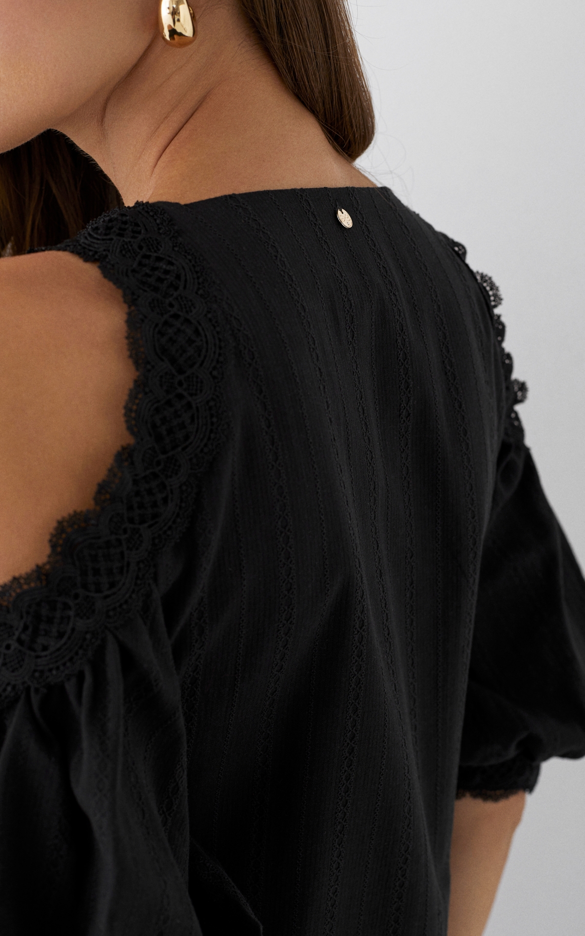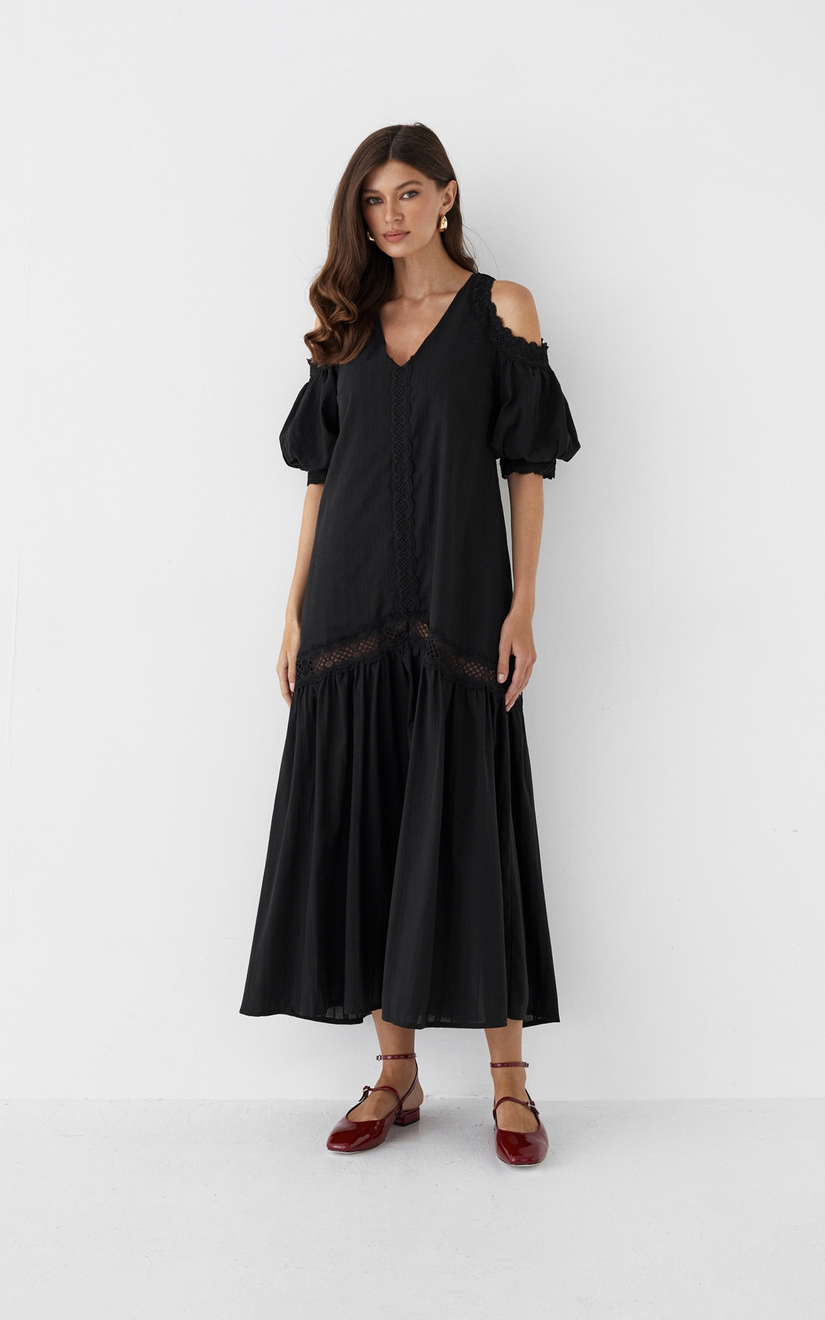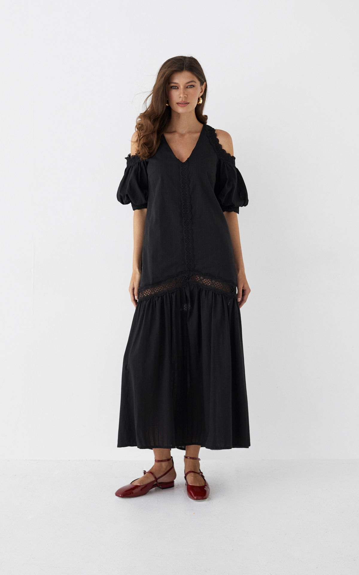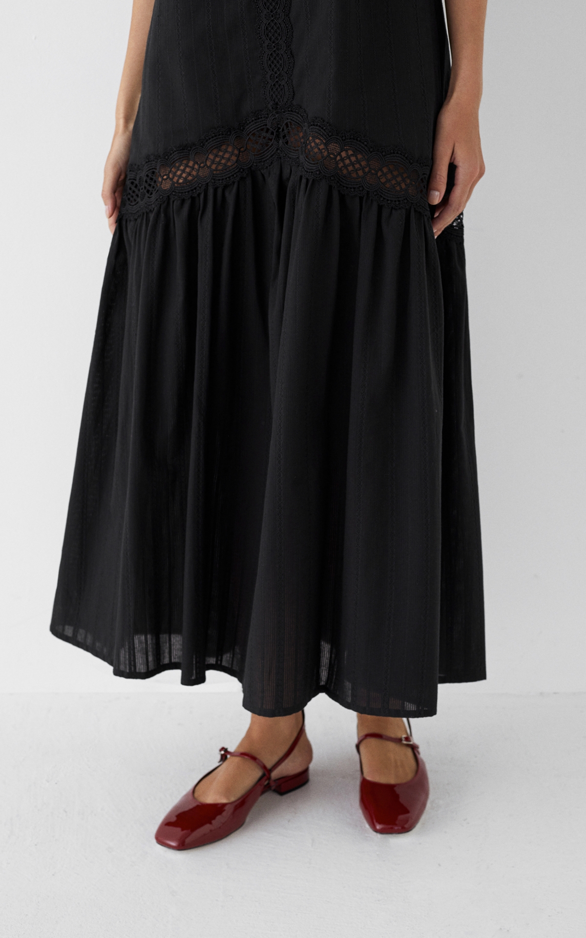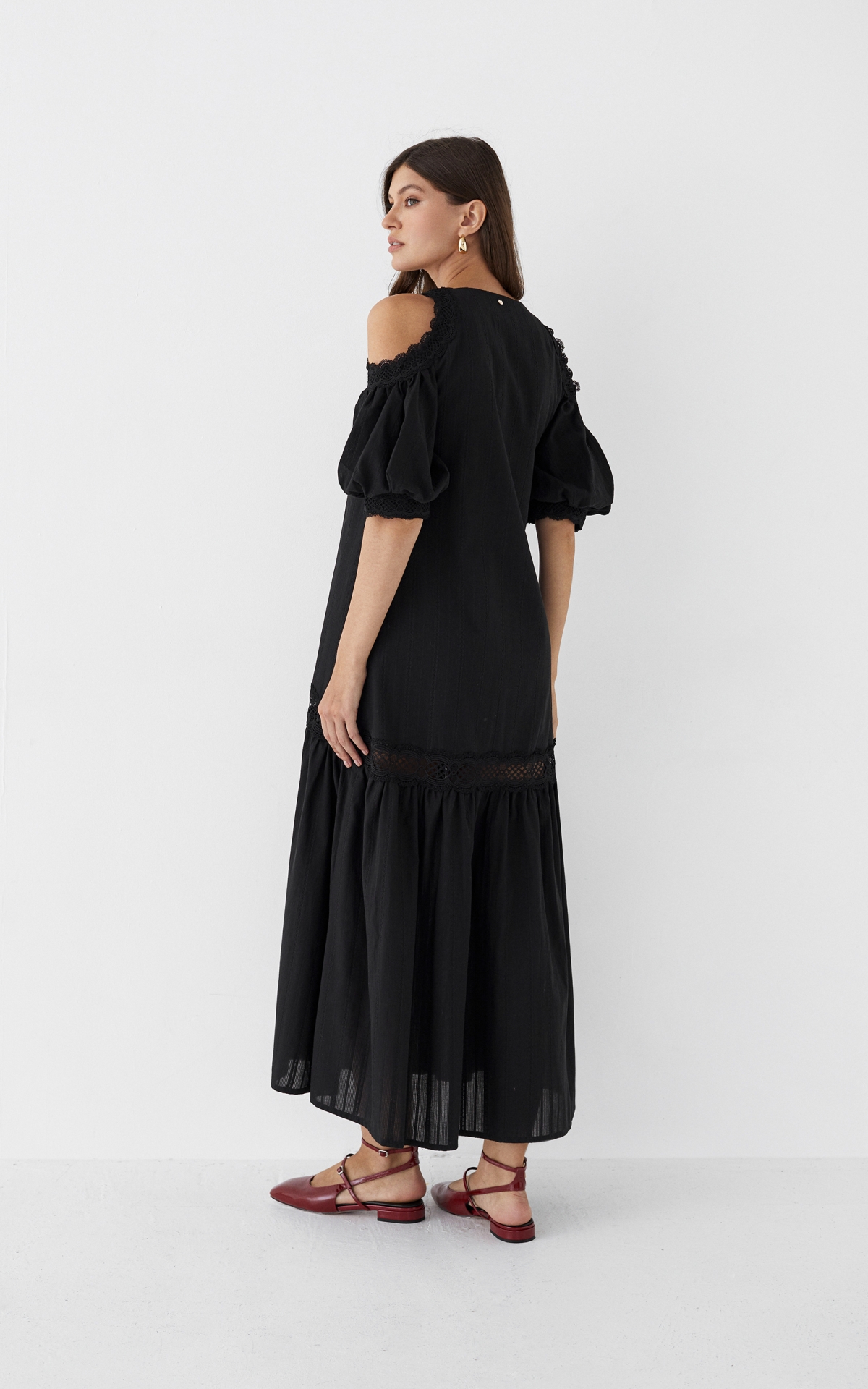 Воздушное платье-сарафан, декорированное орнаментальными рисунками, многоступенчатыми вышивками и прорезными узорами из 100% натурального хлопкового шитья отсылает нас к романтической эпохе 19 века. Такое платье будет универсальным решением для любого образа и типа фигуры за счет летящего, не облегающего силуэта и выверенного кроя. Комбинация разнообразных тканей разделена сложносочиненными тесьмами, которые расставляют необходимые акценты и скульптурируют фигуру. Объемный волан с множественными складками по нижнему срезу юбки и рукава-буфы с узкими манжетами на пуговицах и акцентными вырезами на плечах добавляют образу воздушность и особую романтичность. Платье продублировано подкладкой в цвет изделия, чтобы избежать просвечивания. Летом сочетайте платье с босоножками, а в холодное время года с казаками и объемной кожаной курткой