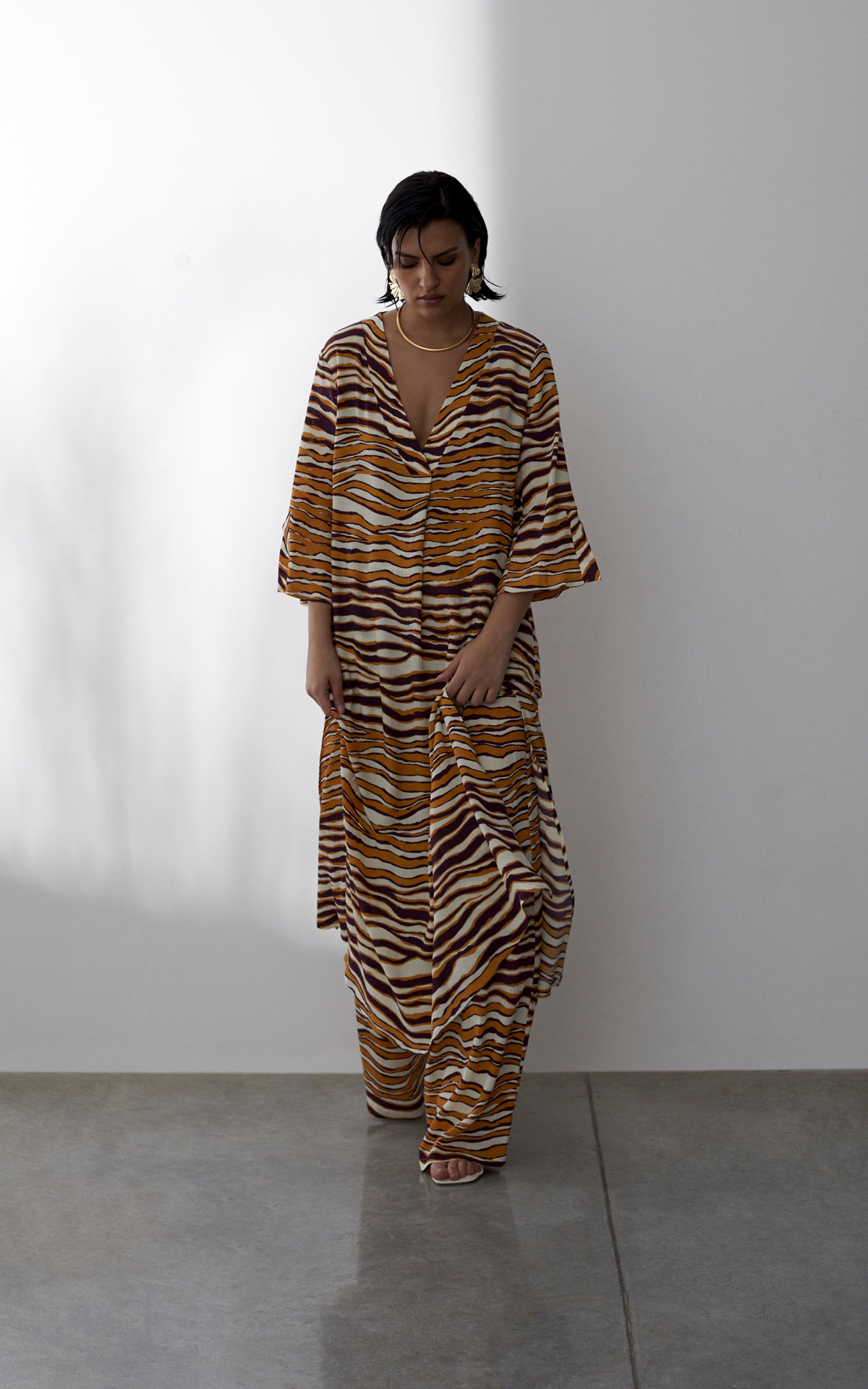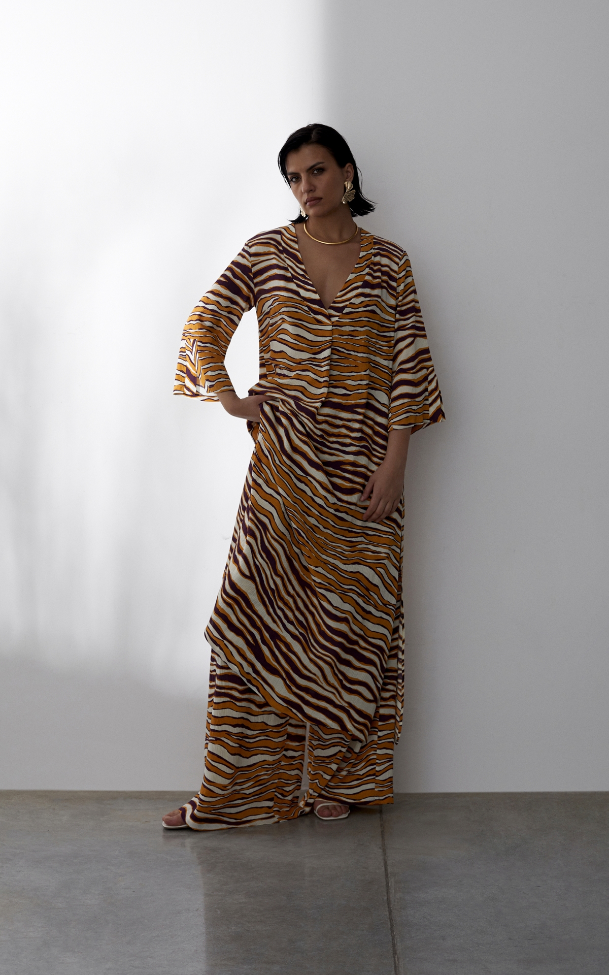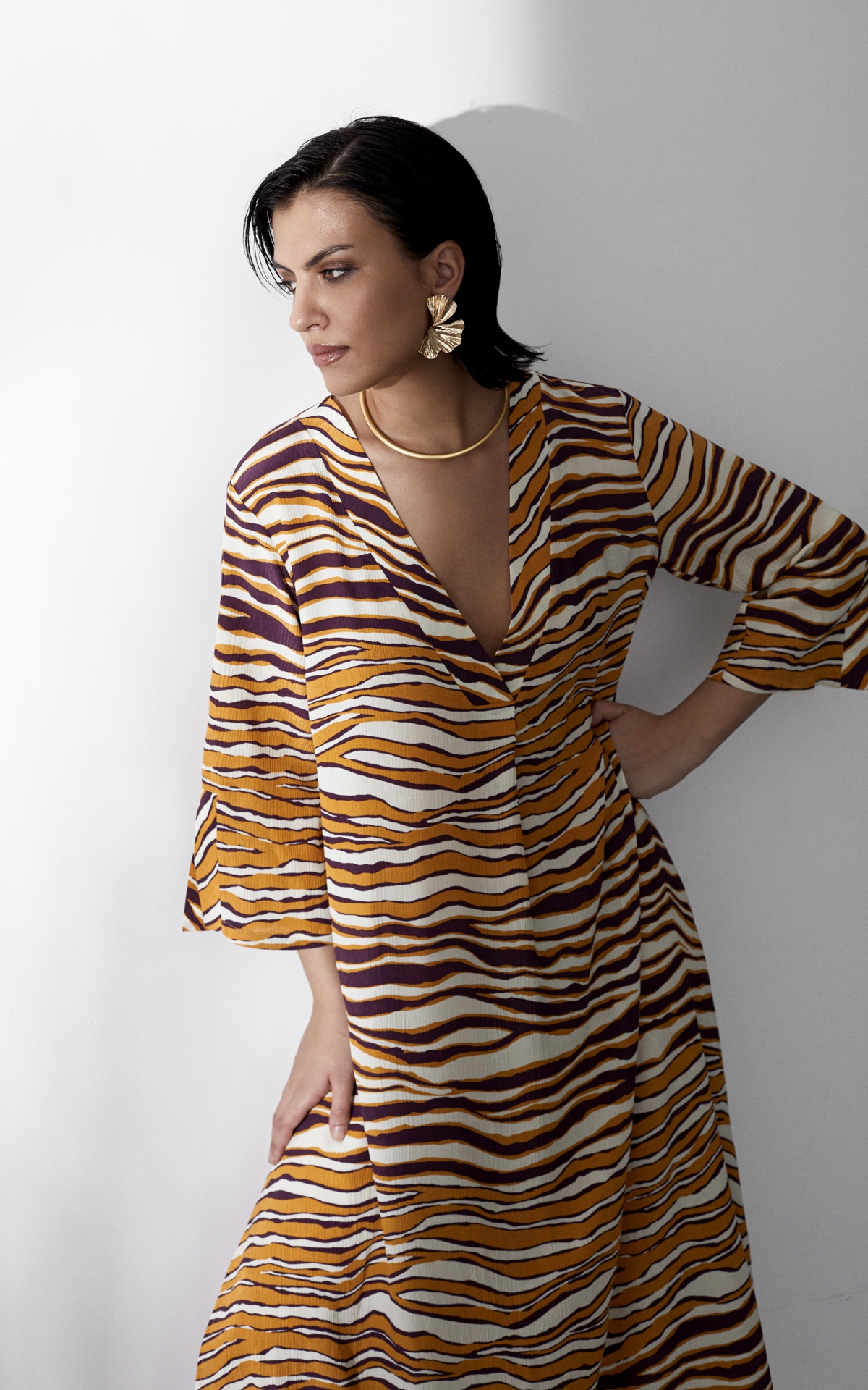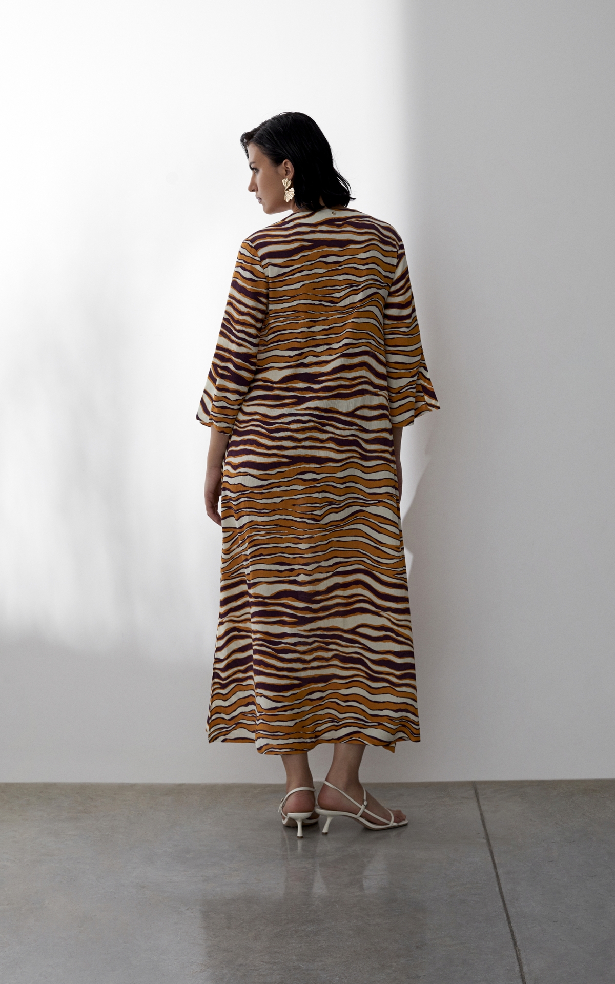Лаконичное платье выполнено из струящегося вискозного крепа с фактурным муаровым мотивом. Такое полотно отличается долговечностью, формоустойчивостью и уникальными дышащими свойствами - материал отлично впитывает влагу, обеспечивает хорошую циркуляцию и сохраняет оптимальный для тела микроклимат. Анималистичный тропический оранжево-бордовый принт, словно сошедший с диких джунглей, оживит не только отпускной, но и городской гардероб. Расклешенная форма рукавов длины 7/8 с углубленной проймой повторяет летящий расклешенный силуэт платья, декорированного широкими планками и высокими боковыми разрезами на подоле. Для создания эффектного total-look рекомендуем сочетать с брюками из капсулы.