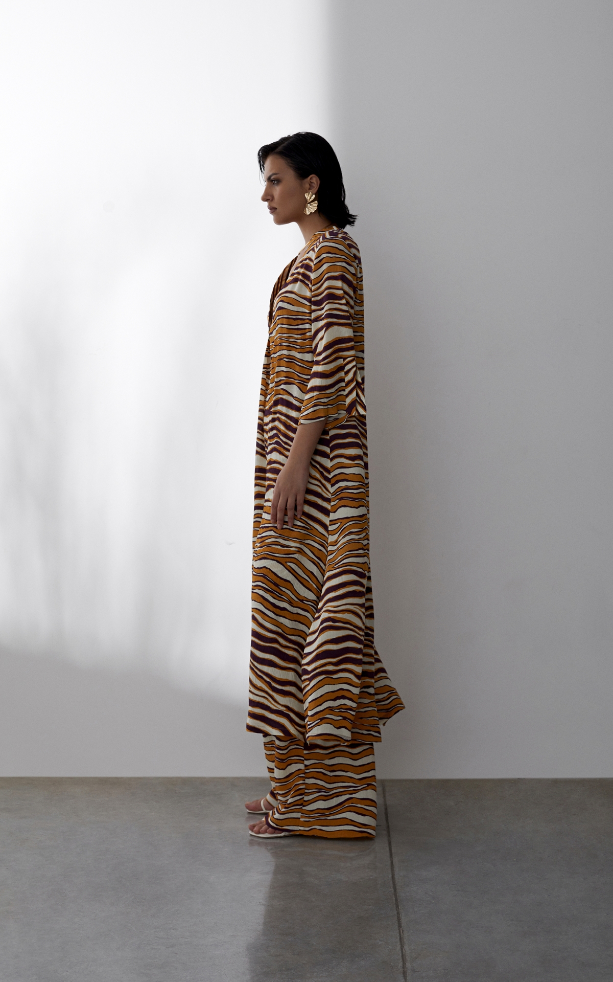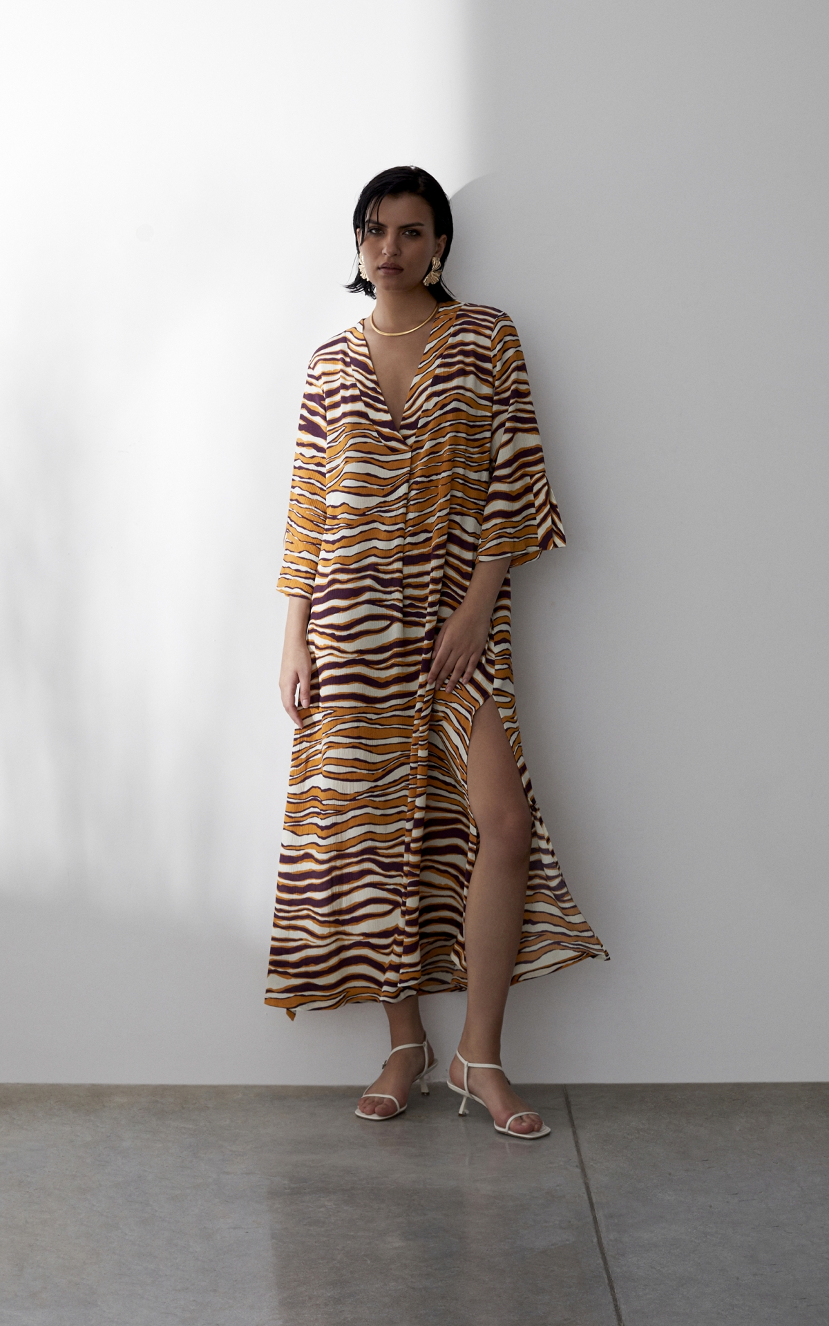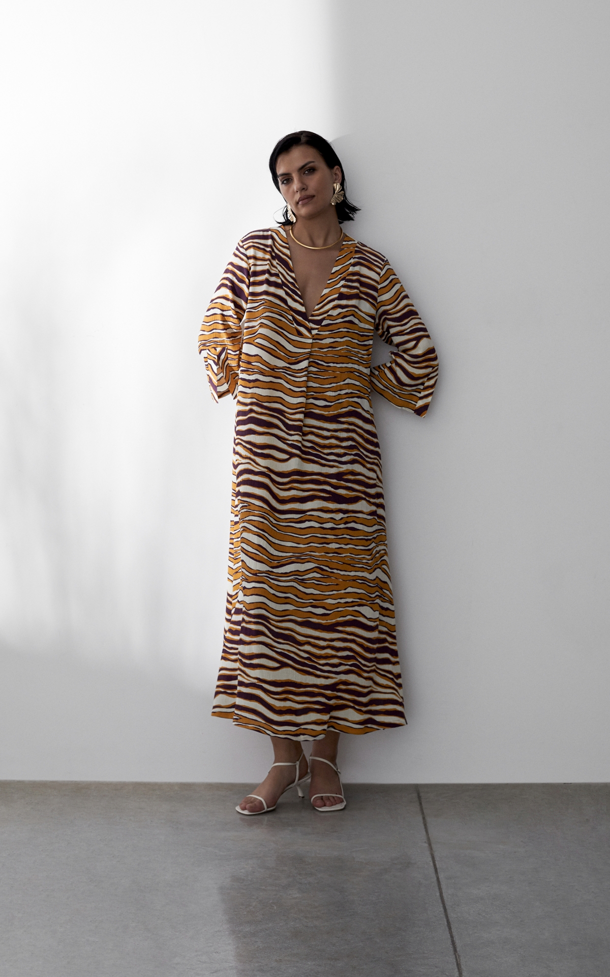 Лаконичное платье выполнено из струящегося вискозного крепа с фактурным муаровым мотивом. Такое полотно отличается долговечностью, формоустойчивостью и уникальными дышащими свойствами - материал отлично впитывает влагу, обеспечивает хорошую циркуляцию и сохраняет оптимальный для тела микроклимат. Анималистичный тропический оранжево-бордовый принт, словно сошедший с диких джунглей, оживит не только отпускной, но и городской гардероб. Расклешенная форма рукавов длины 7/8 с углубленной проймой повторяет летящий расклешенный силуэт платья, декорированного широкими планками и высокими боковыми разрезами на подоле. Для создания эффектного total-look рекомендуем сочетать с брюками из капсулы.