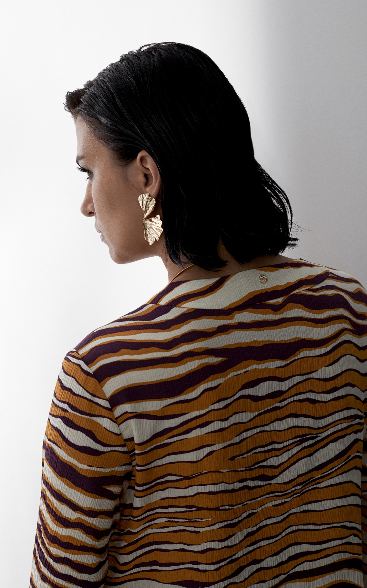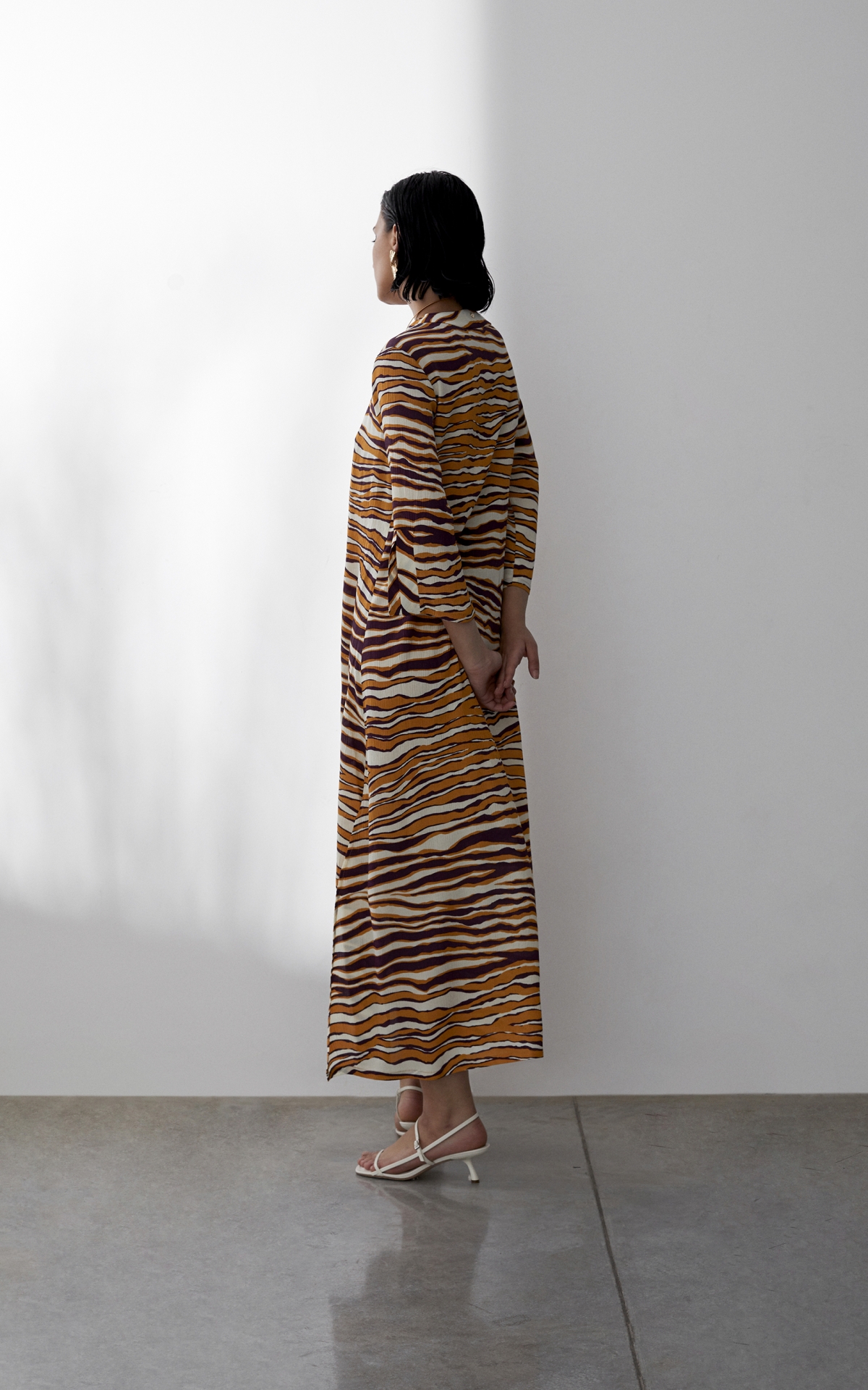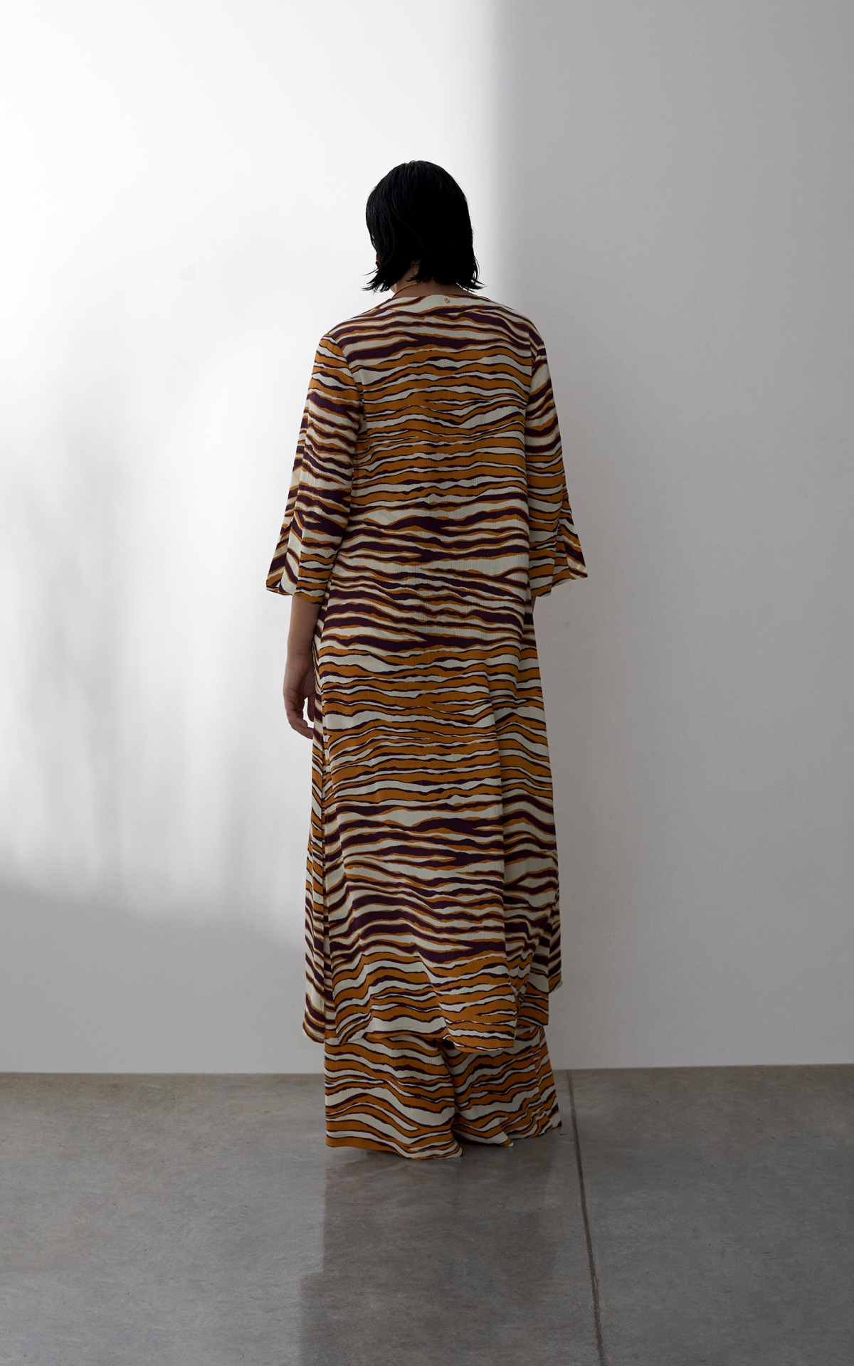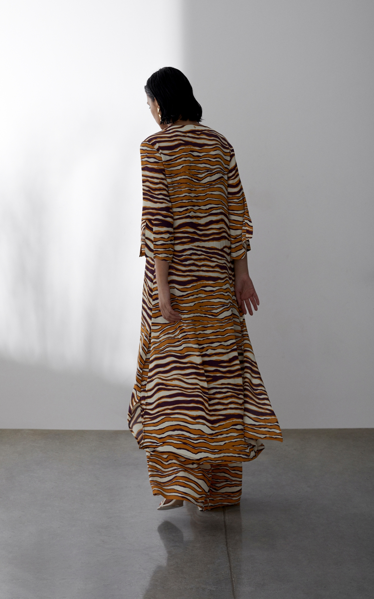 Лаконичное платье выполнено из струящегося вискозного крепа с фактурным муаровым мотивом. Такое полотно отличается долговечностью, формоустойчивостью и уникальными дышащими свойствами - материал отлично впитывает влагу, обеспечивает хорошую циркуляцию и сохраняет оптимальный для тела микроклимат. Анималистичный тропический оранжево-бордовый принт, словно сошедший с диких джунглей, оживит не только отпускной, но и городской гардероб. Расклешенная форма рукавов длины 7/8 с углубленной проймой повторяет летящий расклешенный силуэт платья, декорированного широкими планками и высокими боковыми разрезами на подоле. Для создания эффектного total-look рекомендуем сочетать с брюками из капсулы.