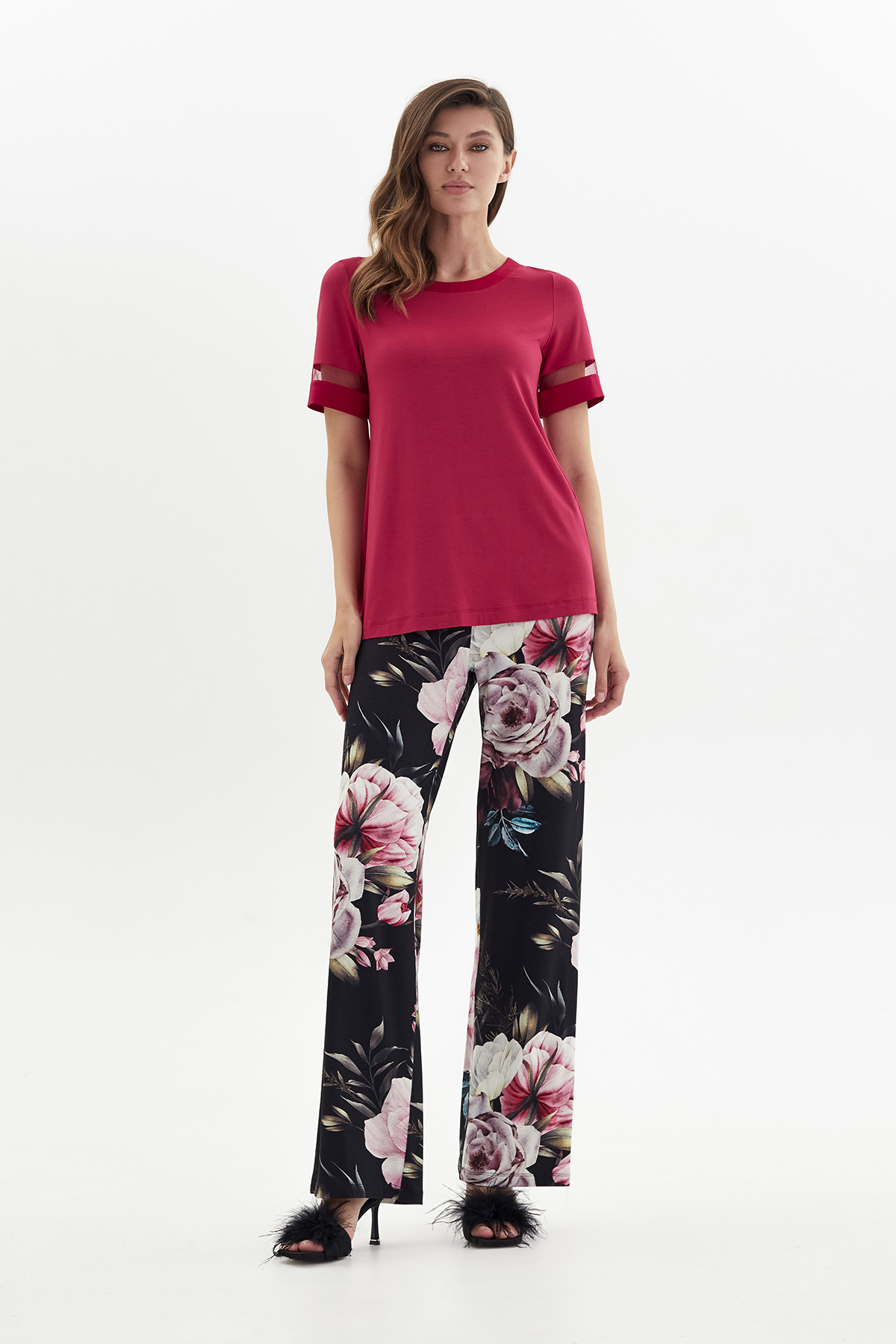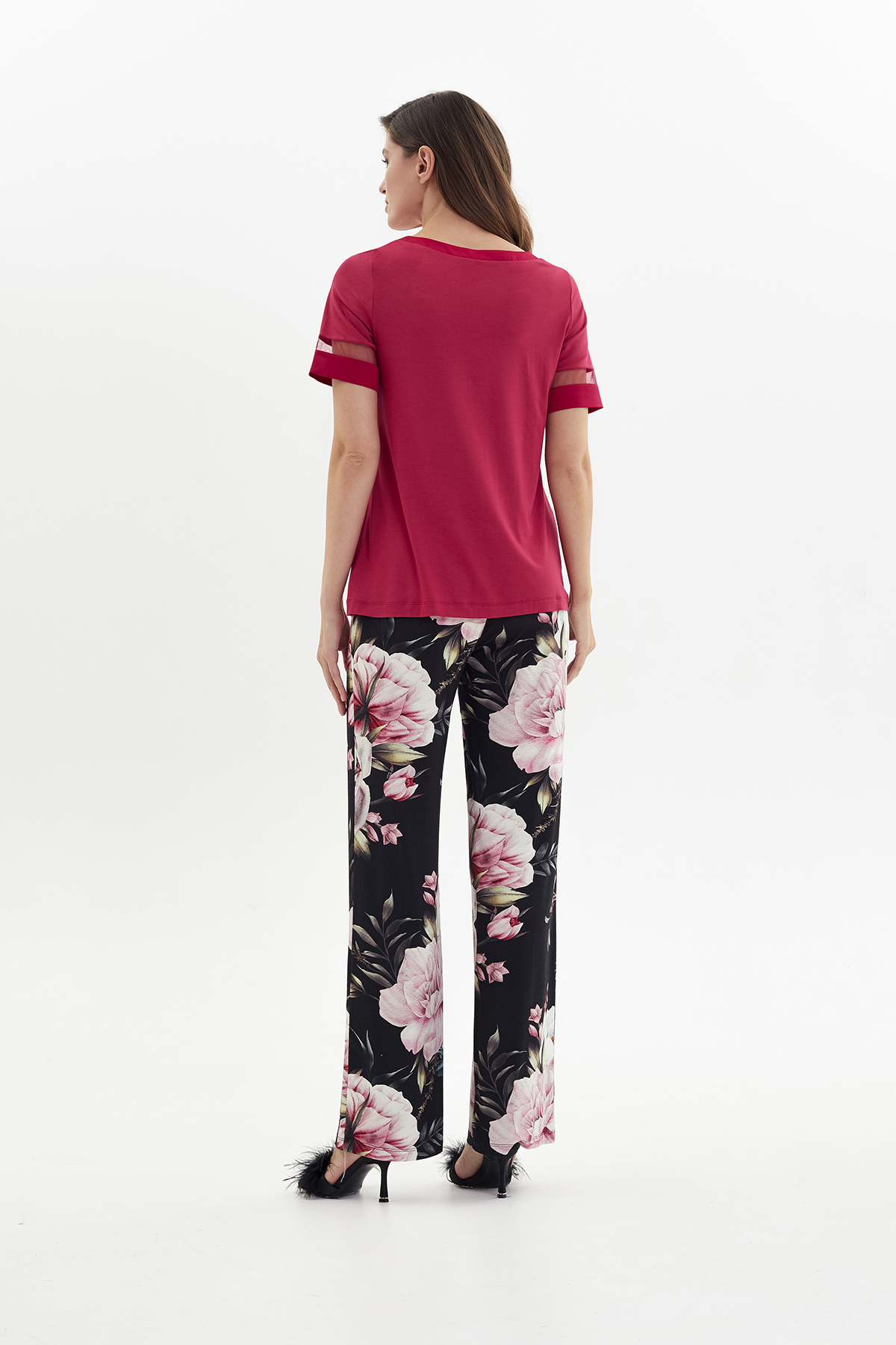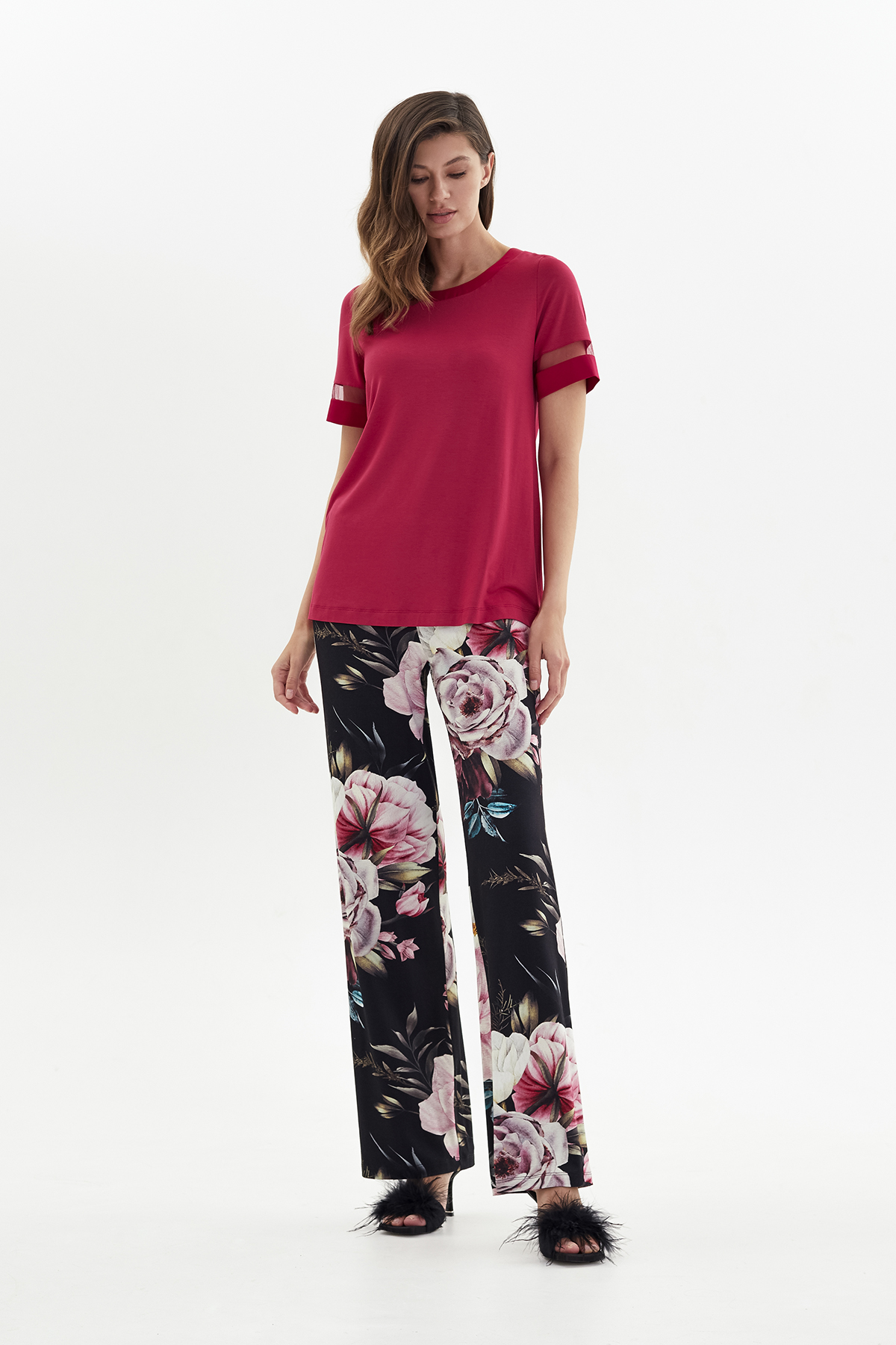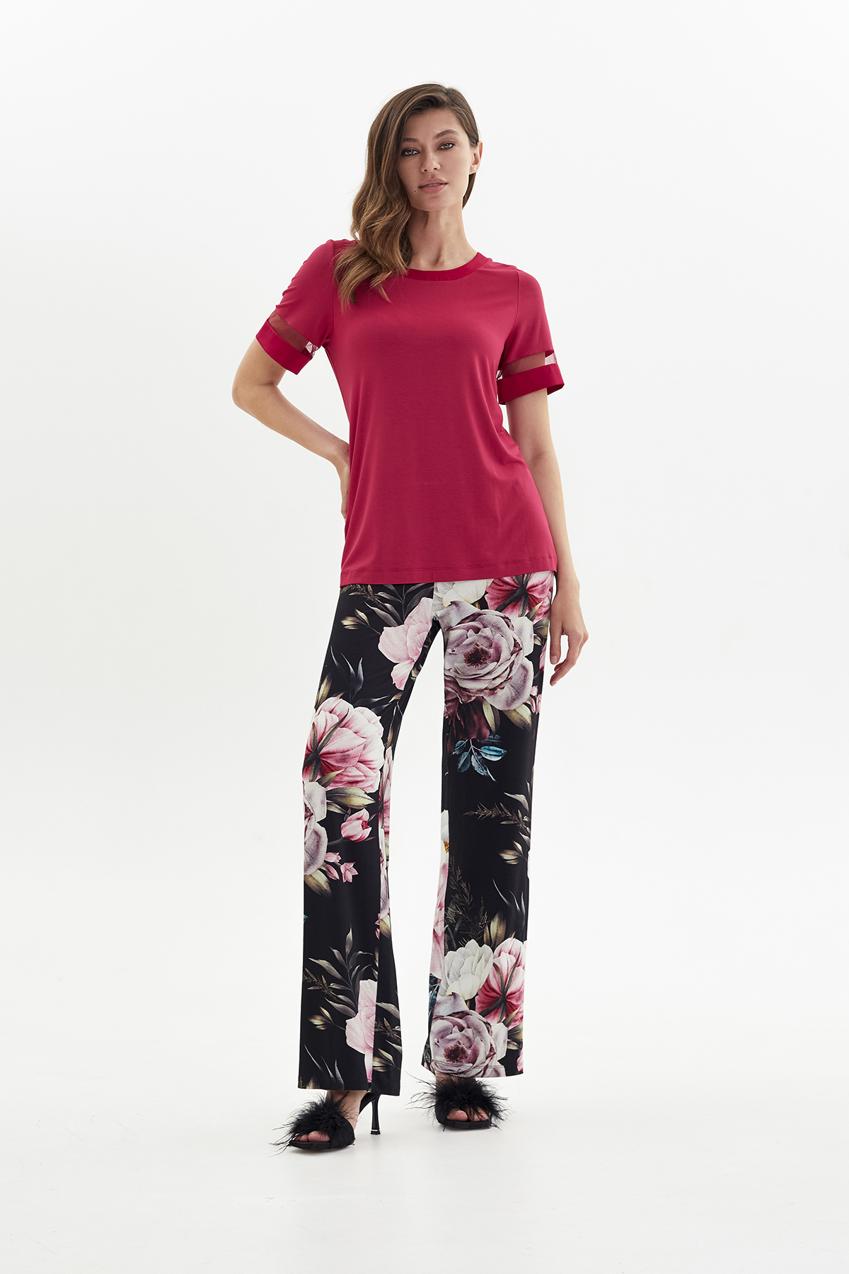 Пижама с брюками из вискозы бордовые пионы (52040)