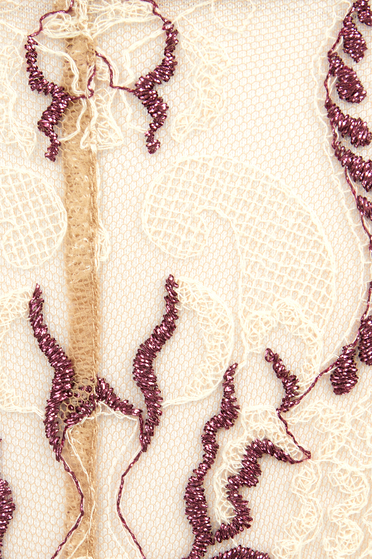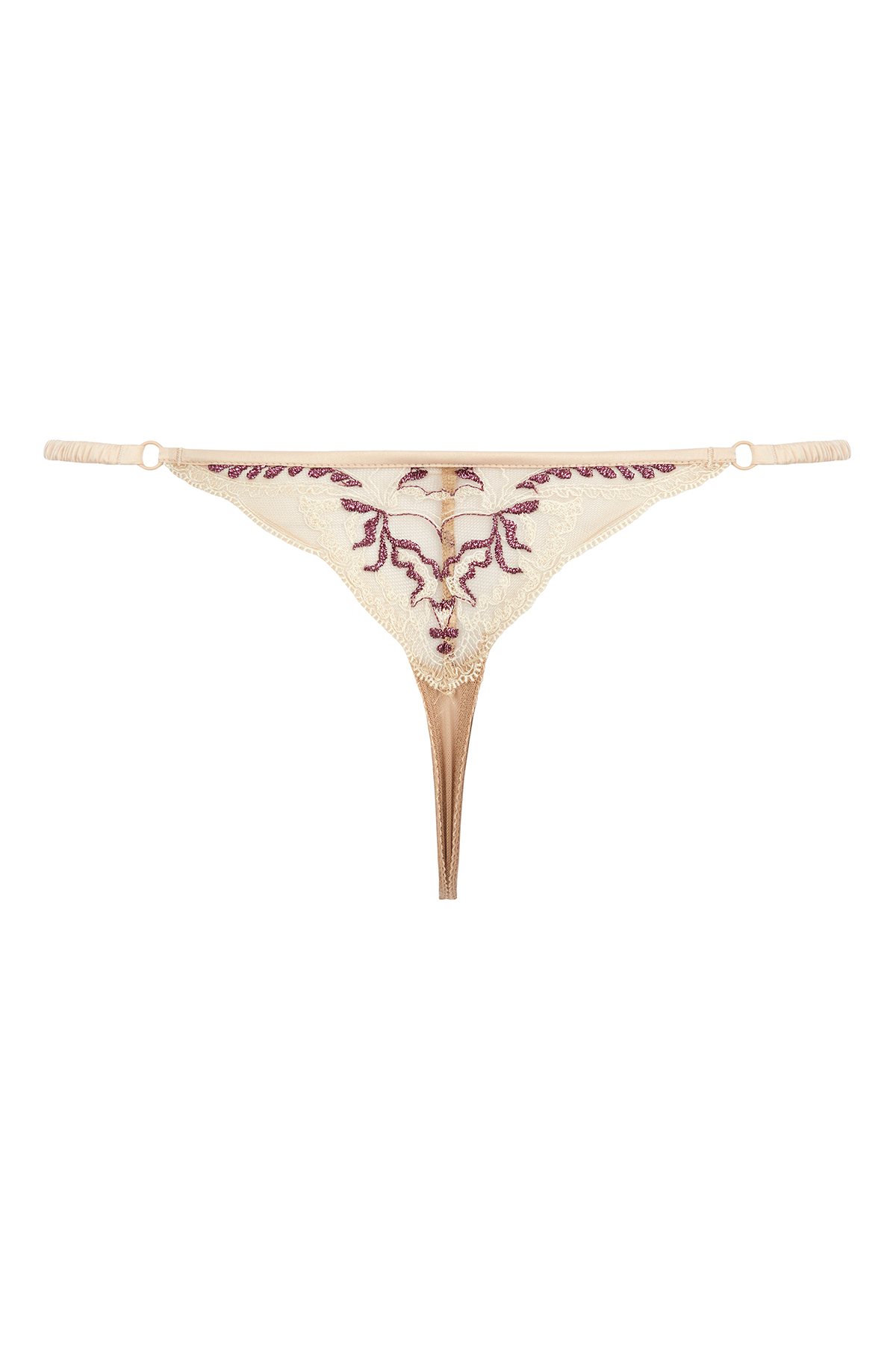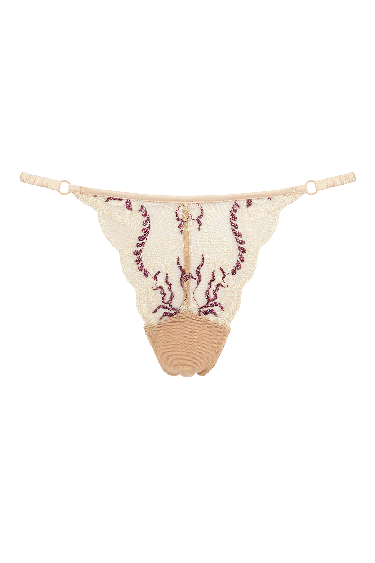 Пикантная модель трусиков стринг в нежном цвете обжаренного миндаля выполнена из тонкой сетки с кружевной флористической вышивкой Havana’s (Франция) с фестончатым краем и элементами контрастной люрексной нити. Легкий цветочный орнамент в светлой нитке, оживлен нежными мотивами цвета бордо с легким блеском. Удобная посадка и мягкое облегание на тонких резинках, продетых в маленькие колечки и декорированных золотым атласным полотном со сборками, позволит чувствовать себя уверенно и соблазнительно. Дополните повседневный образ бюстом moon-half, а комплект для особых случаев завершит пояс из этой линейки.