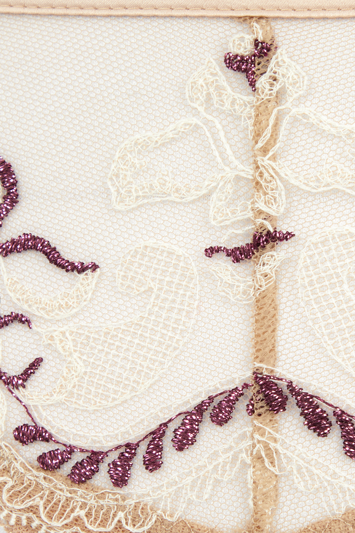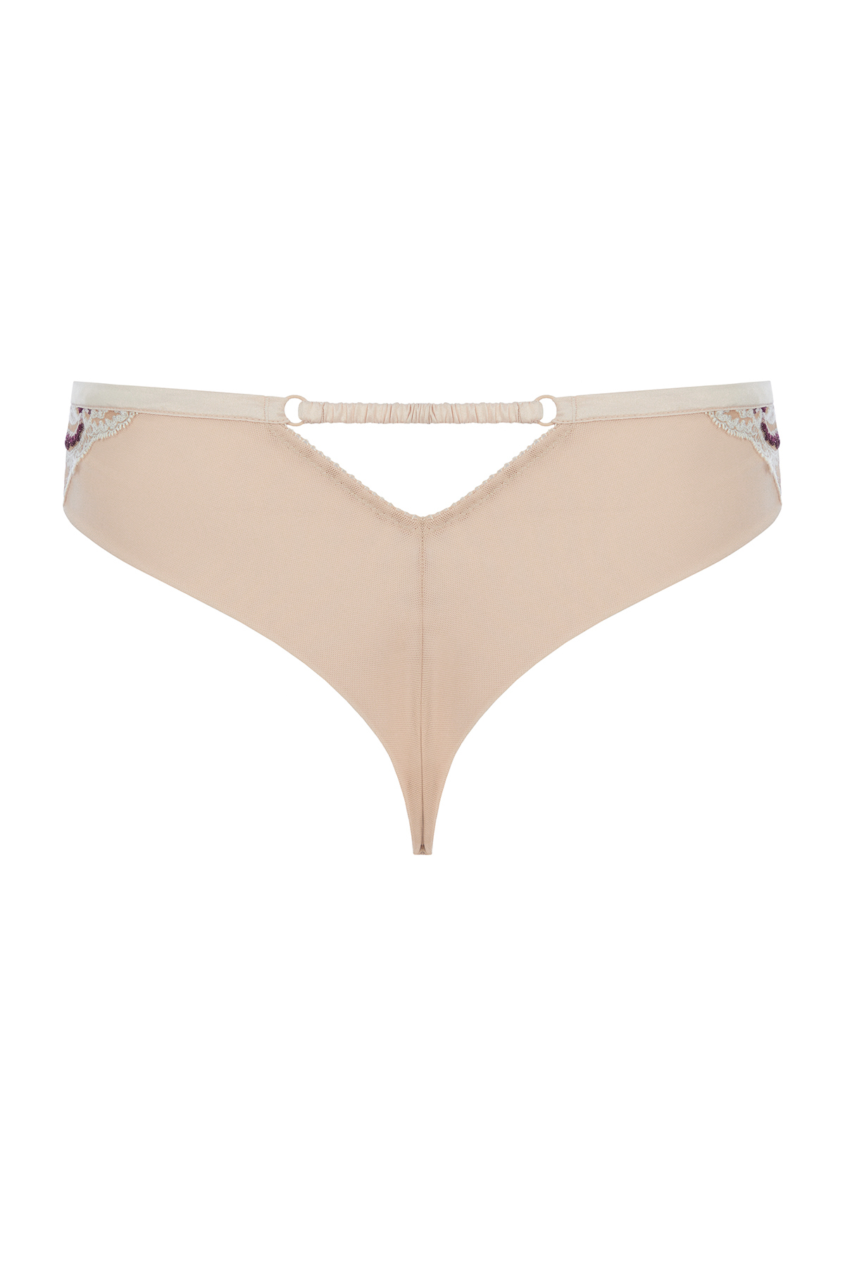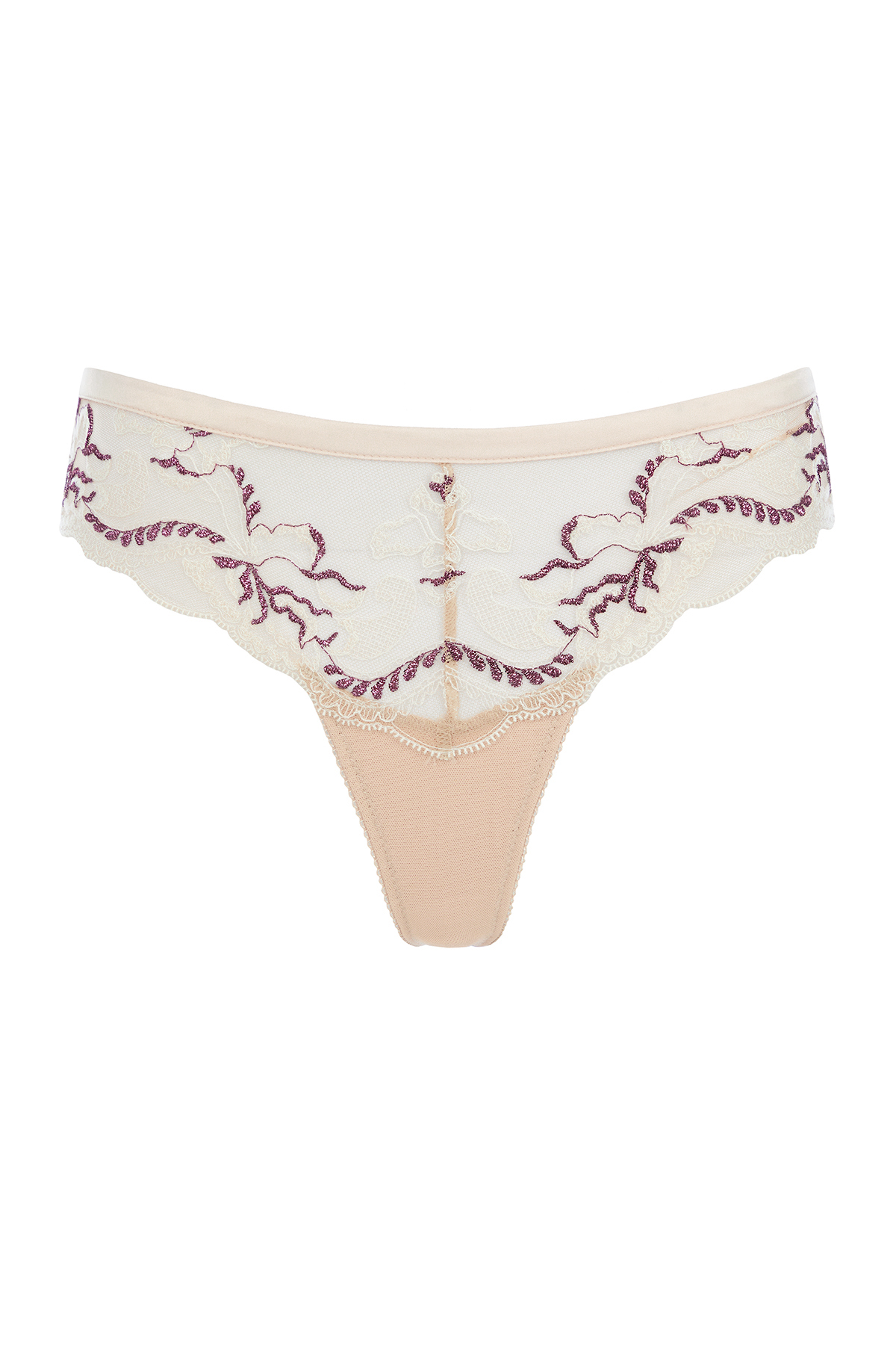 Привлекательная модель закрытых трусиков стринг в нежном цвете обжаренного миндаля выполнена из тонкой сетки с кружевной флористической вышивкой Havana’s (Франция) и элементами контрастной люрексной нити. Легкий цветочный орнамент в светлой нитке, оживлен нежными мотивами цвета бордо с легким блеском. Двойная сетка на задней детали, выполненная в бесшовной технике, придает трусикам мягкое облегание и не дает эффекта перетяжки ягодиц, подчеркивая чувственные формы. У талии модель окантована золотым атласным полотном, прерываясь на пикантный вырез, декорированный колечками и тонкой резинкой со сборками.