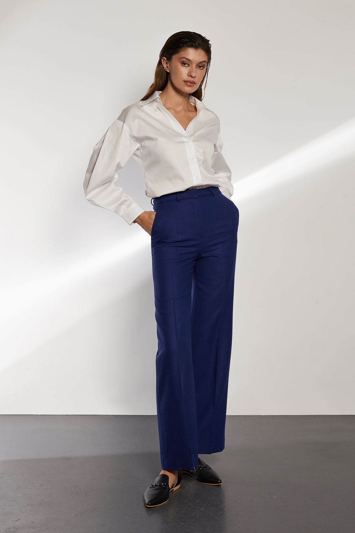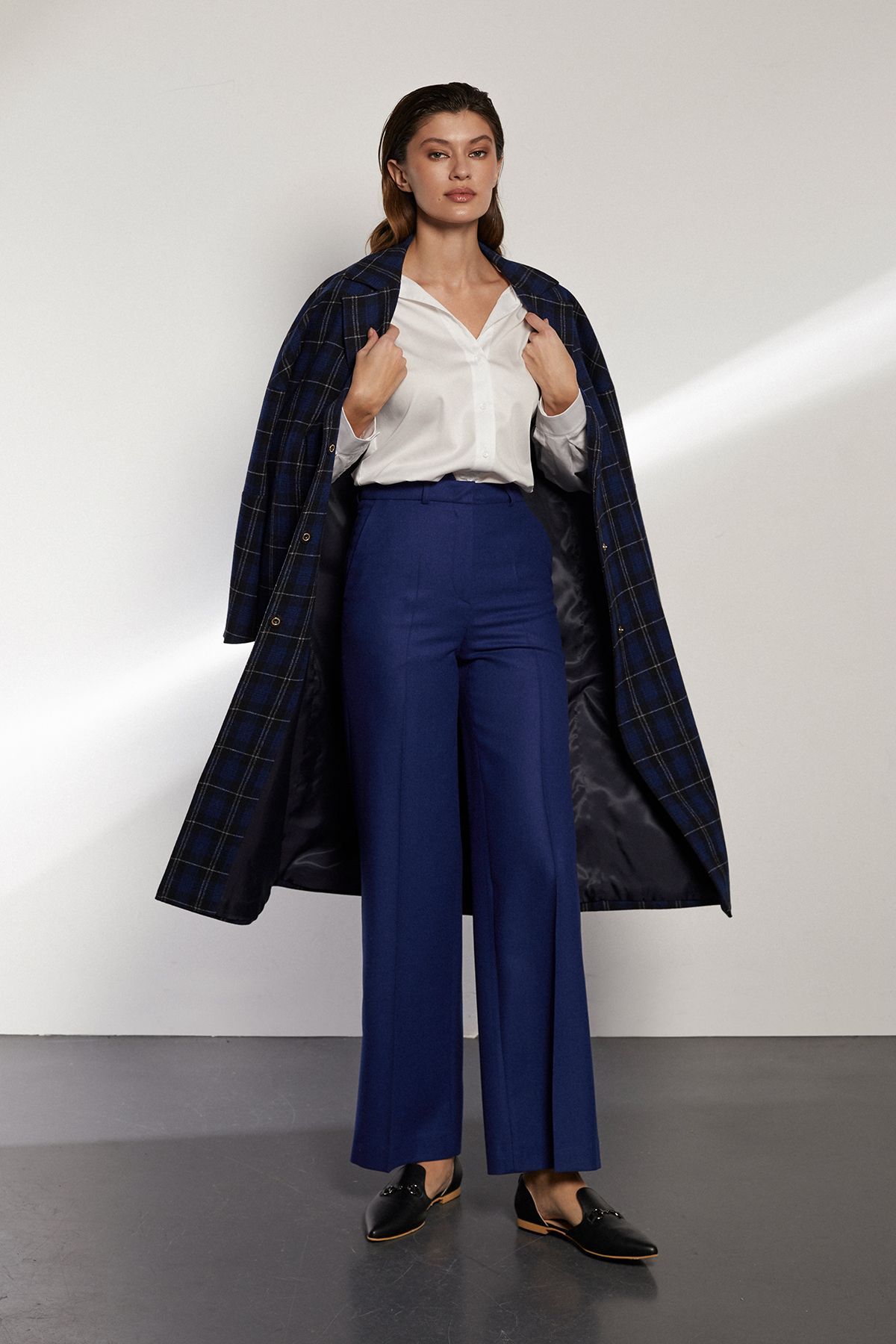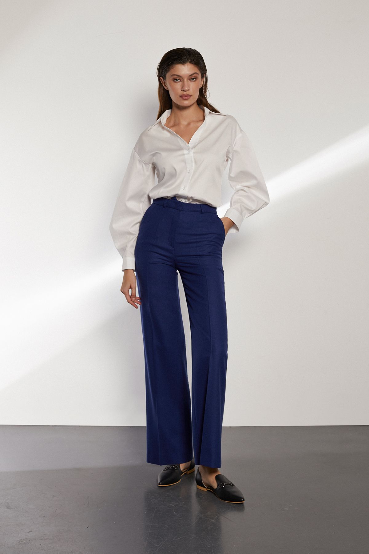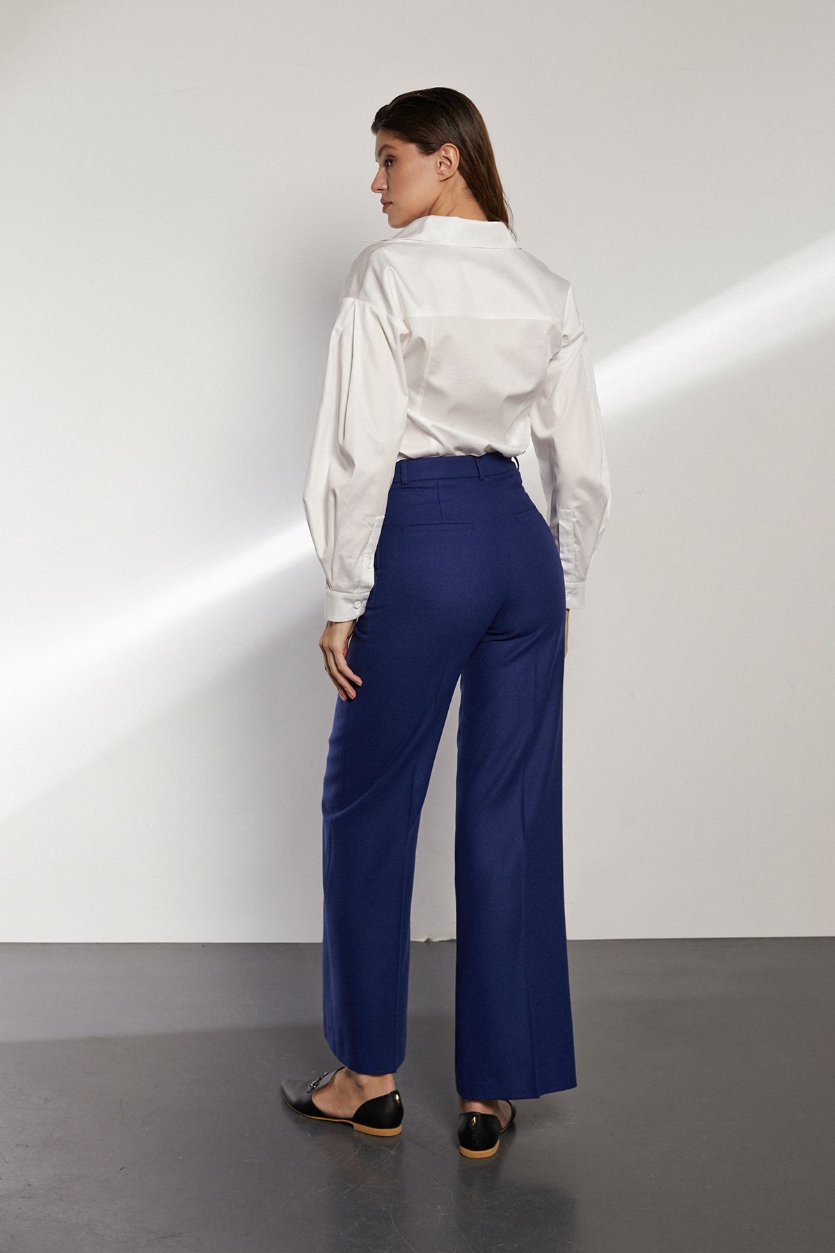 Брюки имеют облегающий силуэт с завышенной посадкой, не сковывающей движений и фронтальные стрелки, которые придают модели структурную форму и визуально вытягивают фигуру.