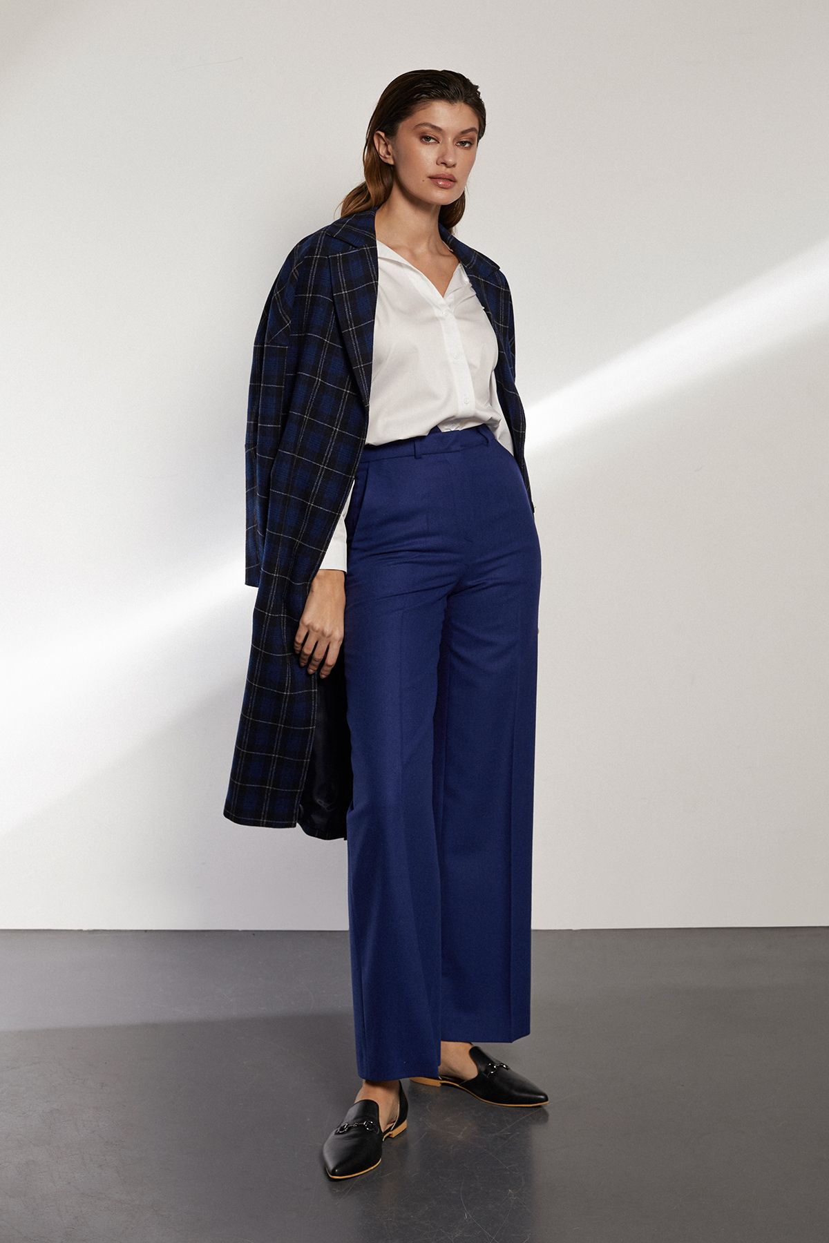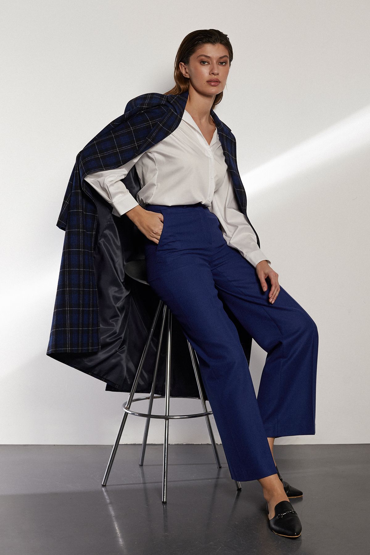 Прямые брюки уместны не только в деловом гардеробе, но и будут отлично дополнять объемное худи или расслабленный джемпер. Предлагаем сочетать с футболкой rib в цвете холодный бежевый и дополнить сопутствующим жакетом в синюю клетку из капсулы для яркого образа