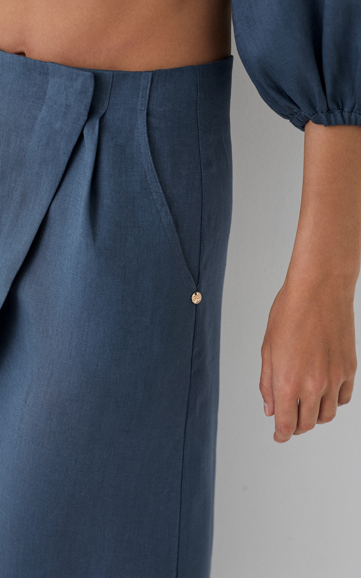 Аутентичная юбка миди прямого силуэта трендового джинсового оттенка позволит чувствовать себя роскошно как на прогулке по морскому побережью, так и в суете еду на шумных улицах мегаполиса. Мы выполнили ее из 100% дышащего невесомого льна, который отлично пропускает воздух и слегка охлаждает кожу, мягко драпируется и создает красивый эффект переливов на солнце. Ассиметричный крой и высокий боковой разрез - как смелый акцент, который смещает фокус со строгого образа в сторону модного кэжуала. Завышенная талия со скрытым поясом дополнена вытачками, отвечающими за комфортную посадку по фигуре и защипами, формирующими силуэт. Модель застегивается на потайные пуговицы. Рекомендуем сочетать с топом или рубашкой из льняной капсулы.